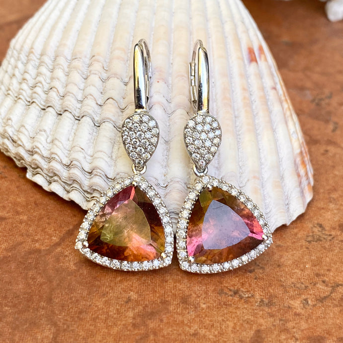 14KT White Gold Pave Diamond + Bi-Color Trillion Tourmaline Lever Back Earrings