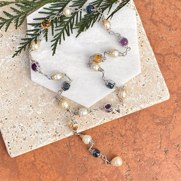 14KT White Gold Paspaley Pearl, Citrine, Amethyst + Blue Topaz Station Lariat Necklace