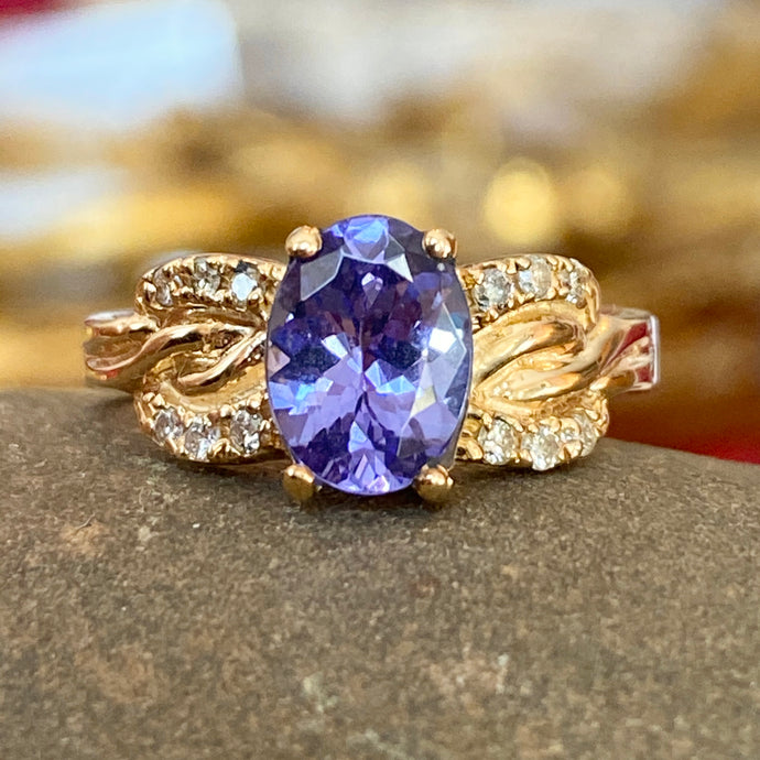 Estate 14KT Yellow Gold Oval 1.25 CT Tanzanite + Diamond Detailed Ring