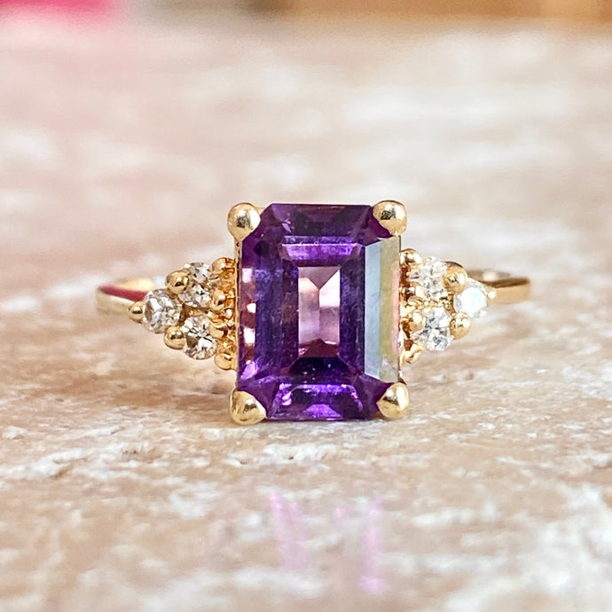 14KT Yellow Gold Emerald-Cut Purple Amethyst + Diamond Ring