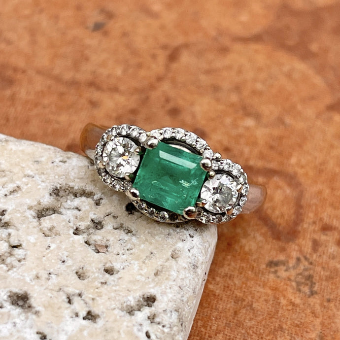 Estate 18KT White Gold Emerald + Diamond 3 Stone Halo Ring