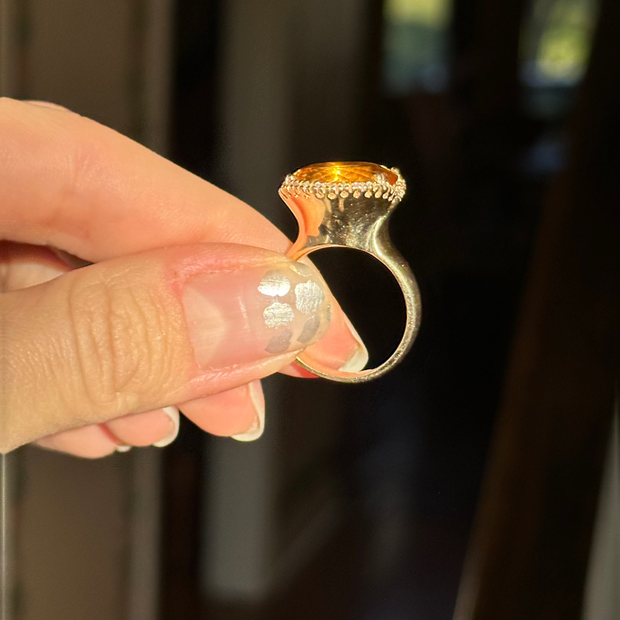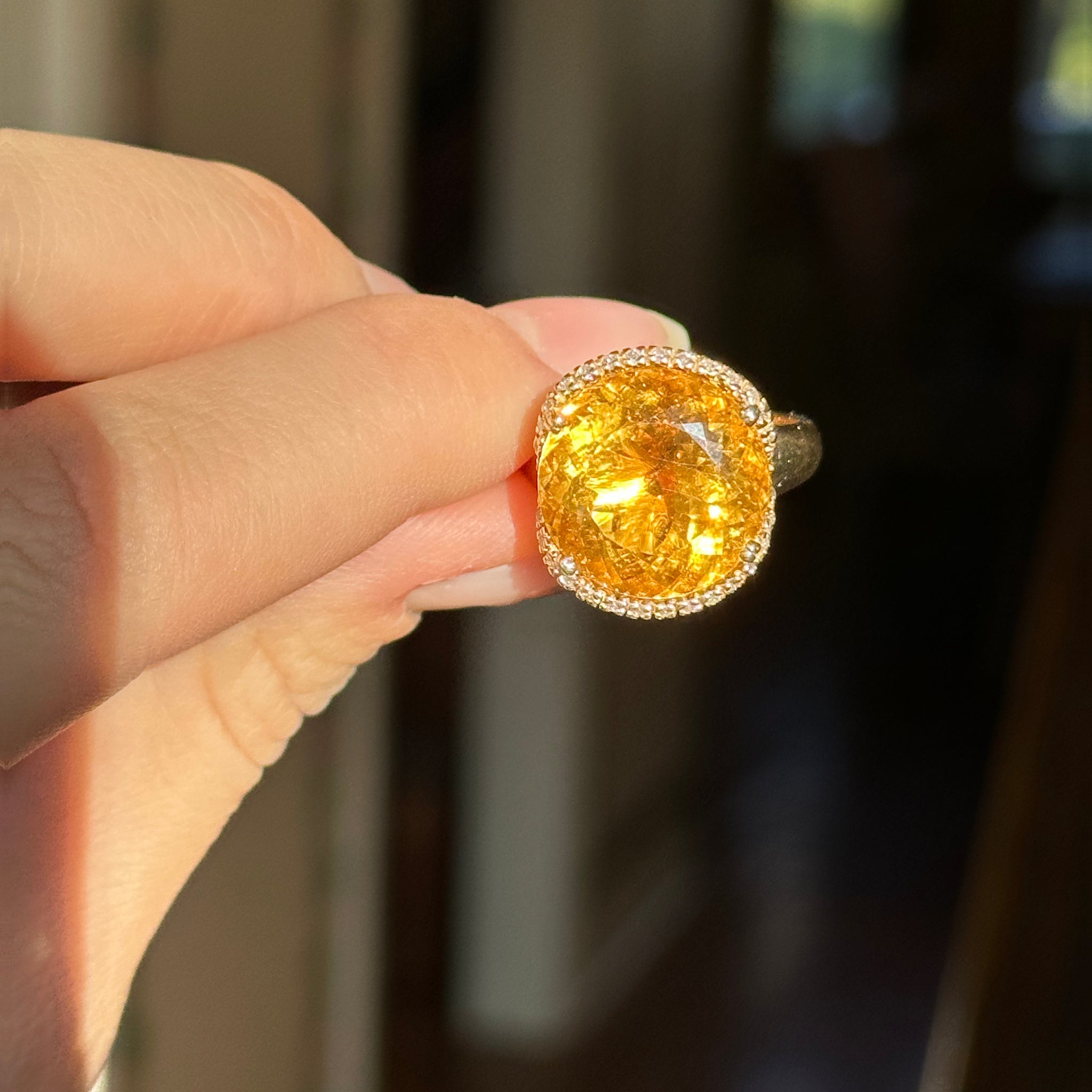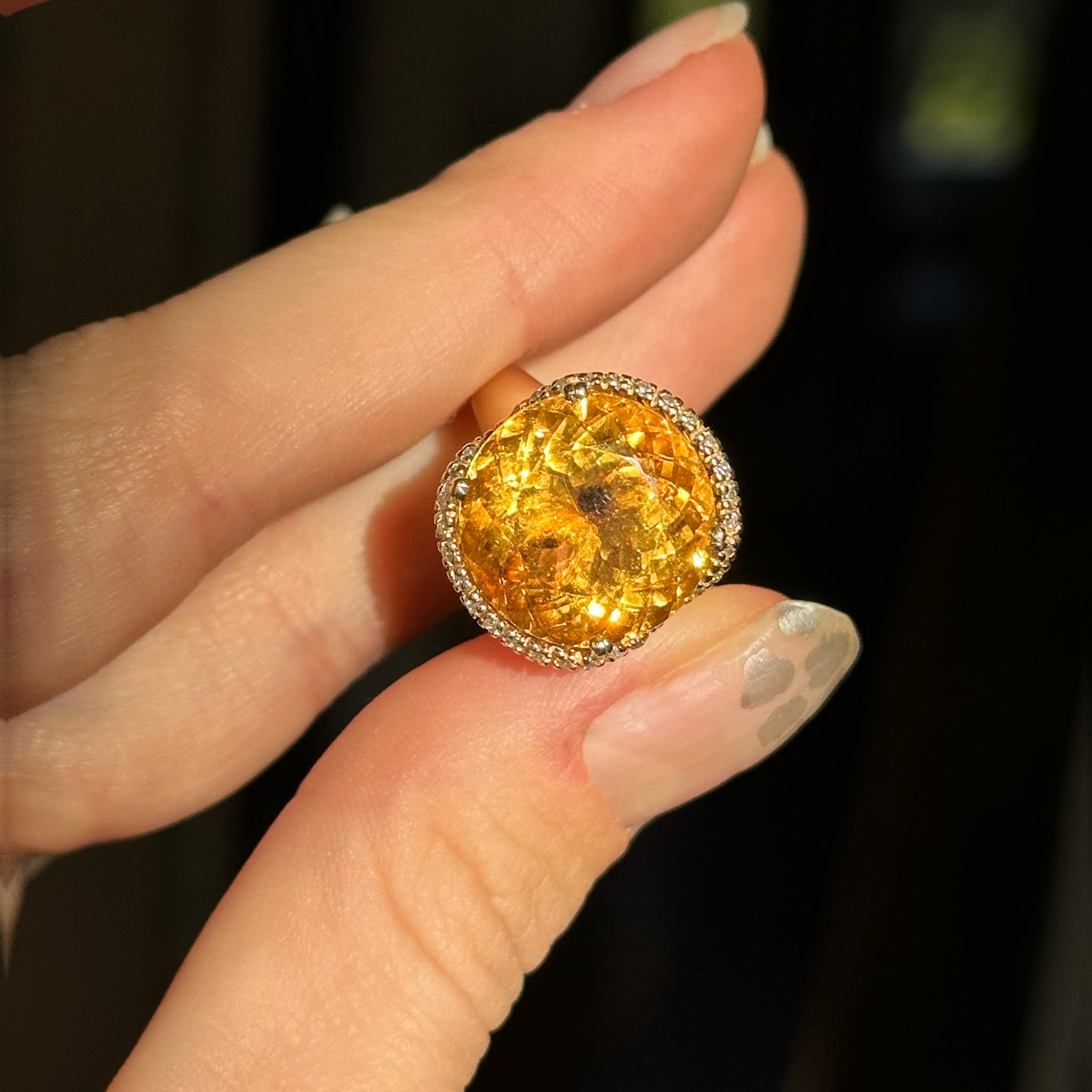Estate/ vintage 14KT yellow gold halo style ring with round, faceted, genuine, large citrine gemstone and diamonds.