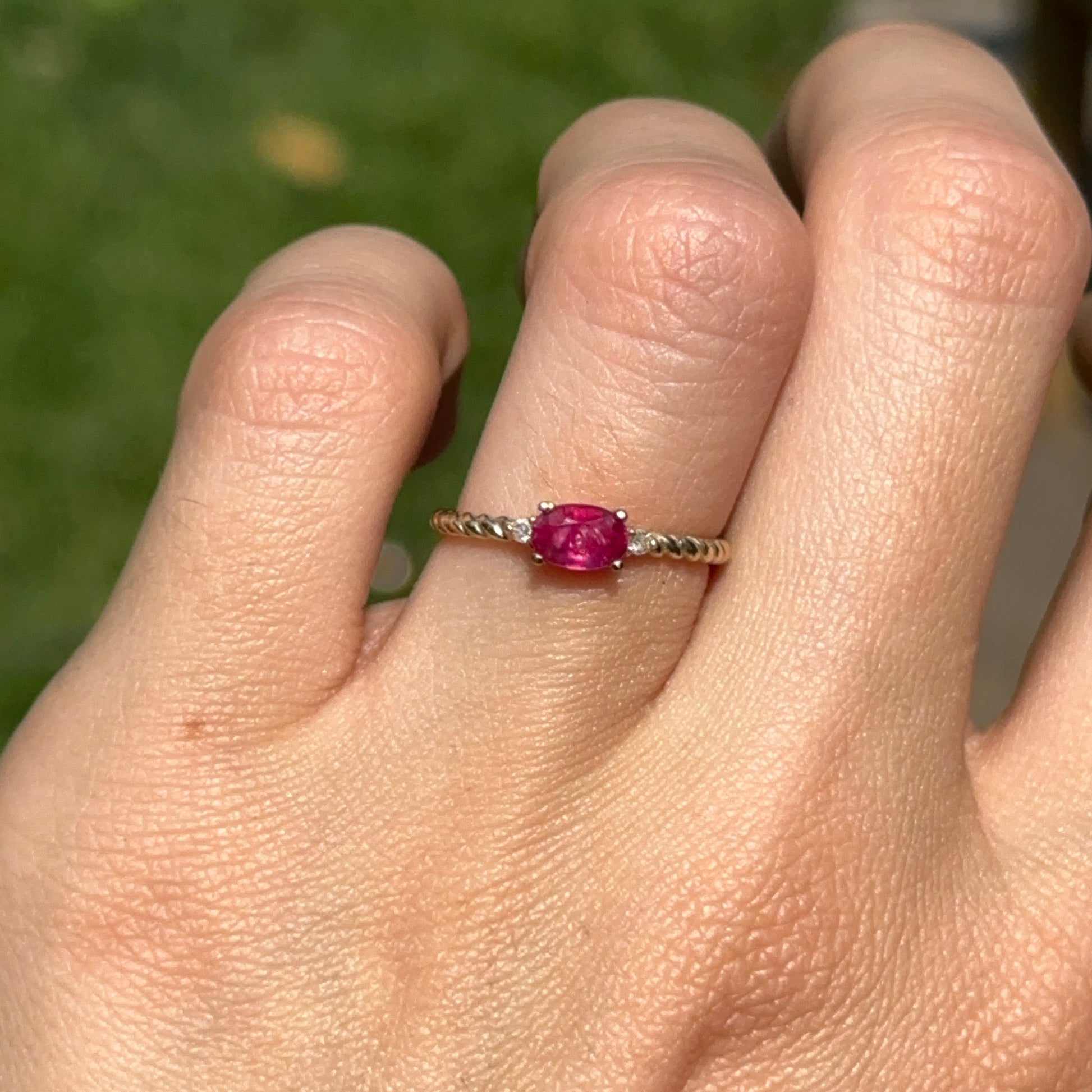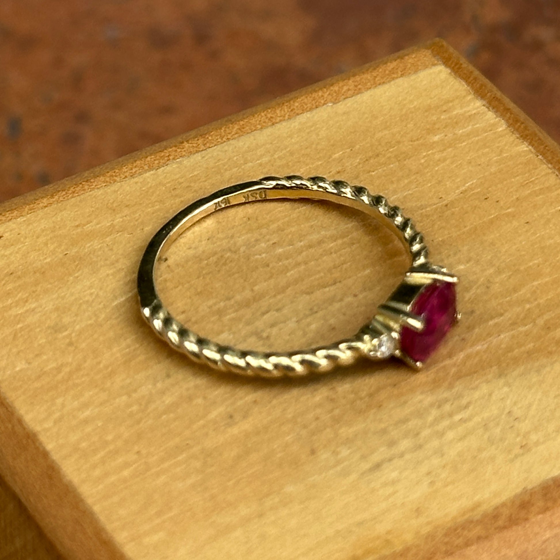10KT Yellow Gold Oval Ruby + Round Diamond Twisted Design Ring