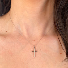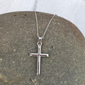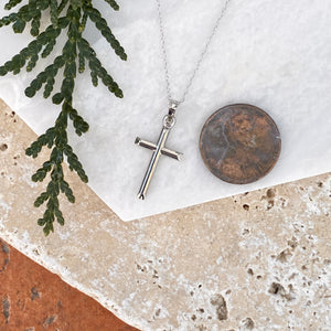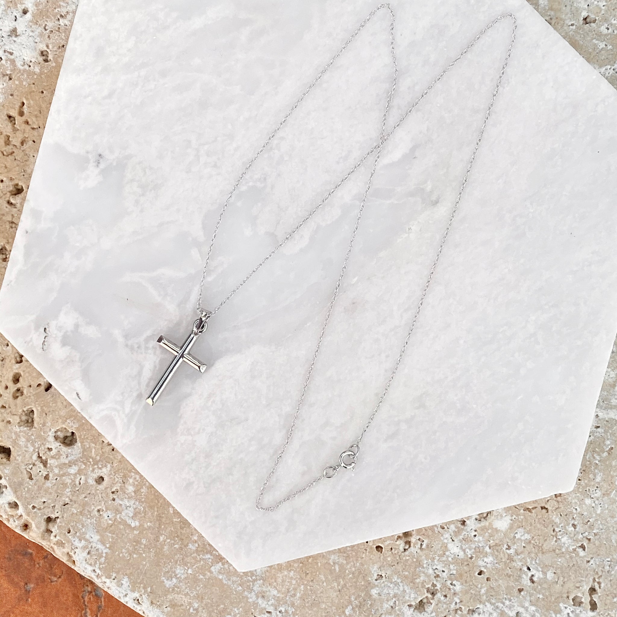 10KT white gold small, plain cross pendant charm on a thin, 10KT white gold cable chain necklace. Lightweight, classic cross necklace perfect for everyday wear! Makes a special gift.