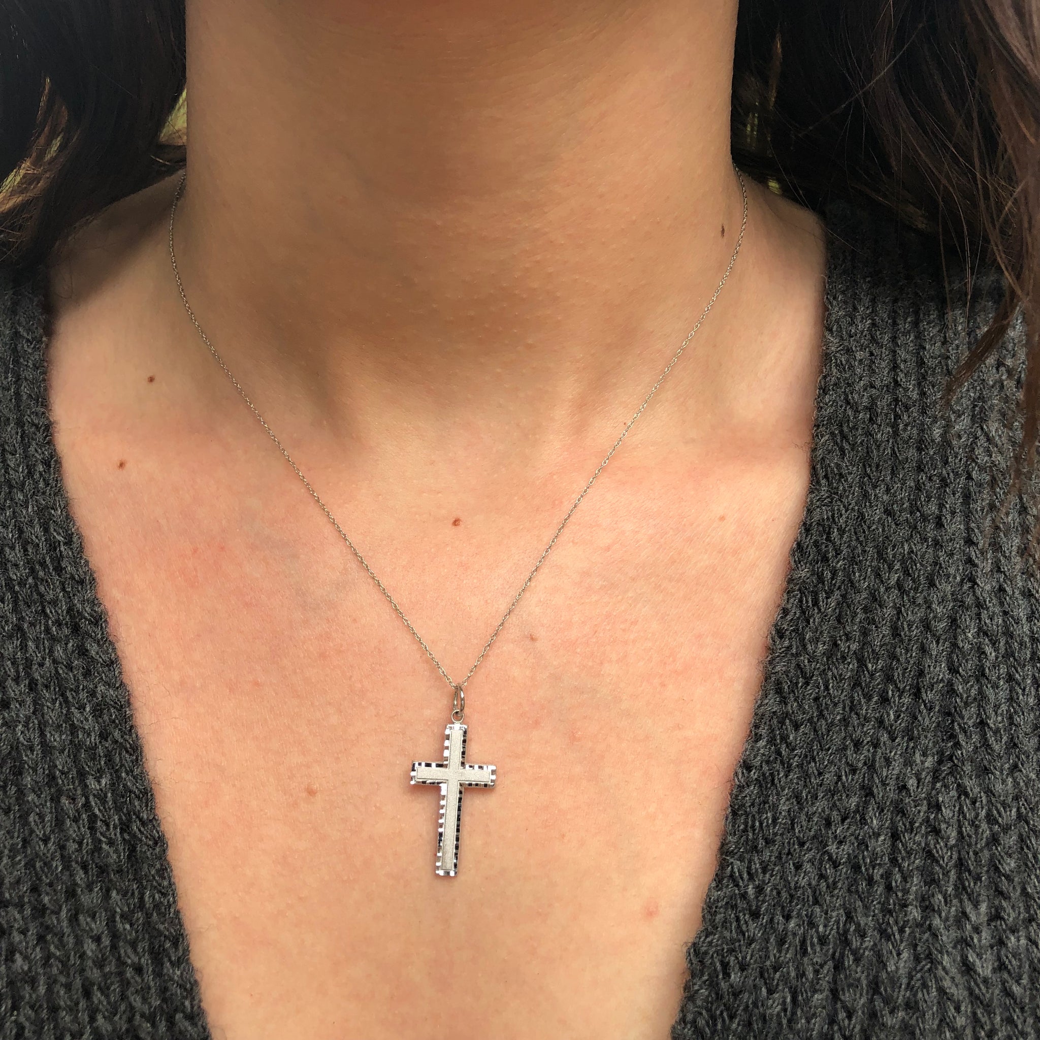 10KT white gold intricate detailed cross pendant charm with shiny, diamond-cut edges + matte center finish. Pretty charm would be a great addition to a charm bracelet or worn alone on a chain.