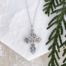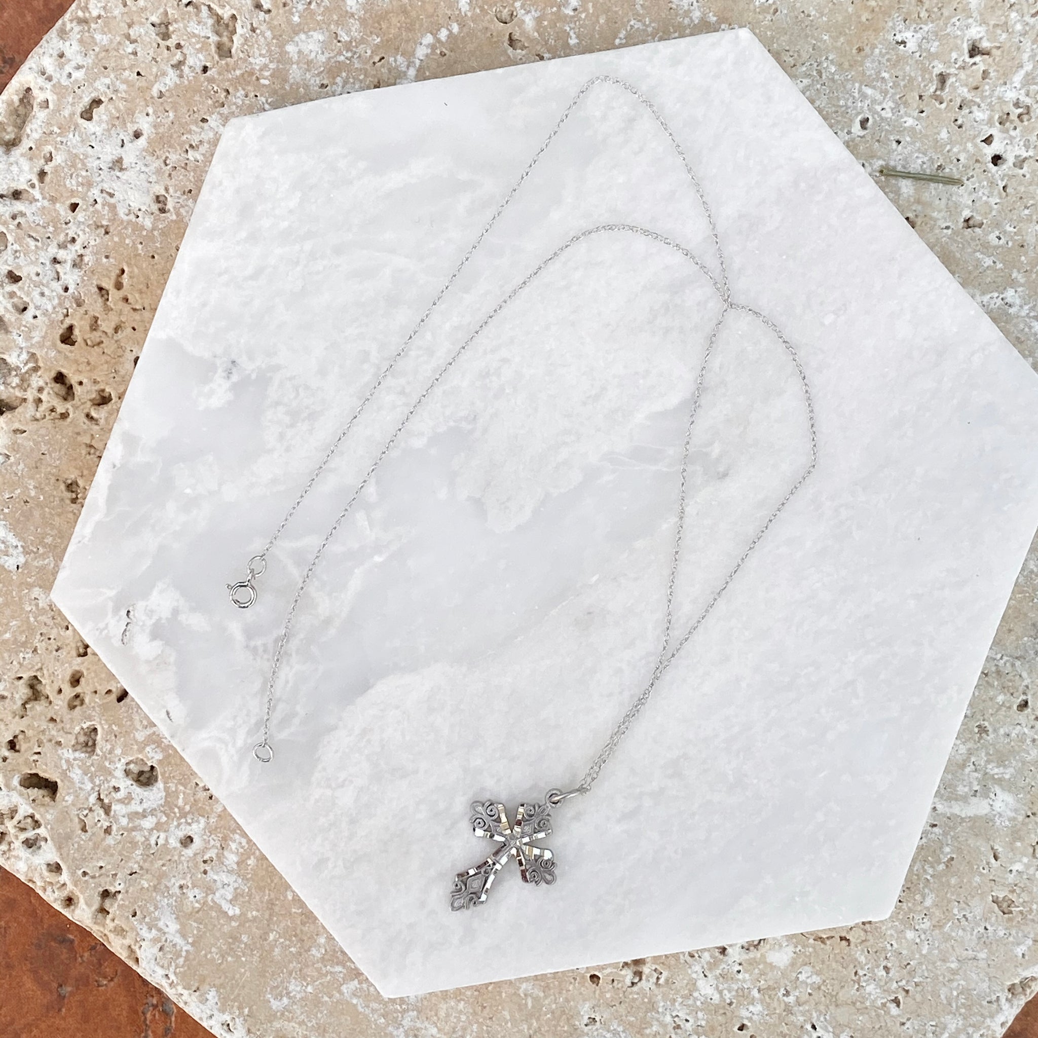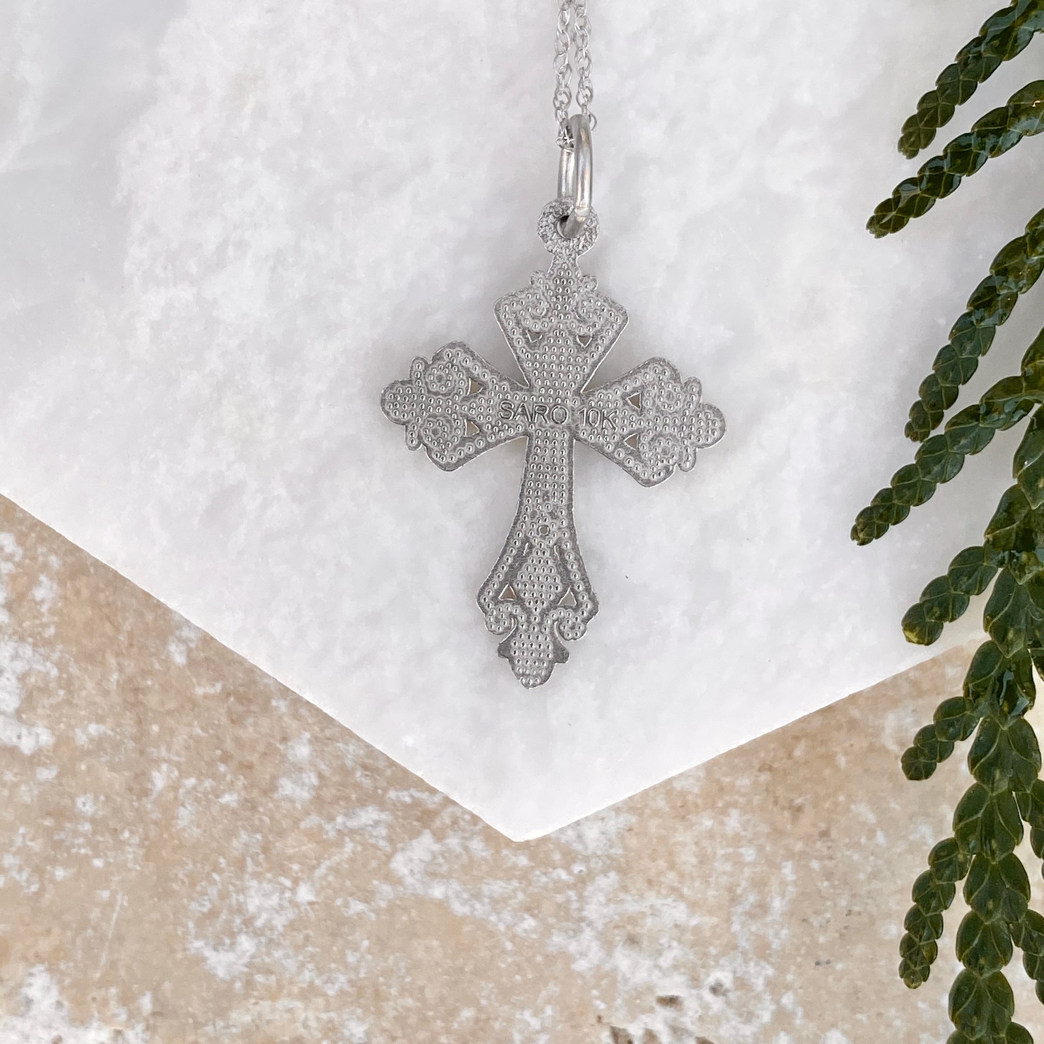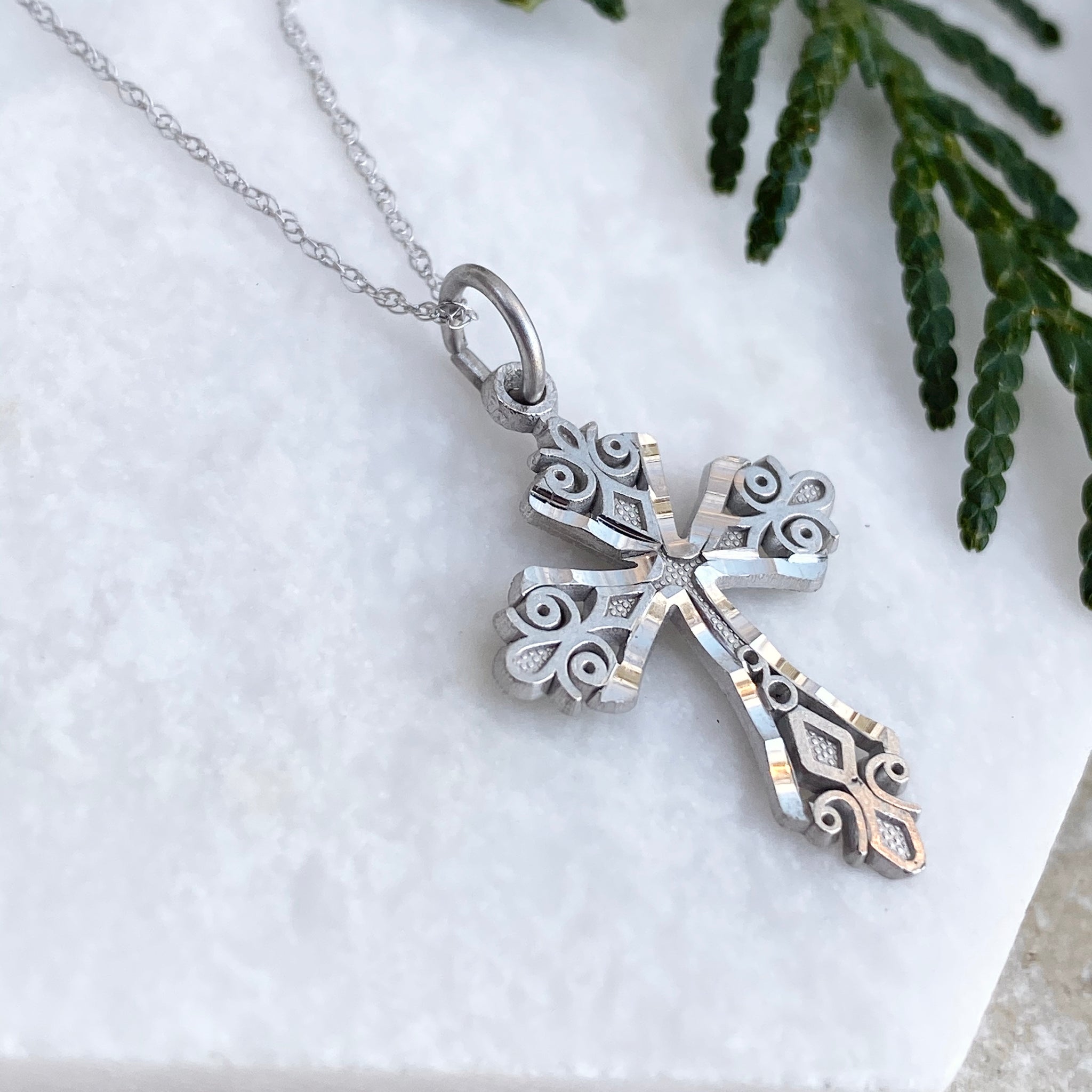 10KT white gold diamond-cut intricate detailed cross pendant charm on a thin, 10KT cable chain necklace. Diamond-cut detailing brings light + attention to the details on this unique cross piece.
