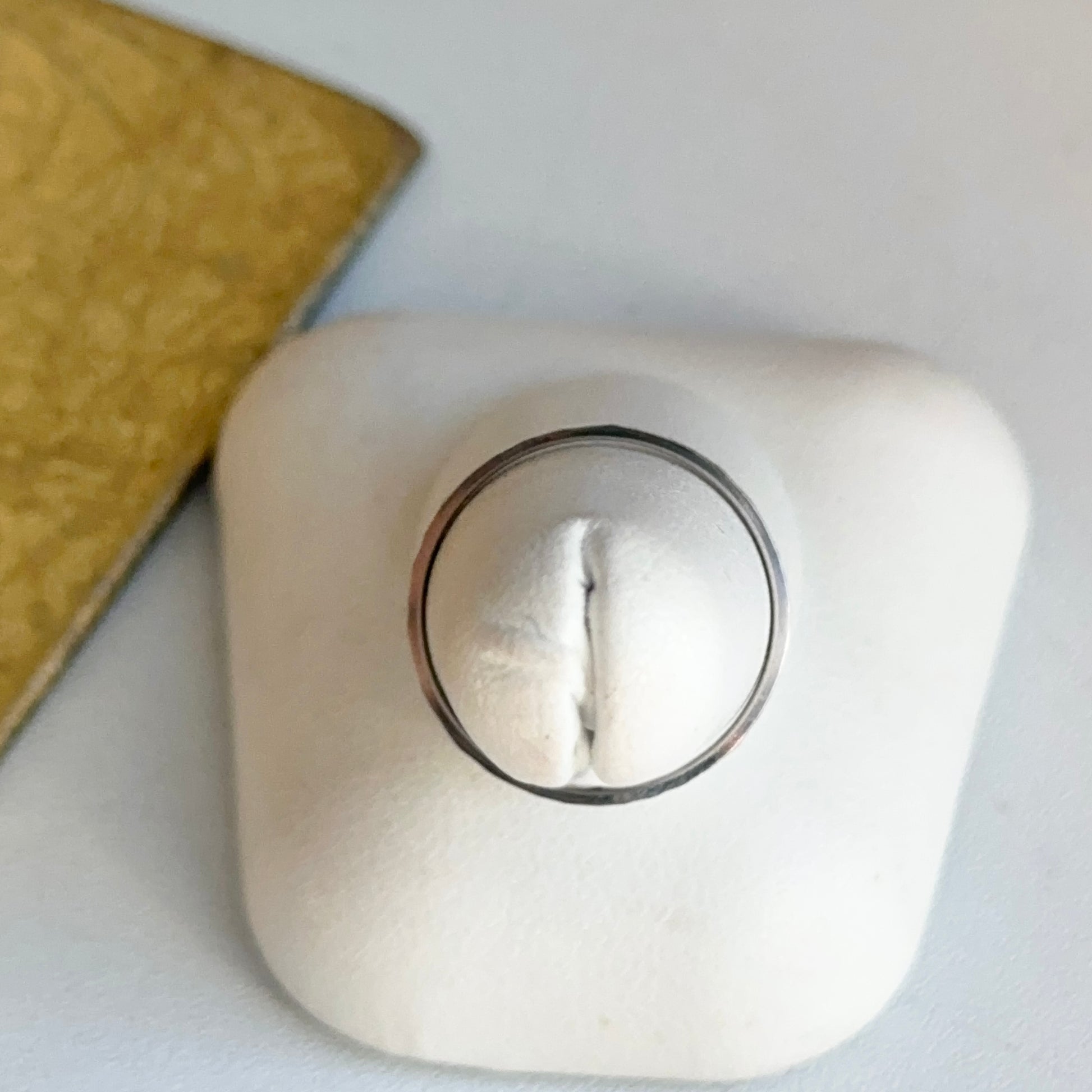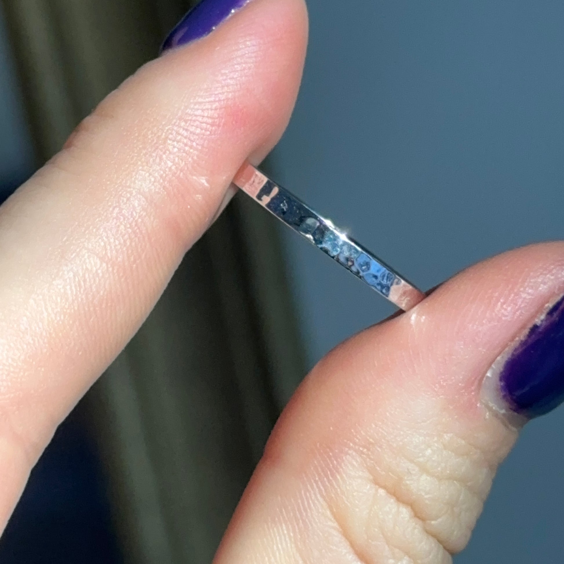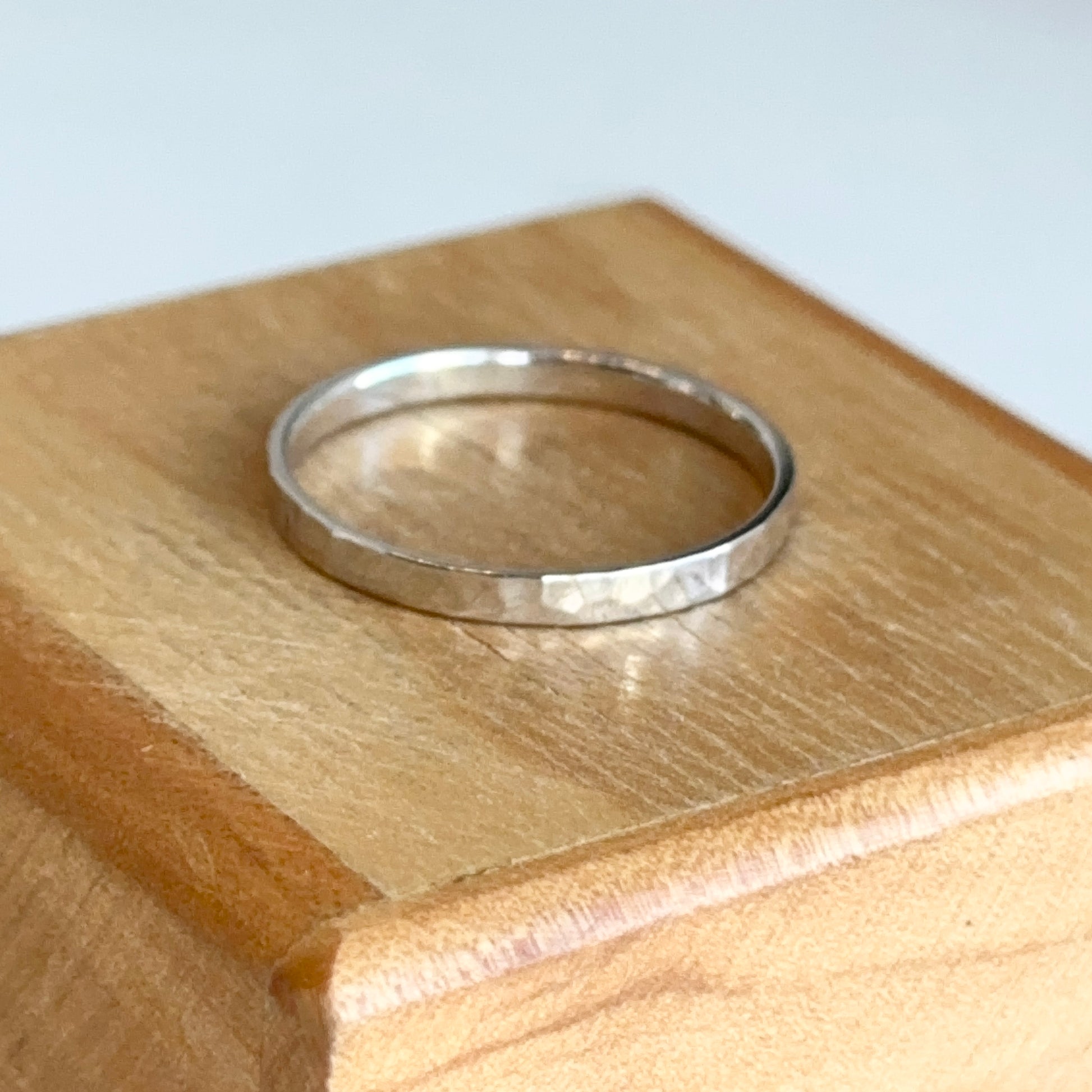 10K white gold hammered-effect thin band ring. Perfect for stacking and layering!