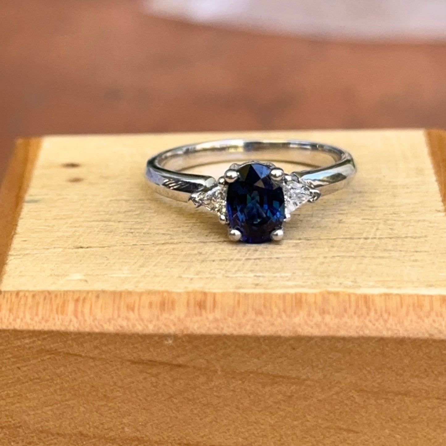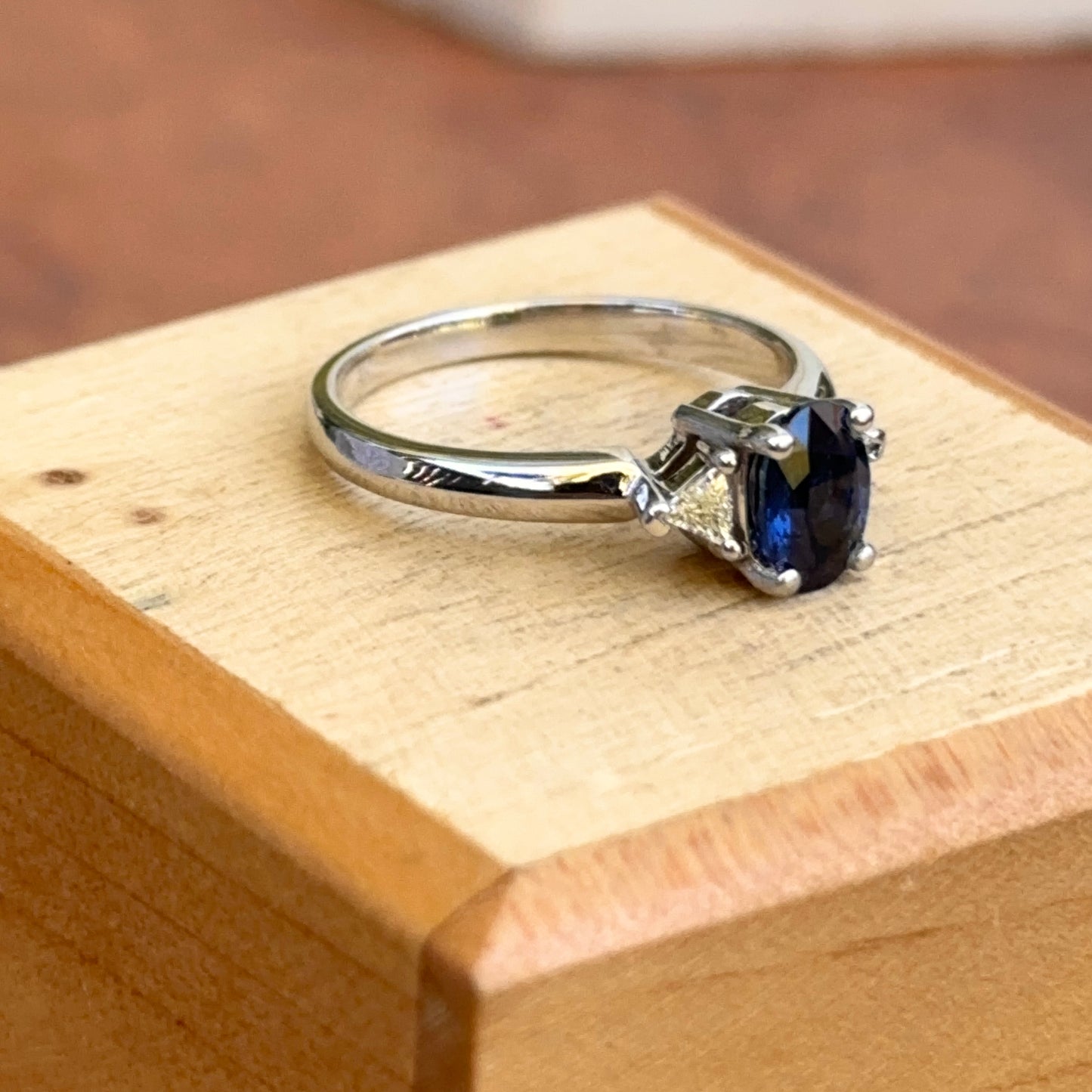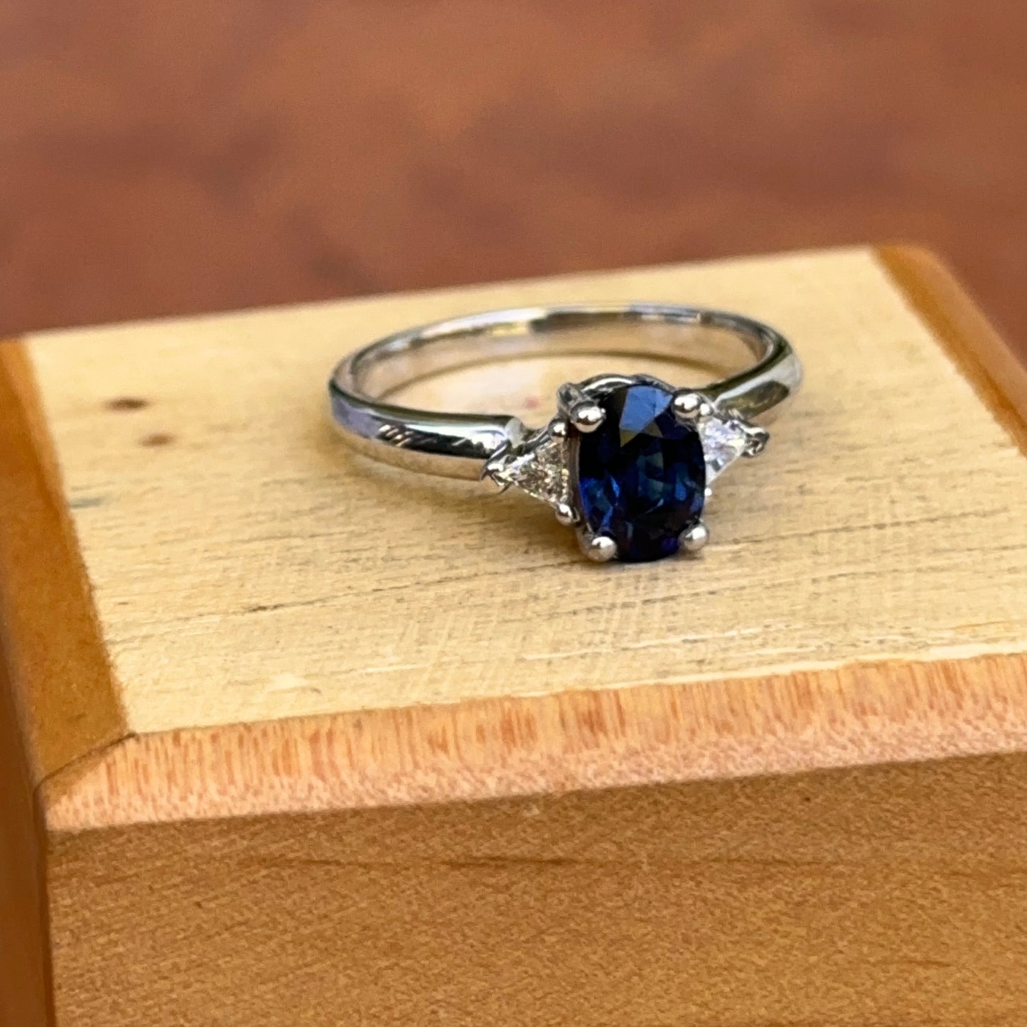 10KT White Gold Oval .97 CT Blue Sapphire + Trillion Diamond Ring