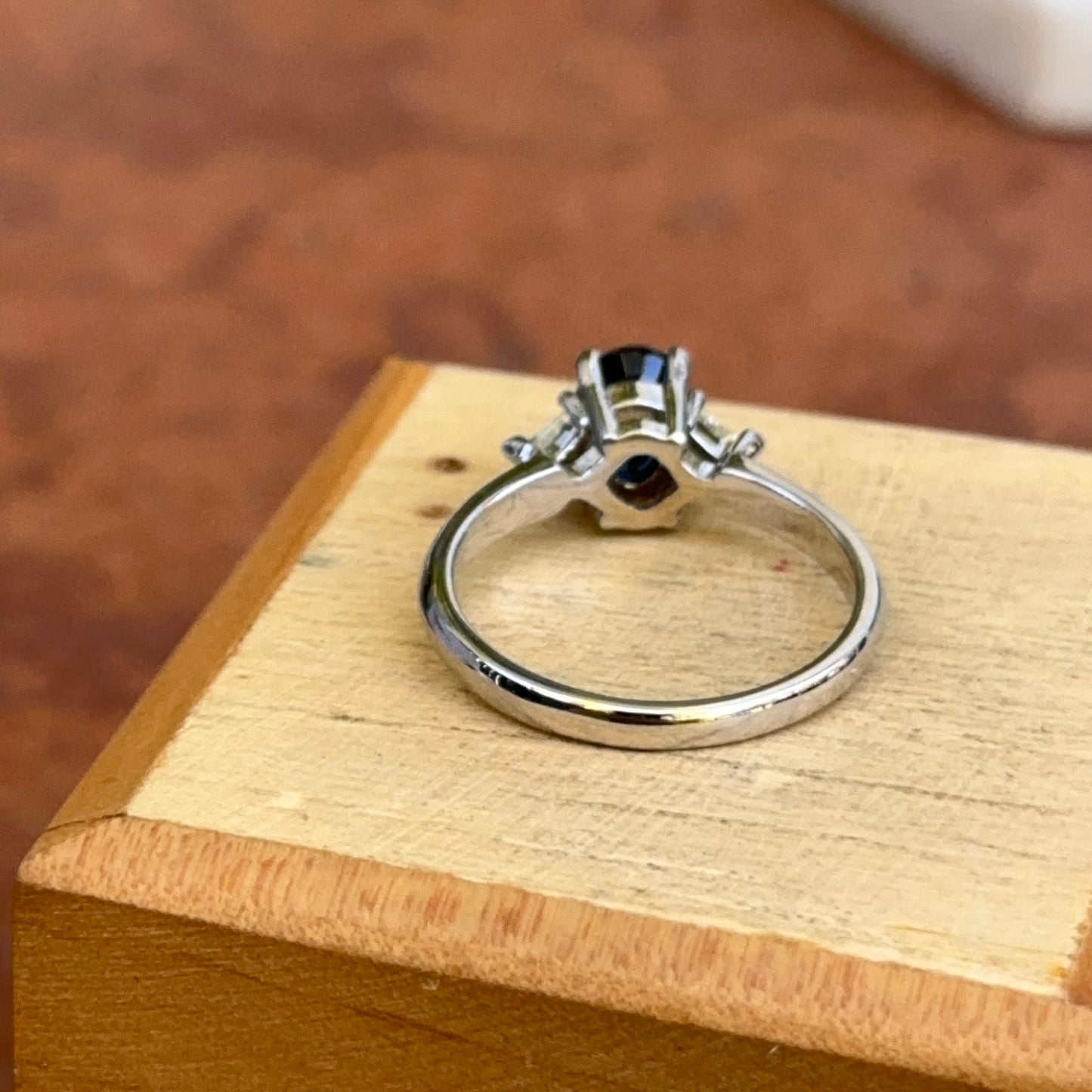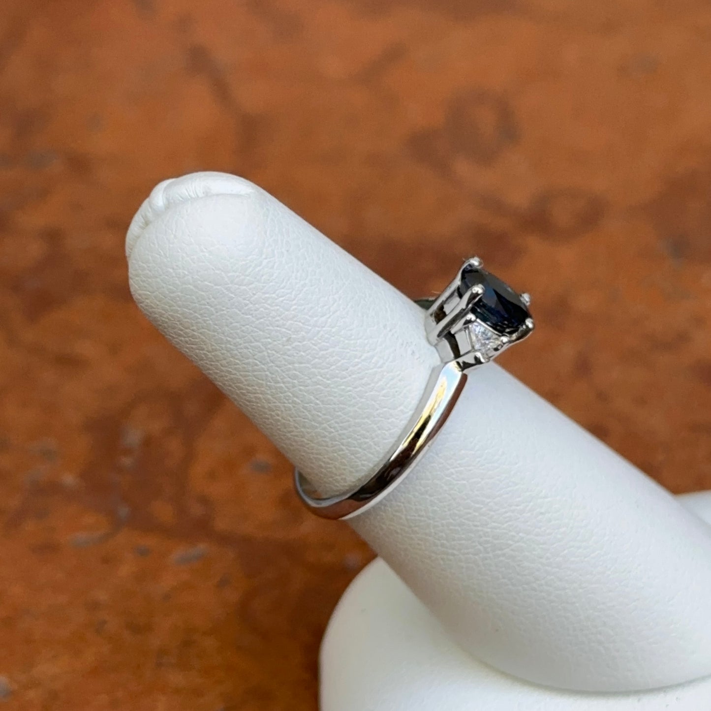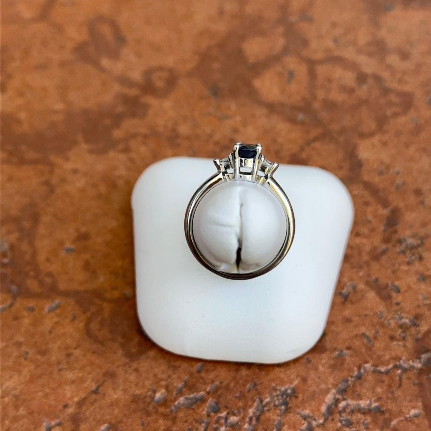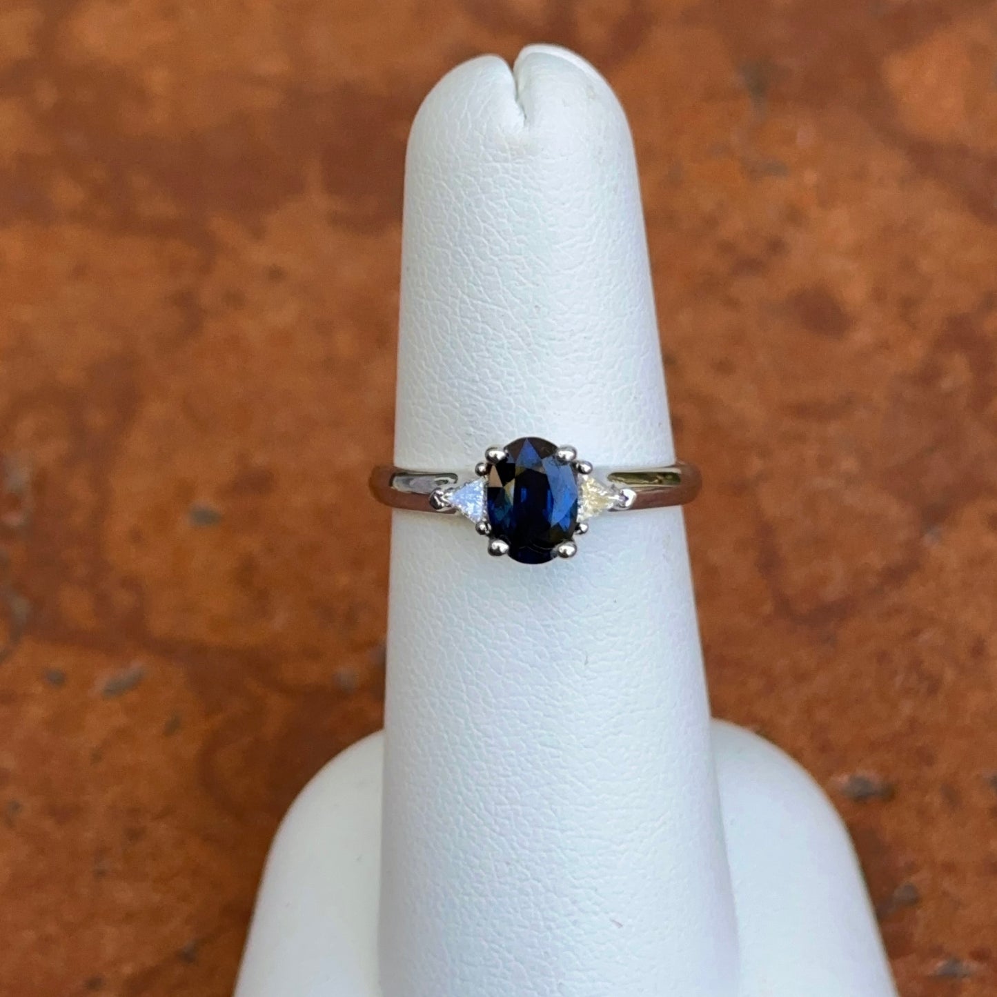 10KT White Gold Oval .97 CT Blue Sapphire + Trillion Diamond Ring