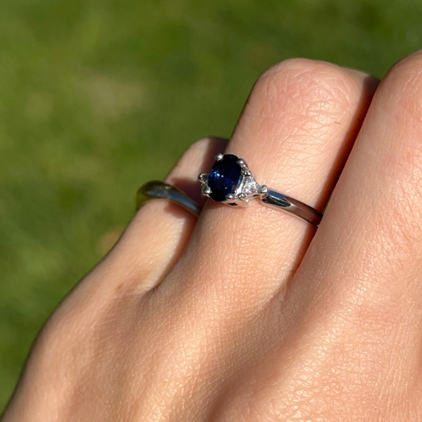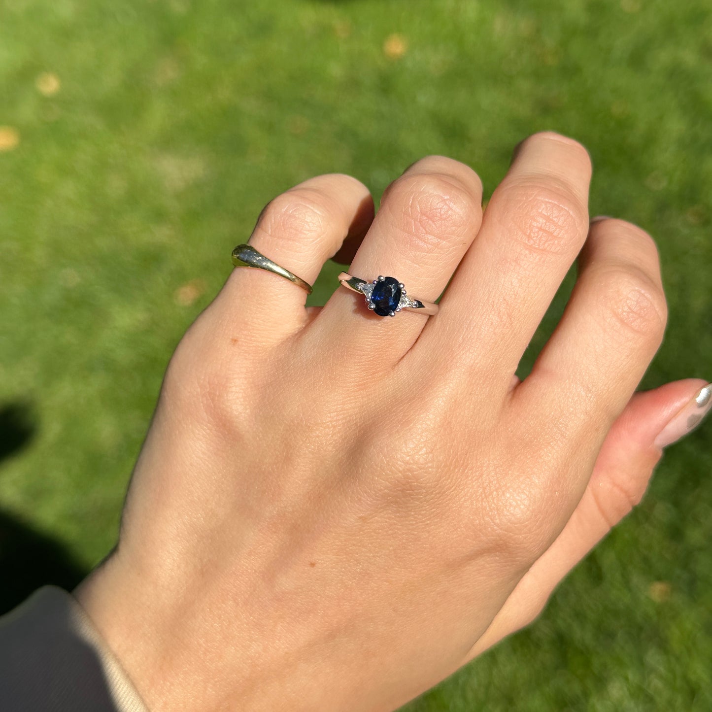 Custom 10KT white gold oval blue sapphire + trillion-cut diamond accent ring. Copy of an estate piece we had and loved!