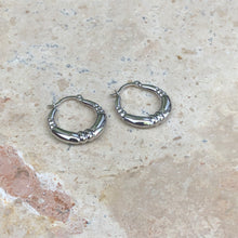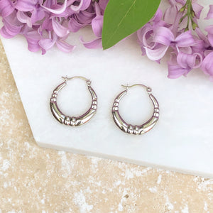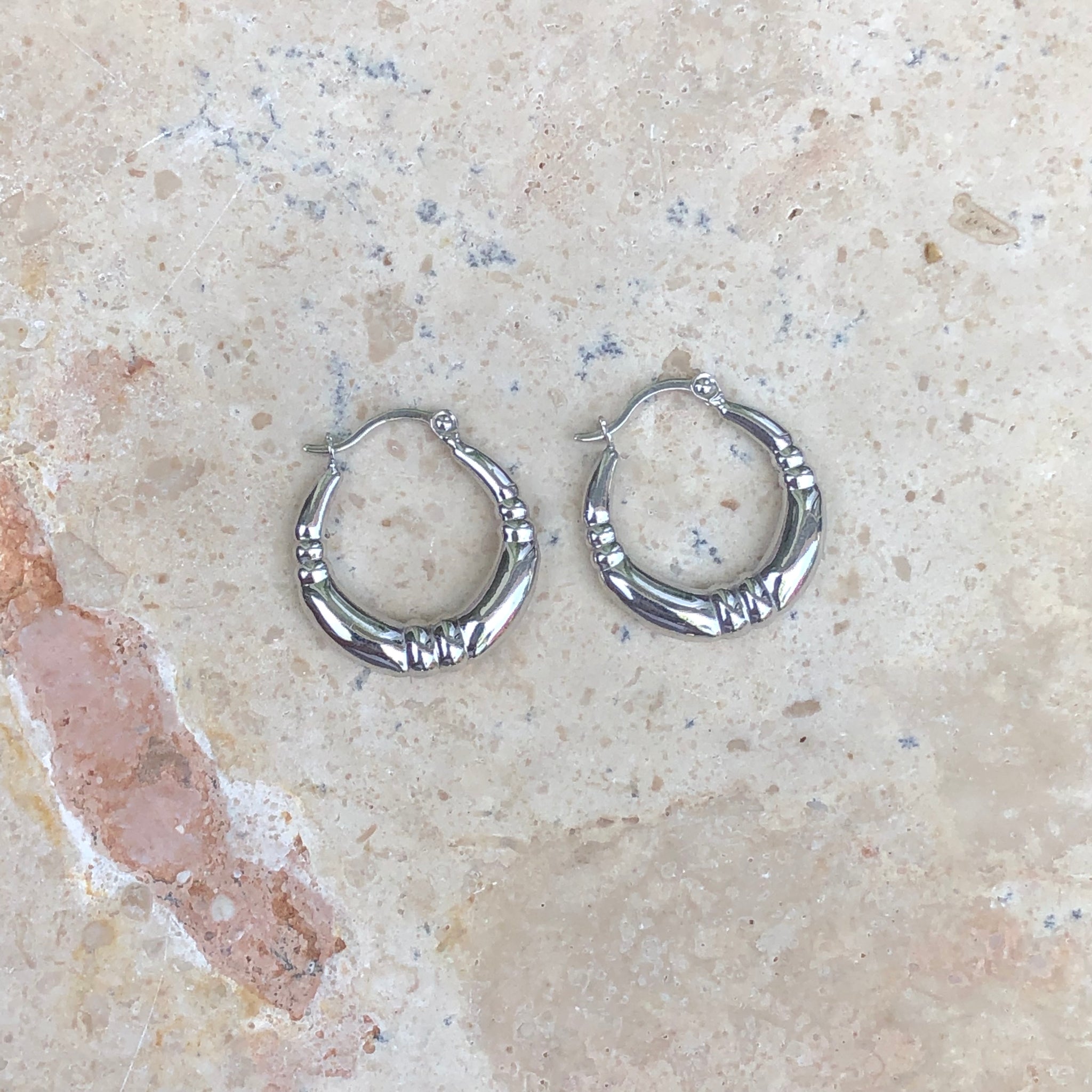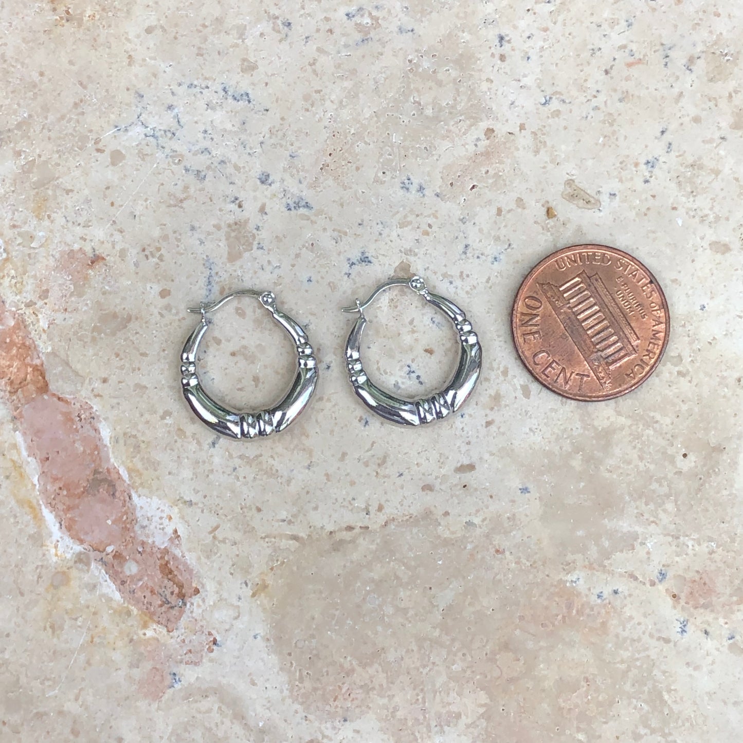 10KT white gold polished, scalloped hoop earrings. Lightweight, detailed hoops great for everyday!