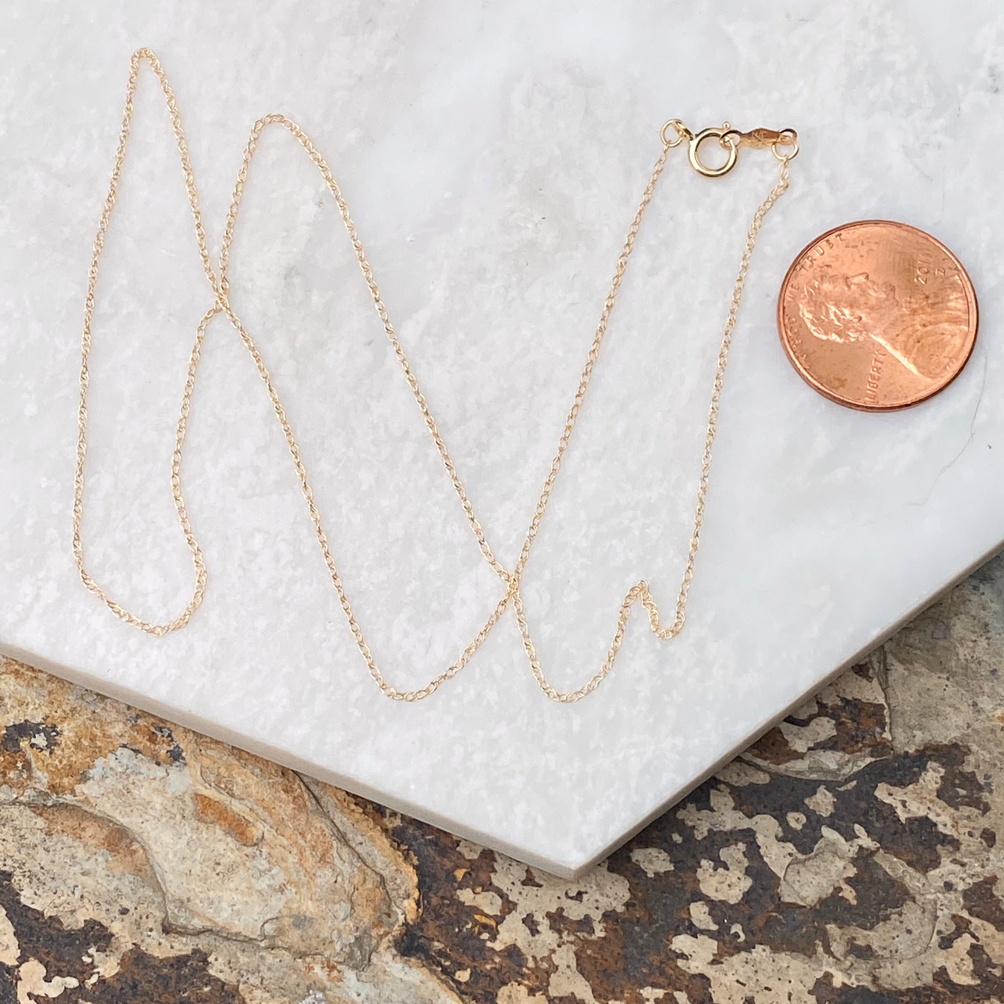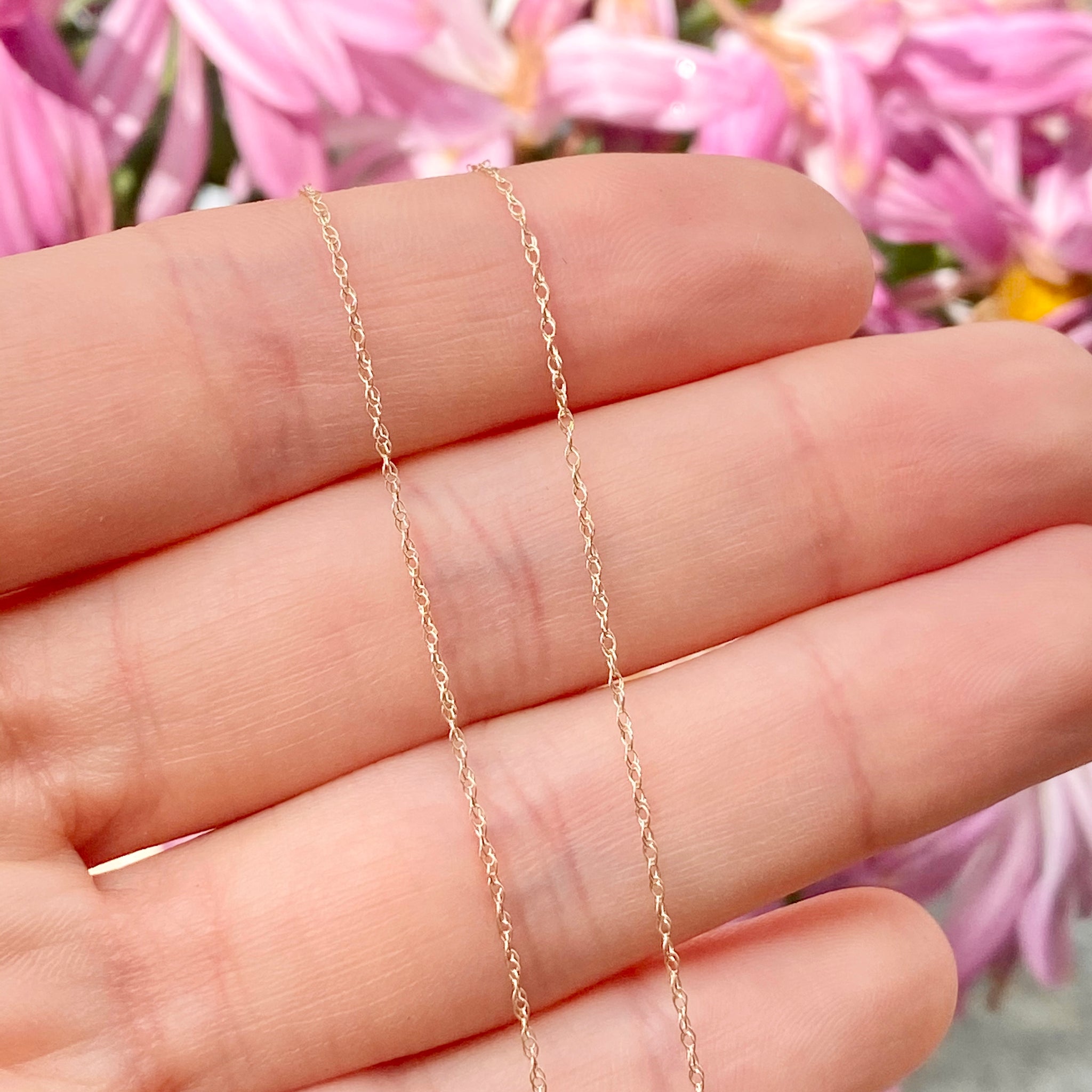 10KT yellow gold thin cable rope chain necklace. The staple, everyday chain necklace you can slide a variety of pendants onto! Also available in 18K yellow gold.