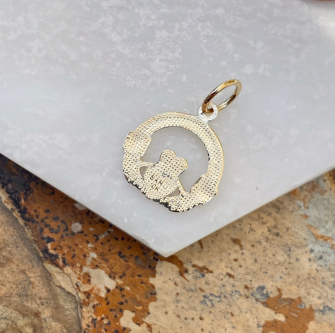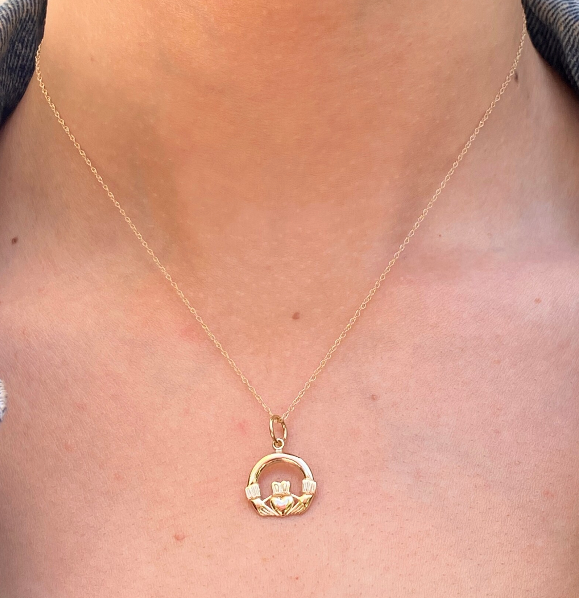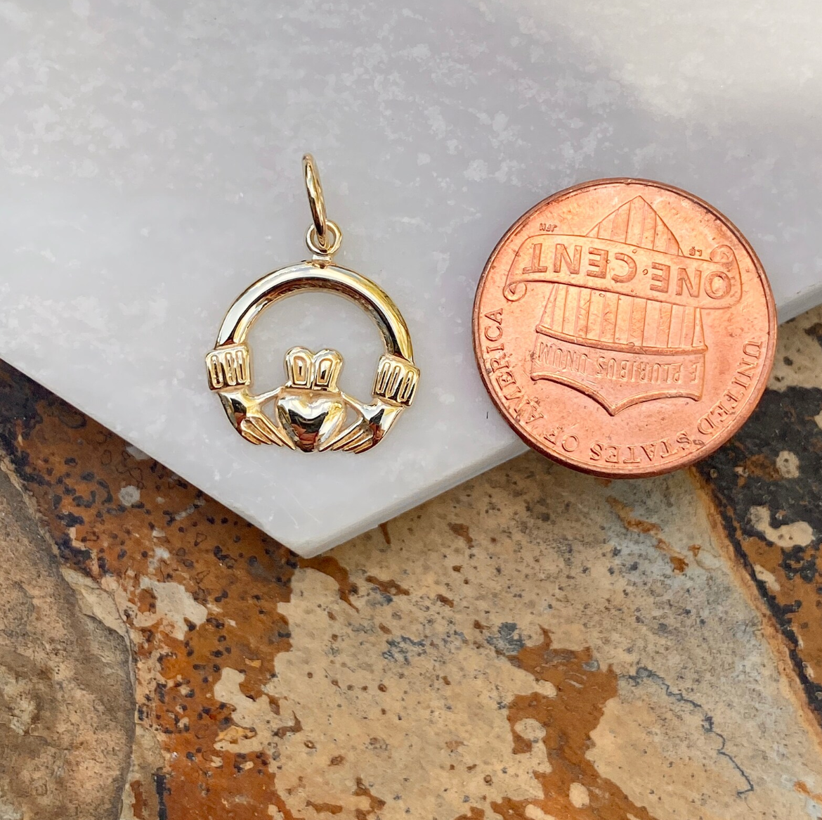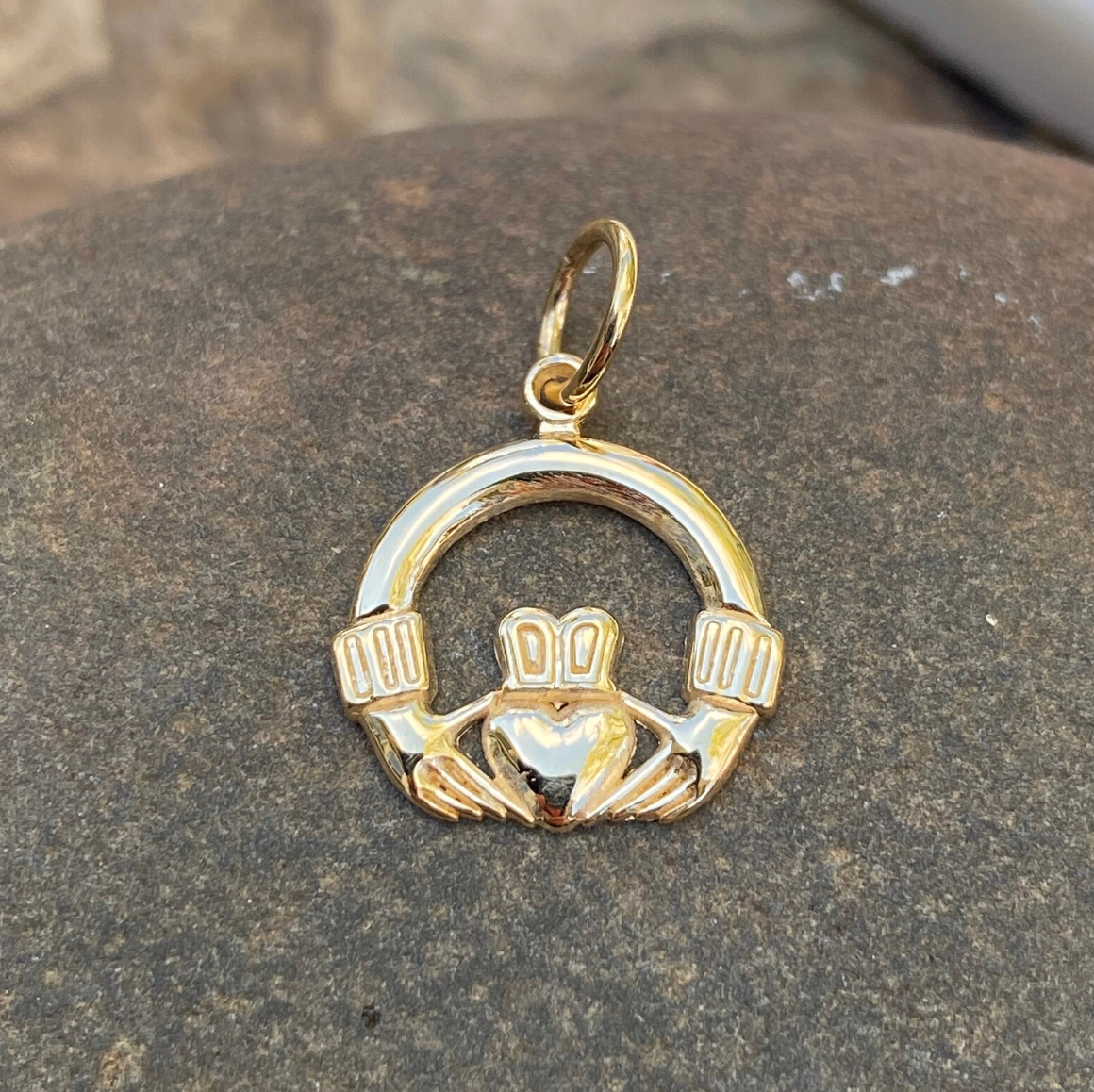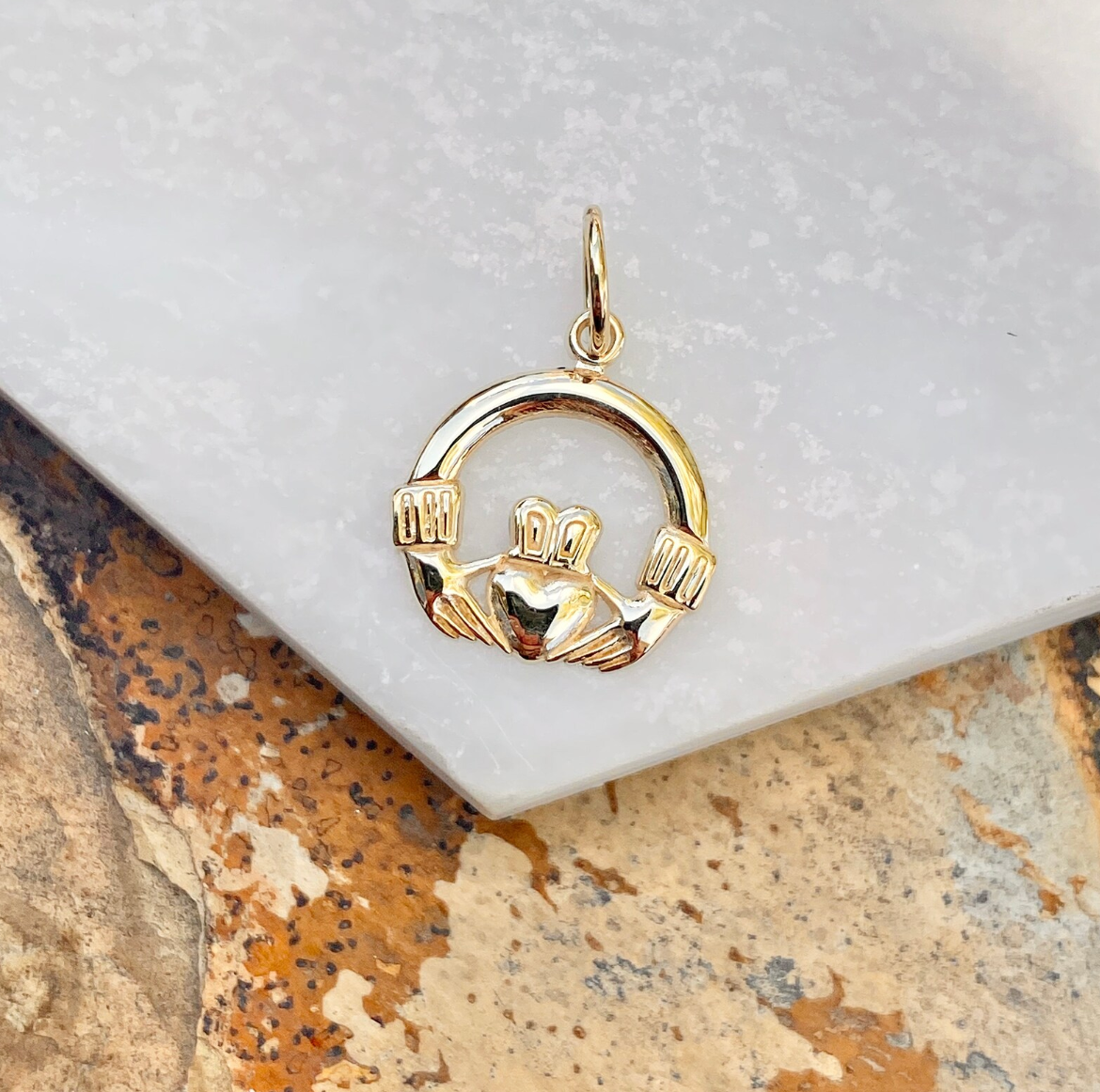 10KT yellow gold Celtic Claddagh design pendant charm. The Claddagh meaning is all about love, loyalty, and friendship. The two hands represent friendship, a heart symbolizes love and the crown on top is for loyalty.