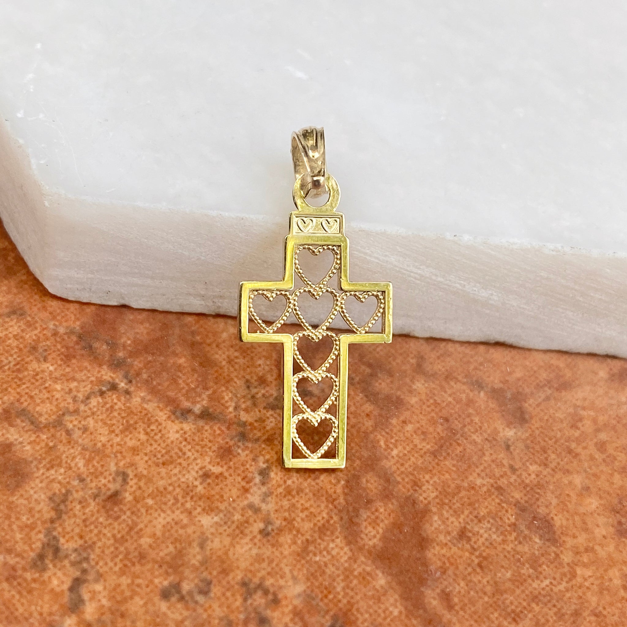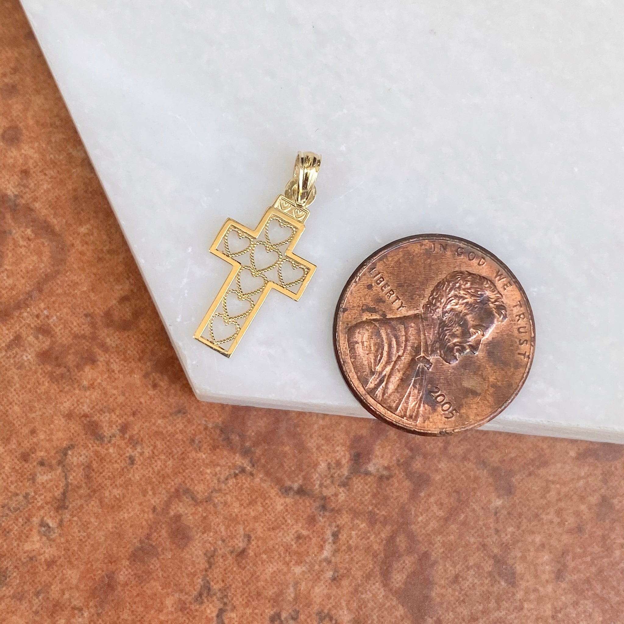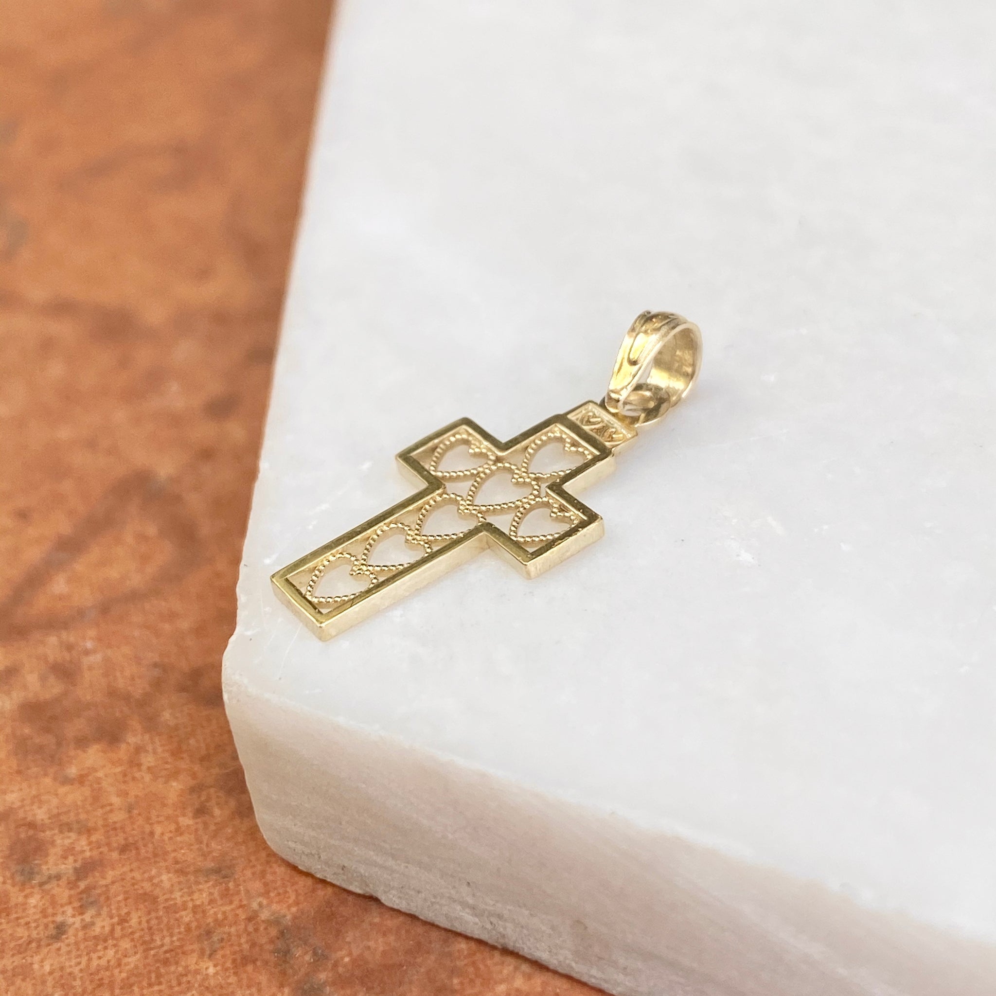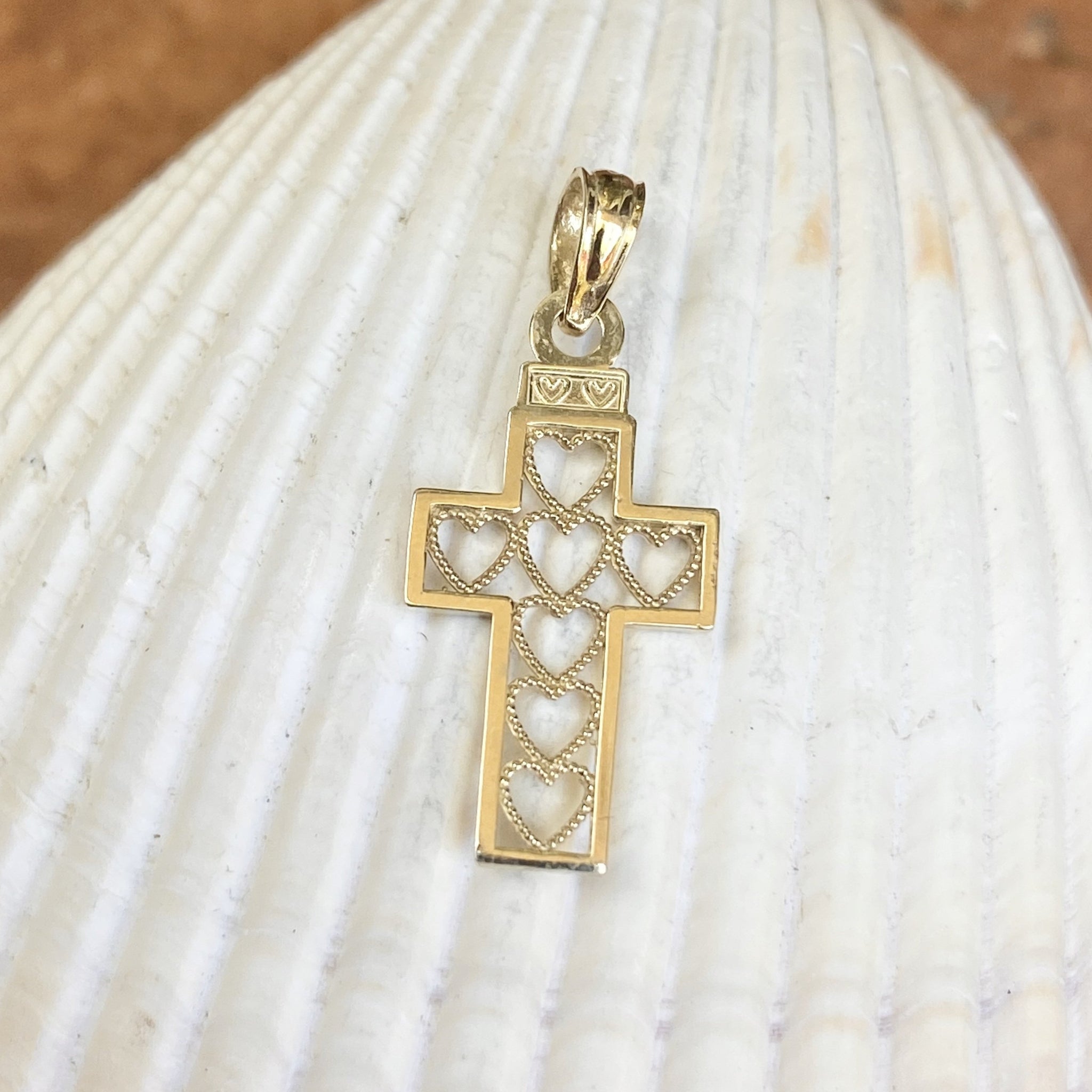Polished 10KT yellow gold cut-out hearts design cross pendant charm. Pair this pretty, mini charm with our 10K yellow gold cable chain necklace. Pictures are enlarged to show detail. Please refer to measurements listed for exact size.