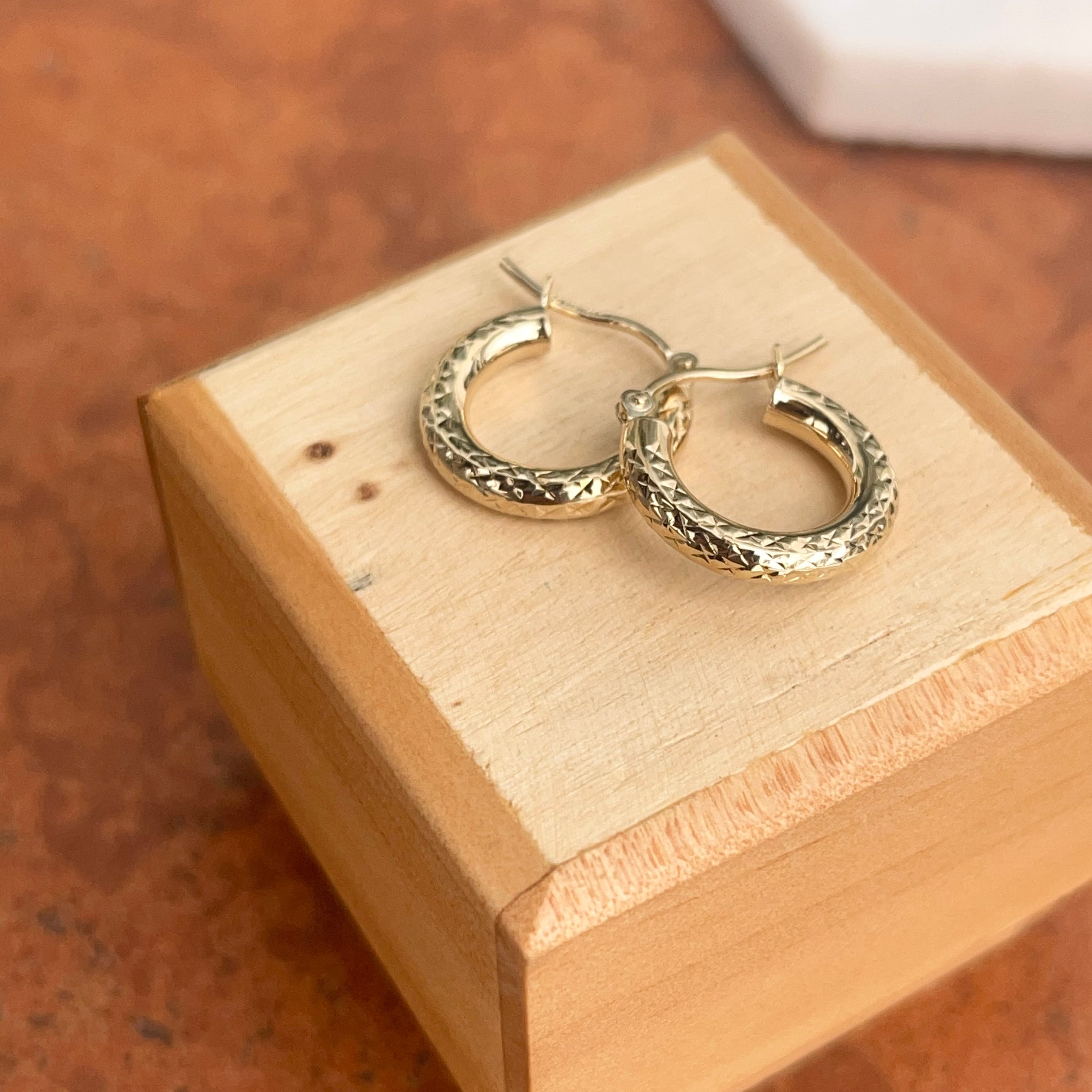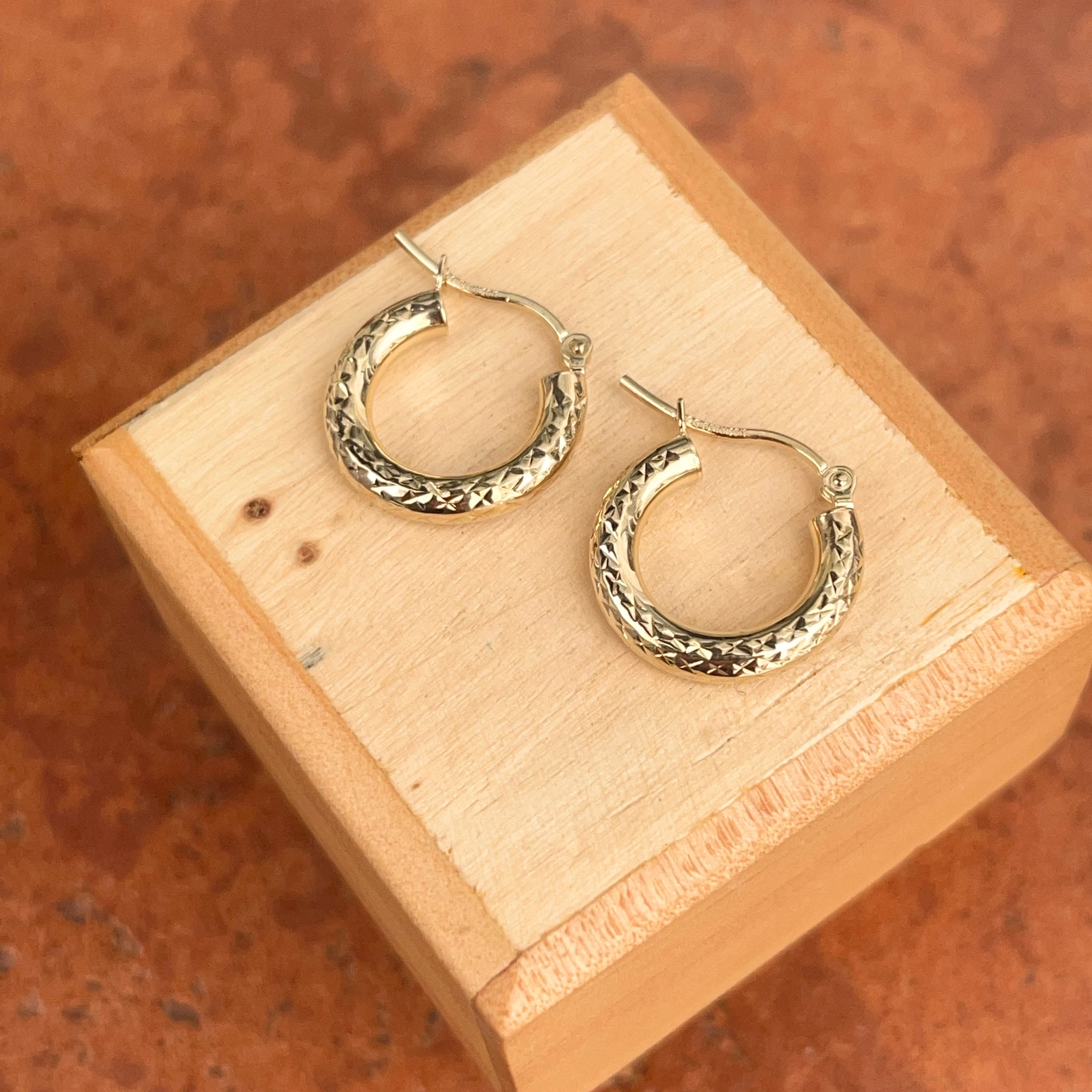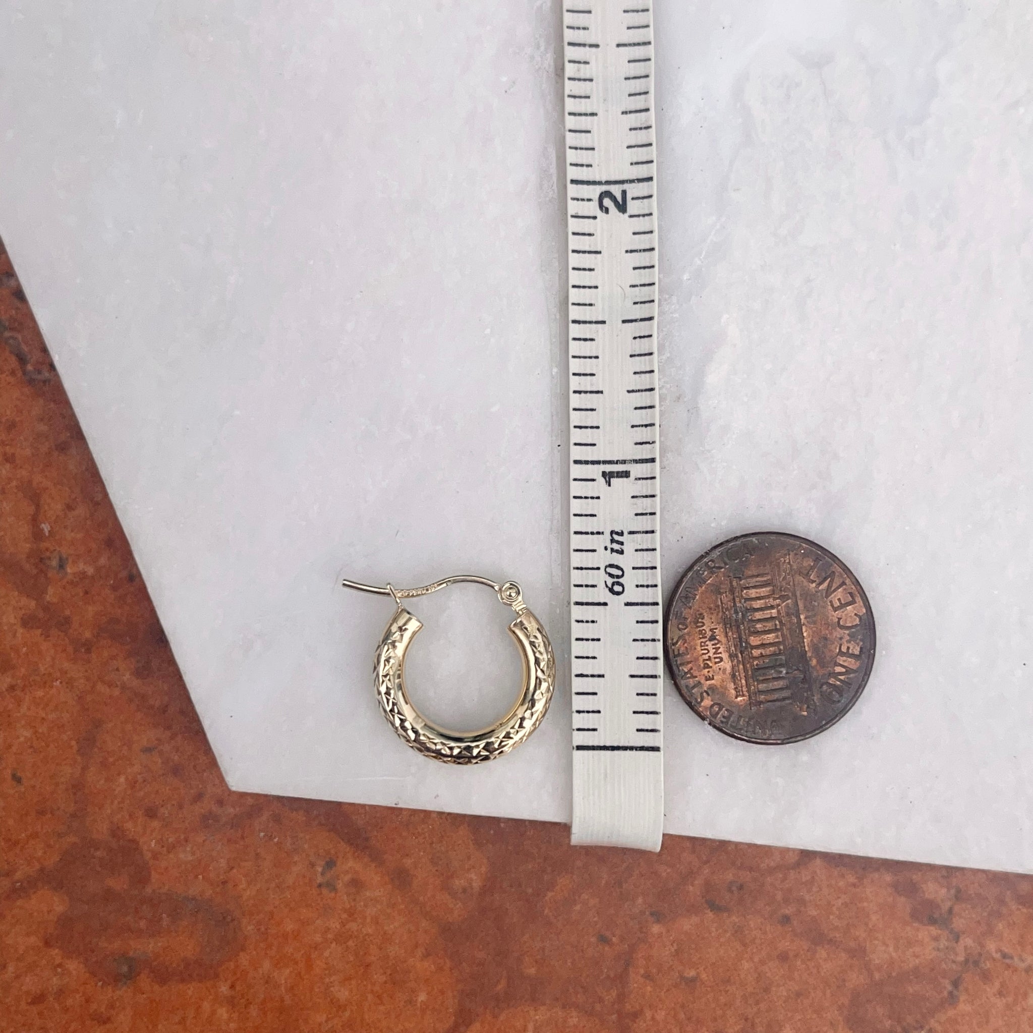 10KT yellow gold diamond-cut round tube hoop earrings. Small size hoop earrings in a light-catching textured finish.