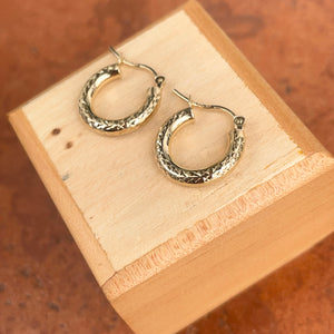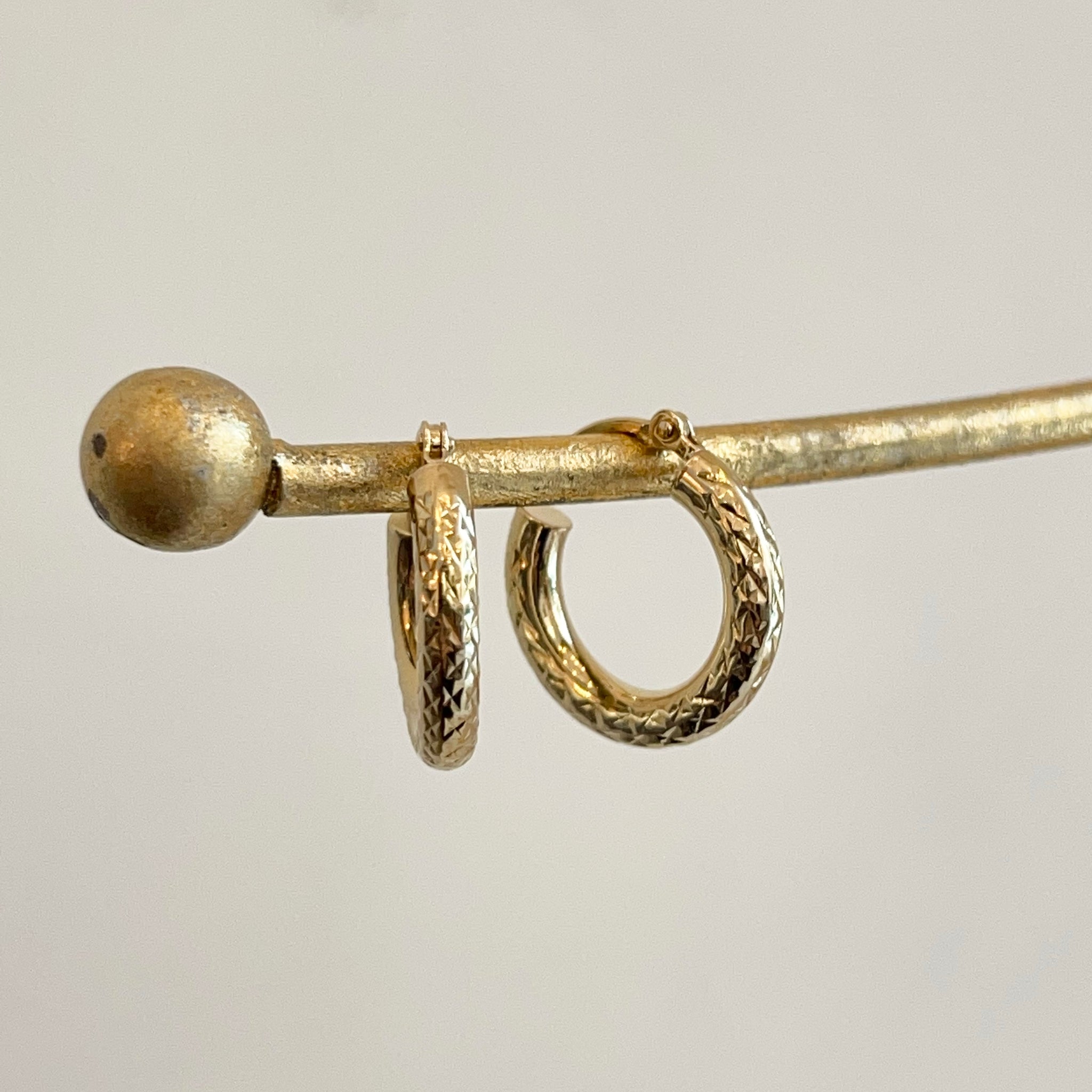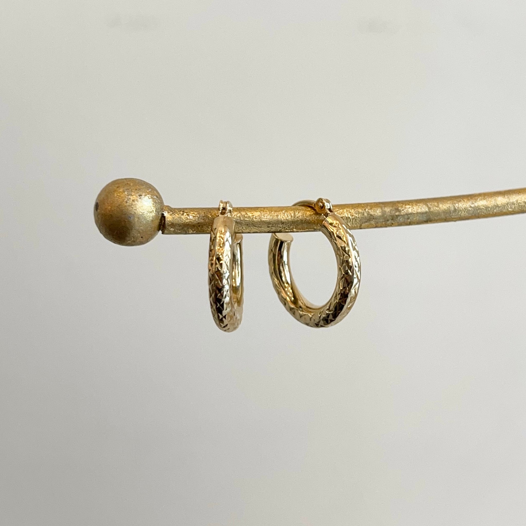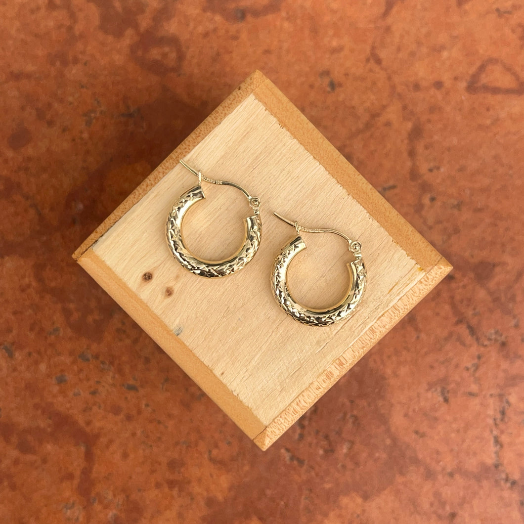10KT yellow gold diamond-cut round tube hoop earrings. Small size hoop earrings in a light-catching textured finish.