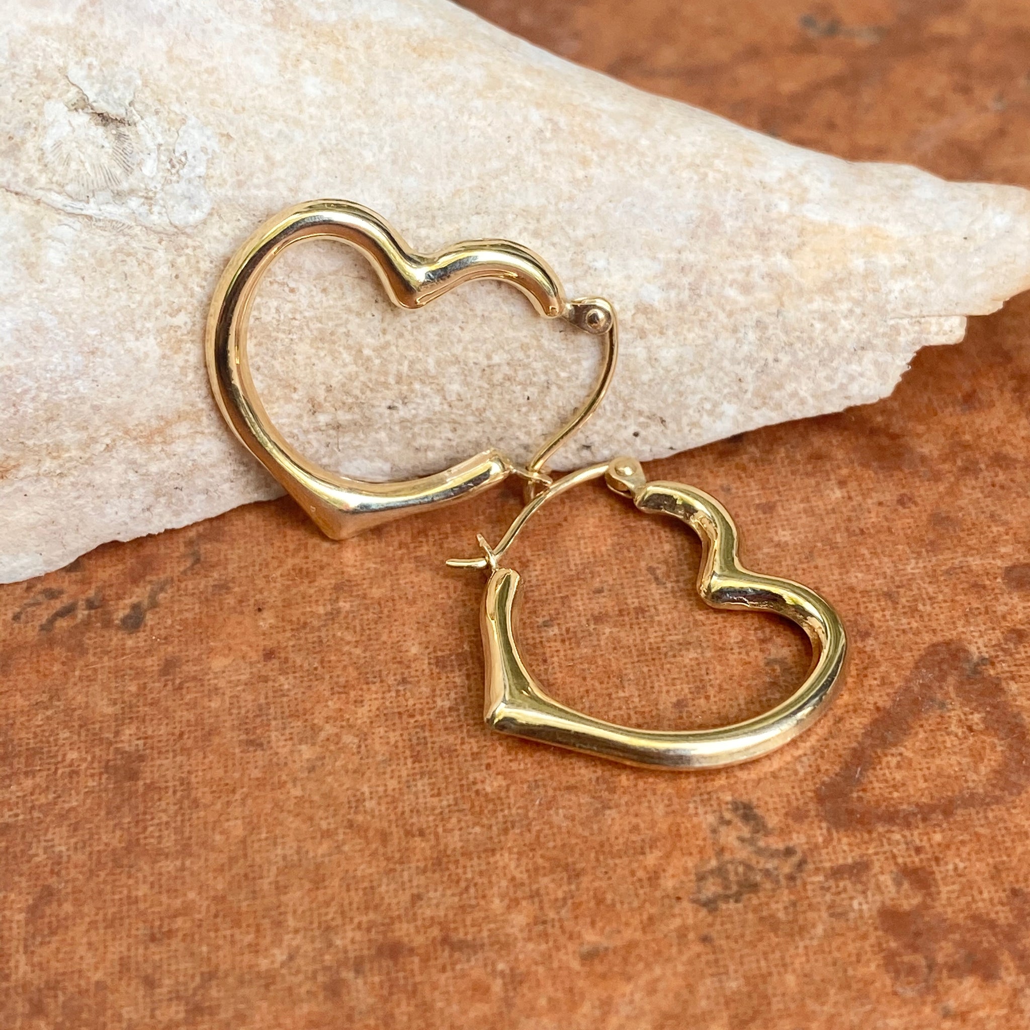 10KT yellow gold polished open heart hoop earrings in medium size. We carry 3 sizes of this style earring- this is the middle size.