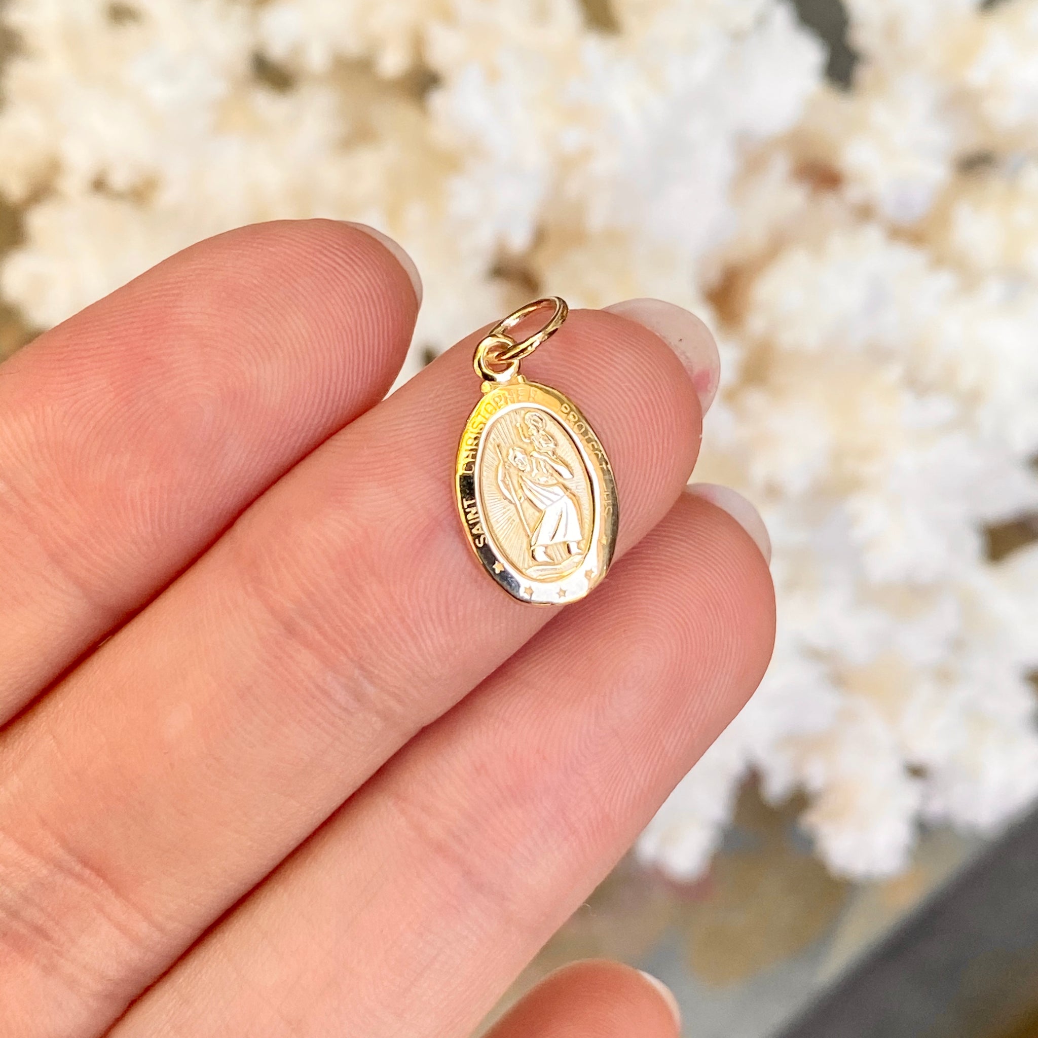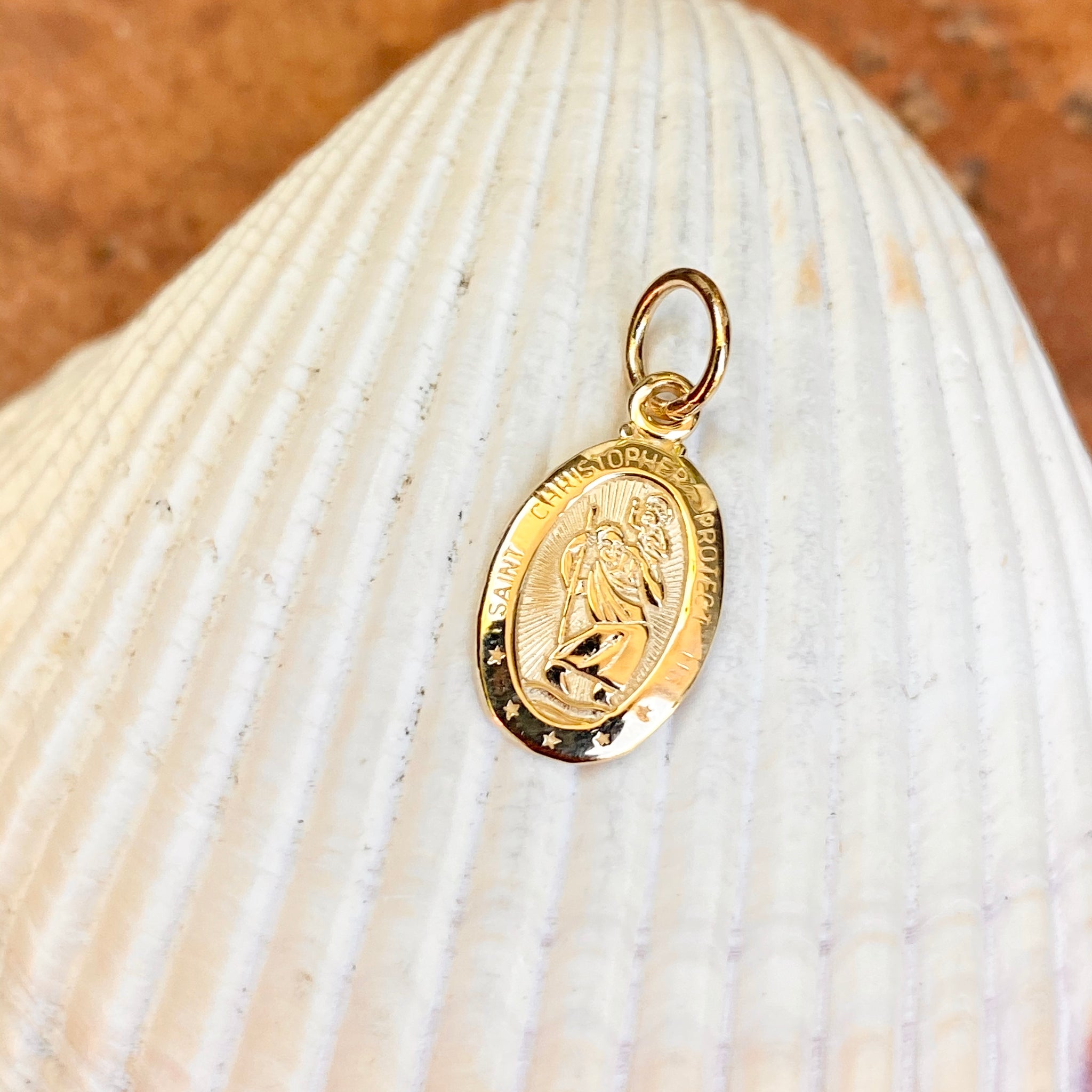 10KT yellow gold oval Saint Christopher medal pendant. Saint Christopher is the patron saint of travelers and children! Chain sold separately.
