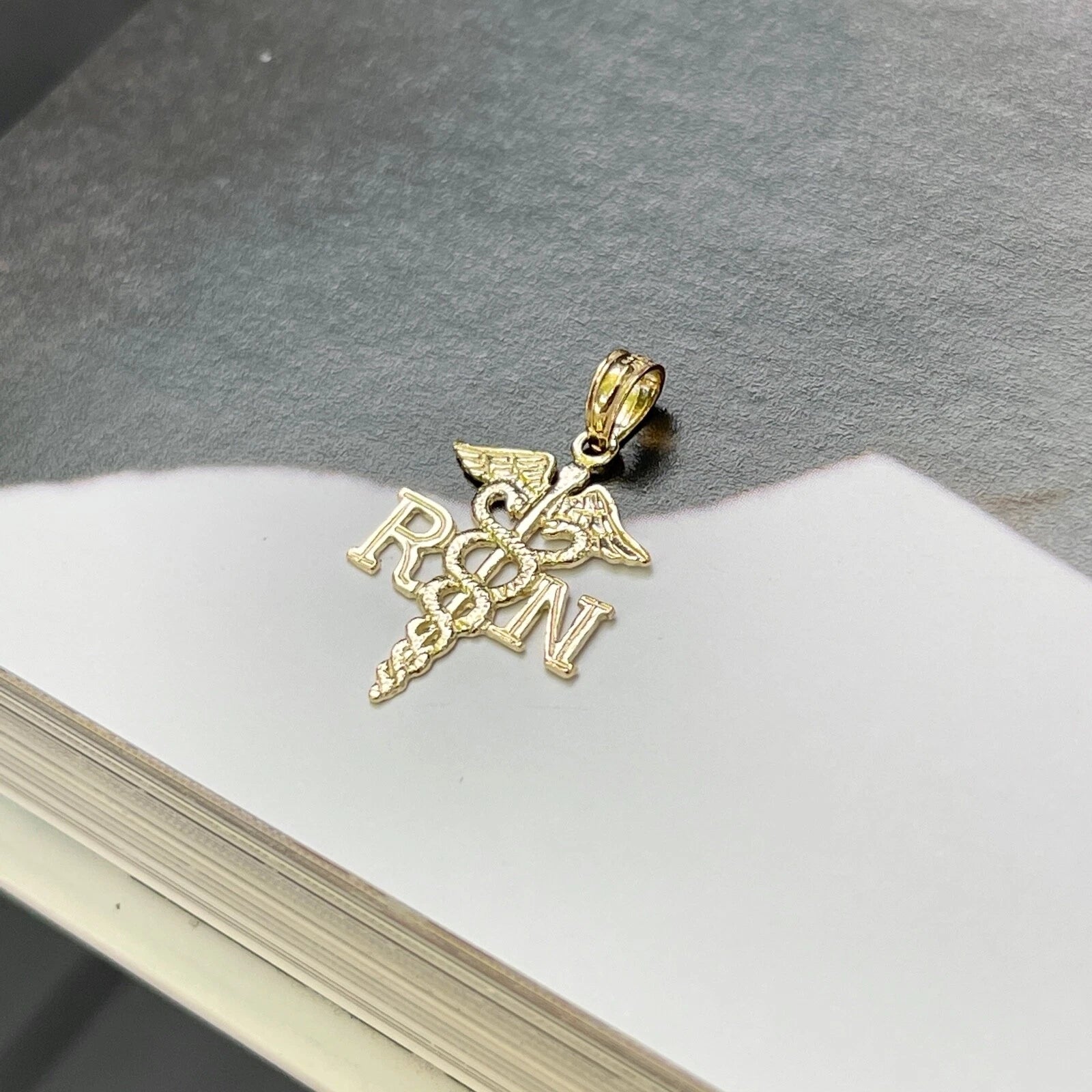 10KT Yellow Gold RN Caduceus Small Pendant Charm. This charm features the initials RN for registered nurse, and the traditional medical corps symbol of two snakes wrapped around a winged staff.
