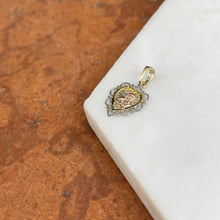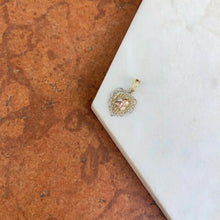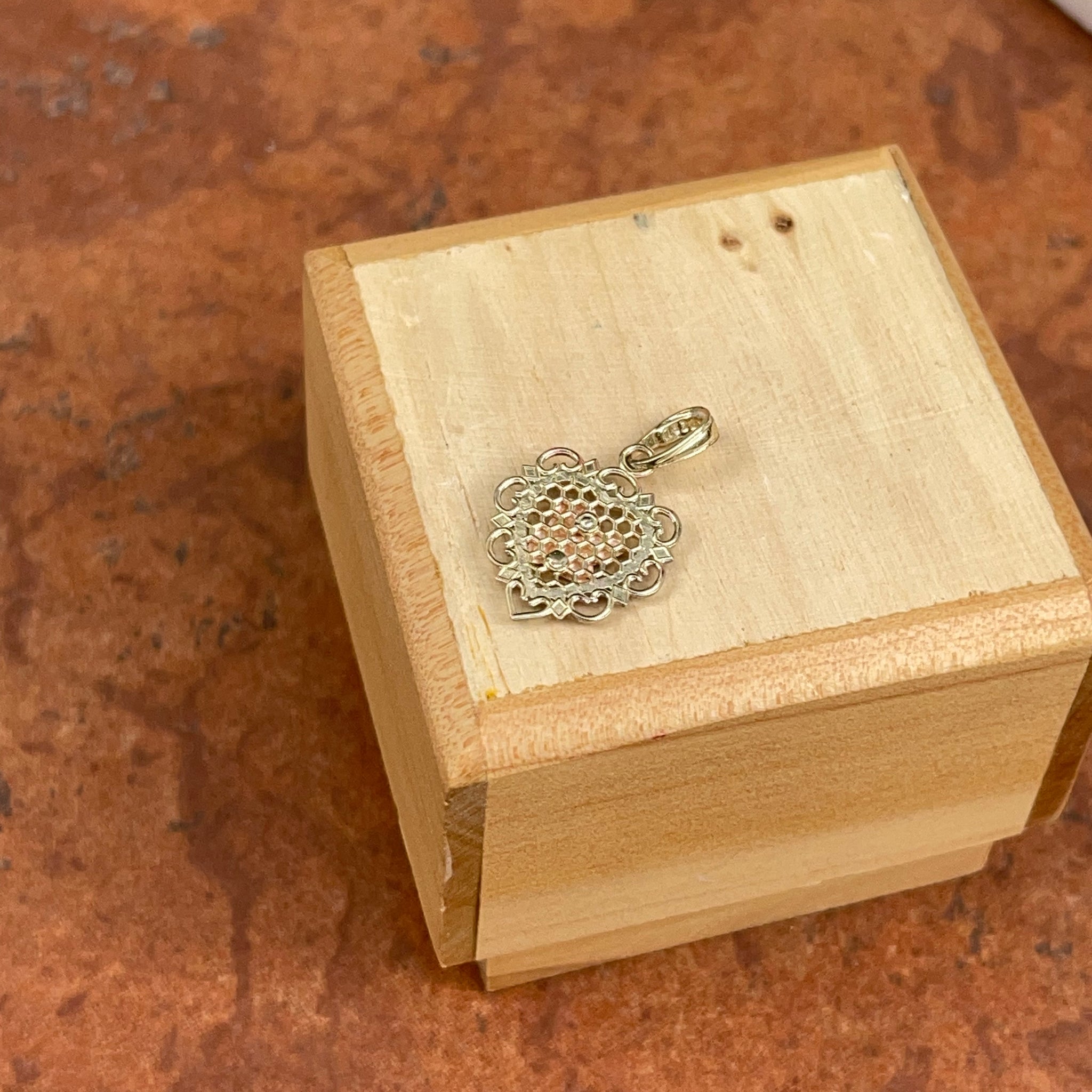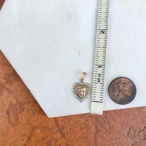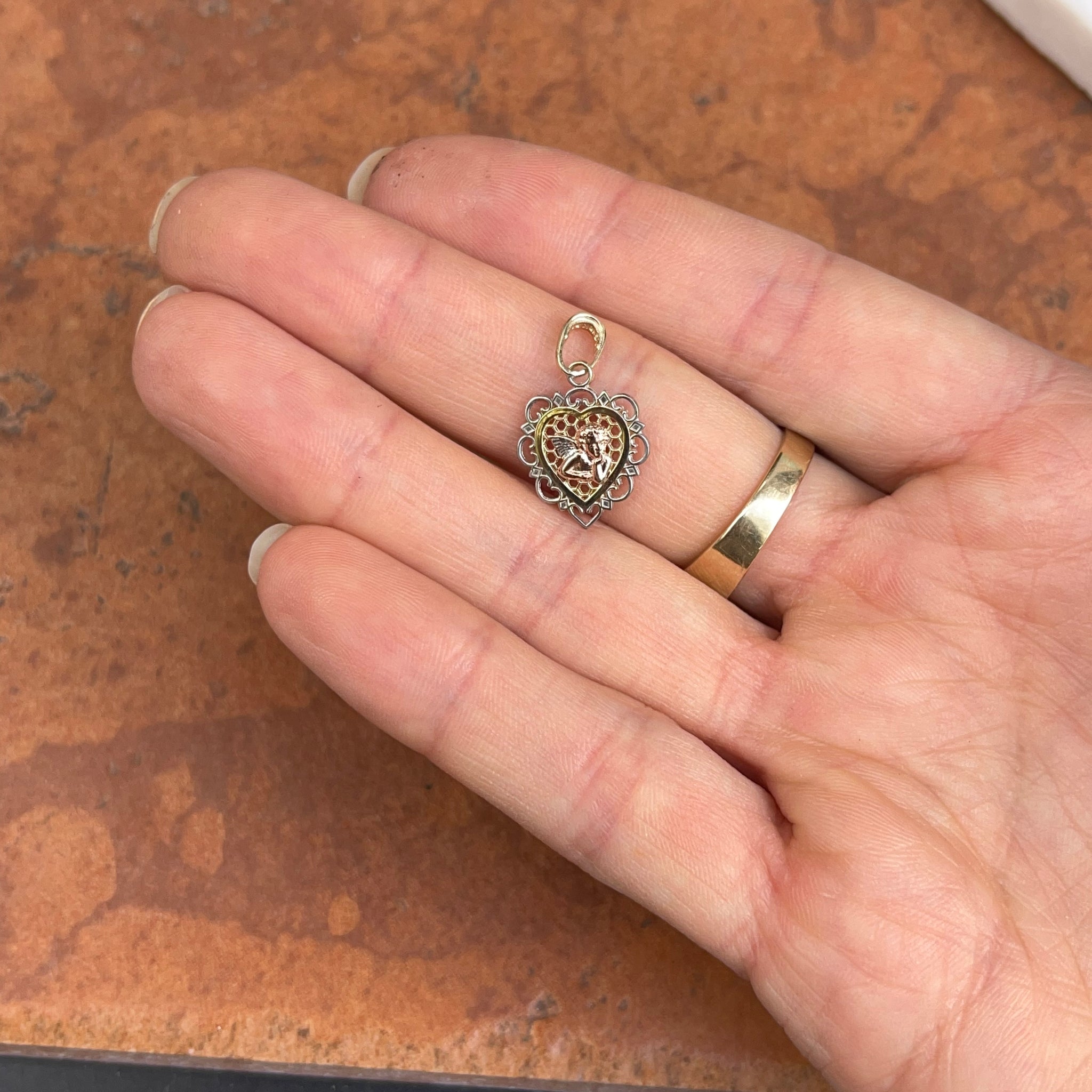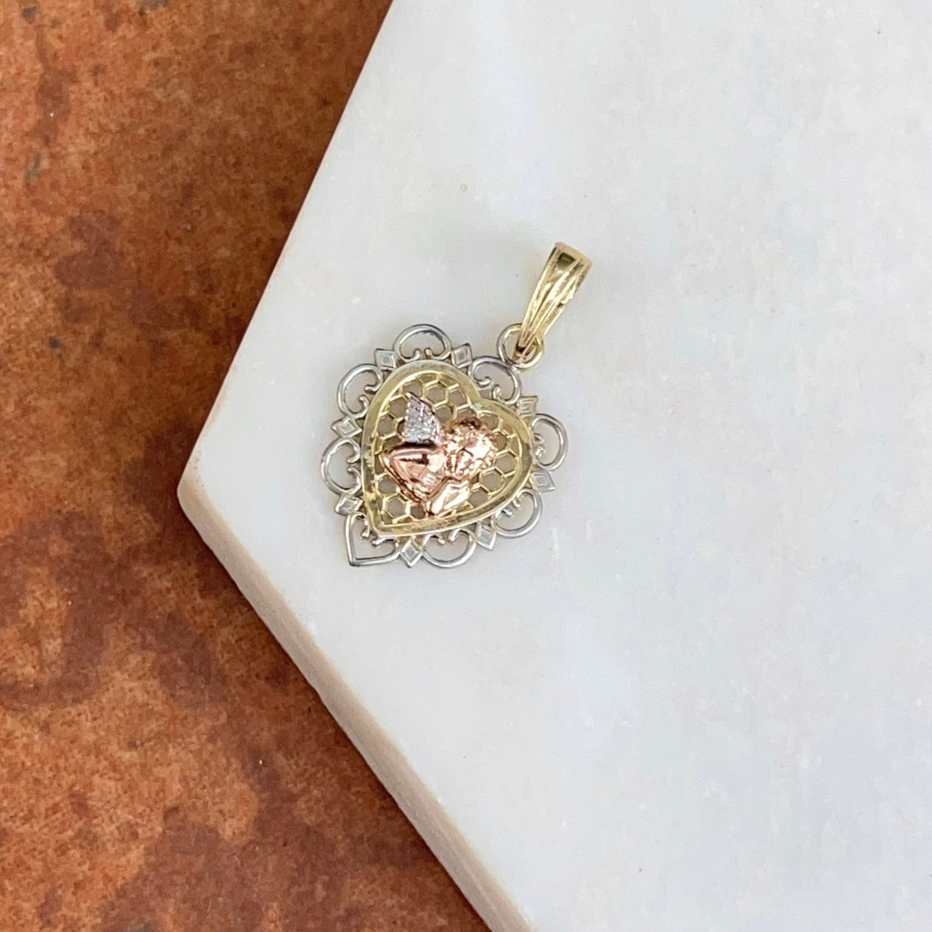 Tri-color 10KT yellow gold, 10KT rose gold, + white rhodium angel baby in filigree detailed heart pendant charm.