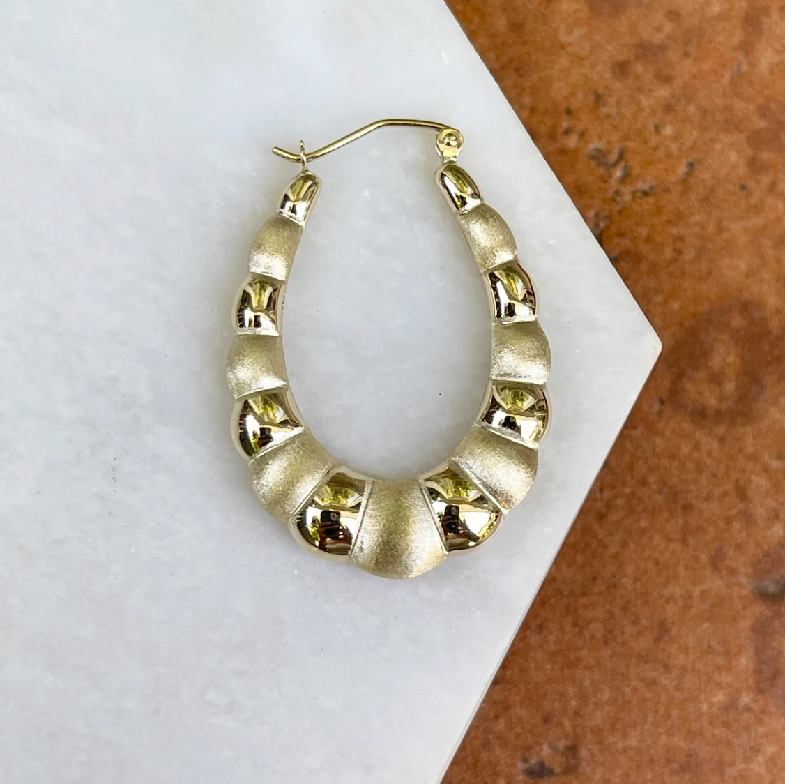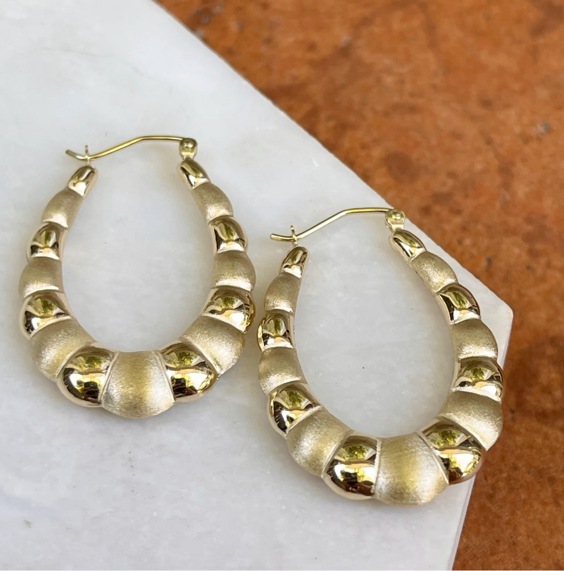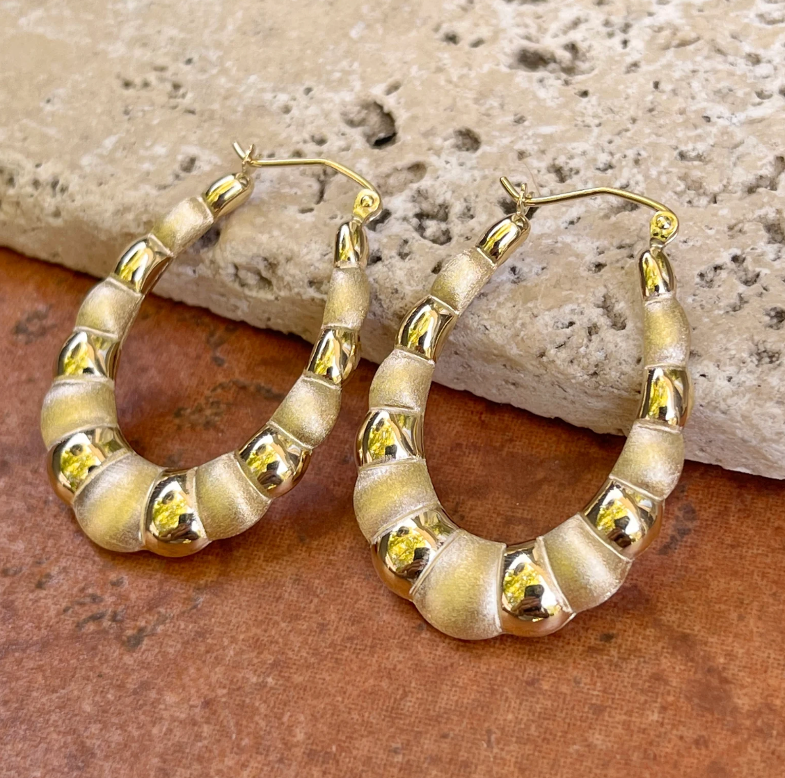 10KT yellow gold scalloped/ shrimp creole 3D, oval hoop earrings. Satin + polished-finish on alternating ribs.