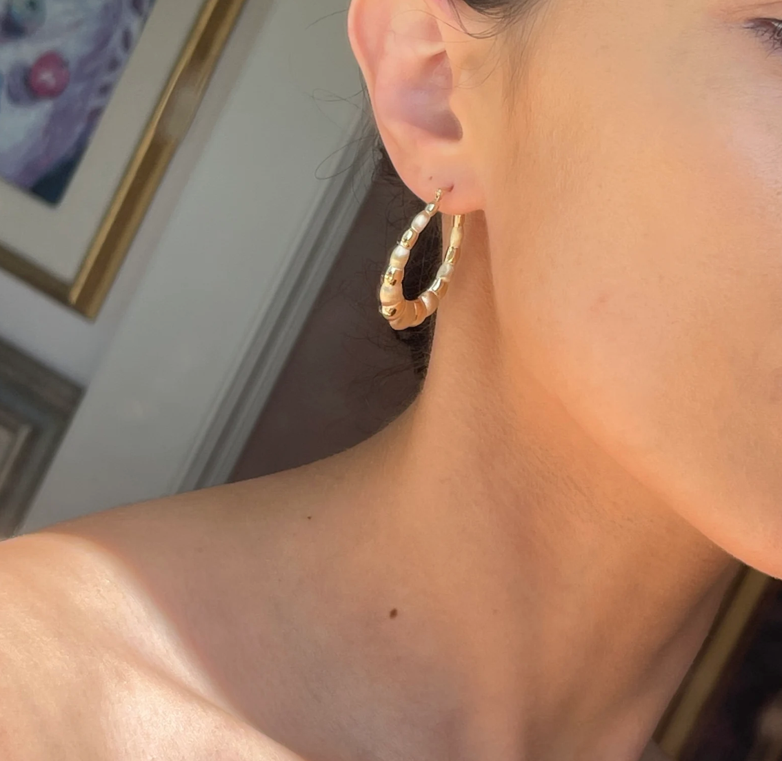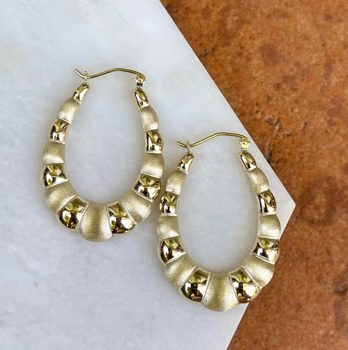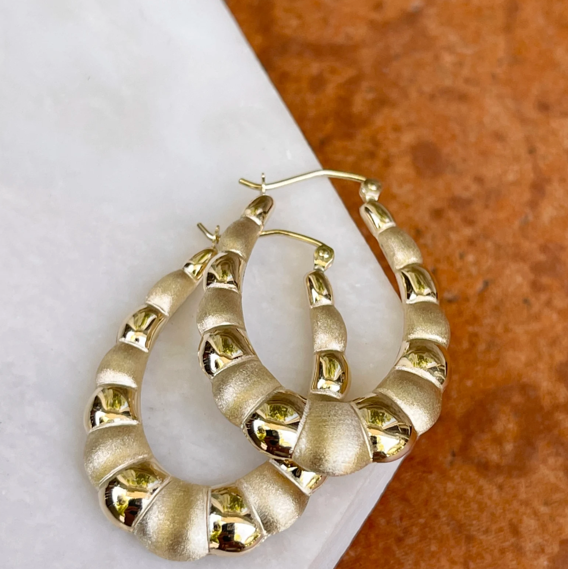 10KT yellow gold scalloped/ shrimp creole 3D, oval hoop earrings. Satin + polished-finish on alternating ribs.