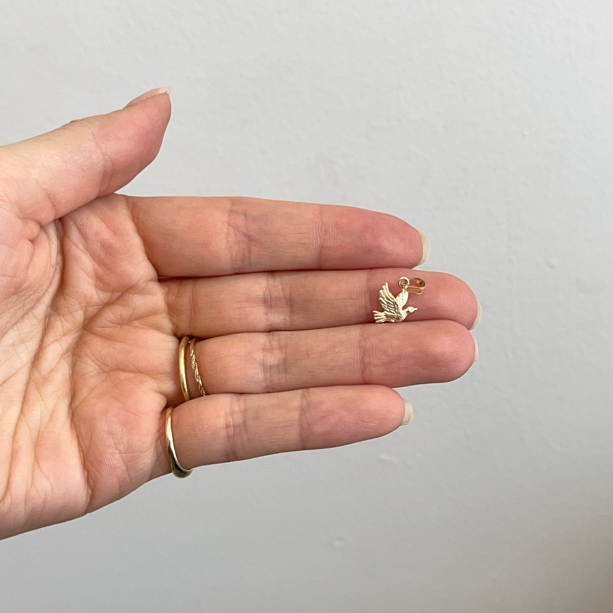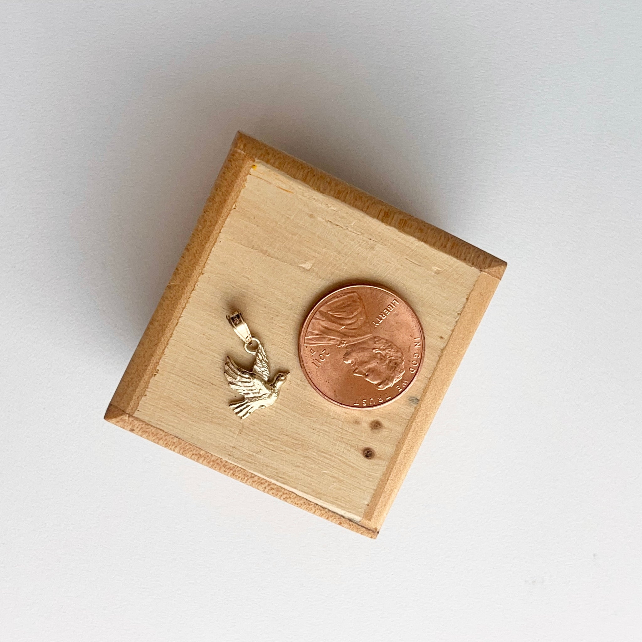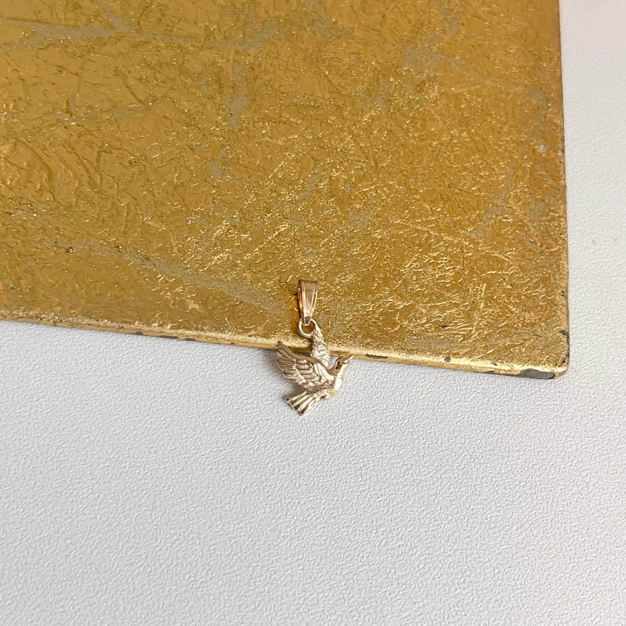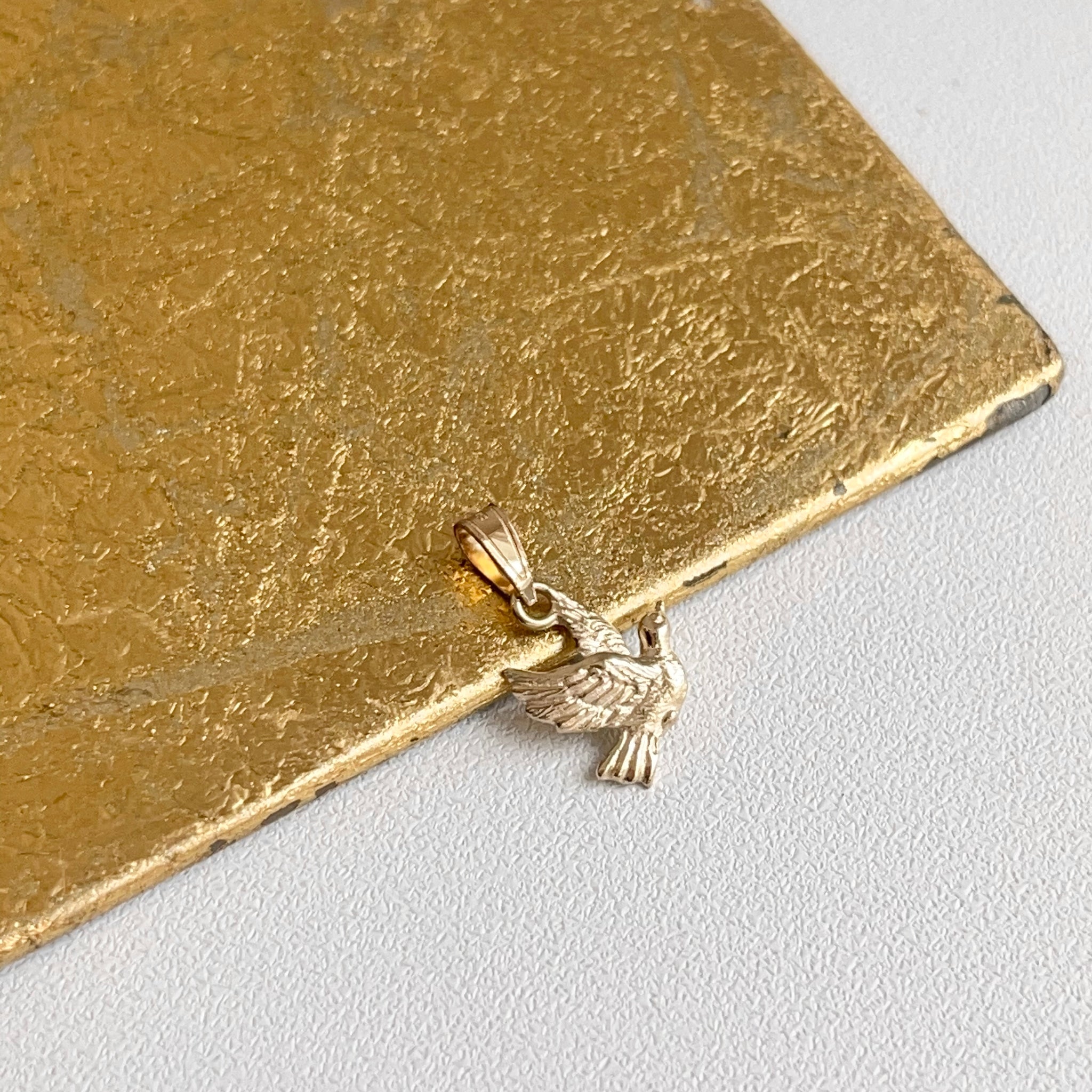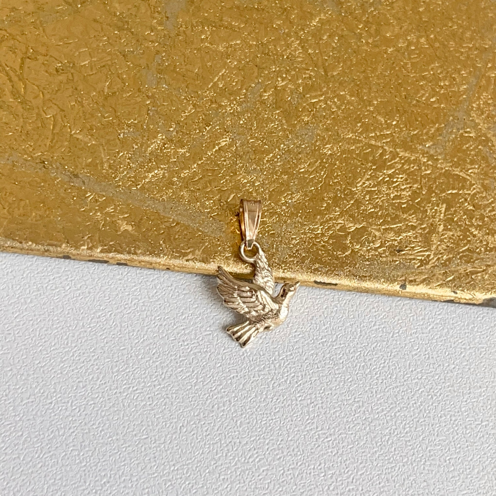 10KT yellow gold small flying dove textured pendant charm. The dove represents peace of the deepest kind! It soothes and quiets our worried or troubled thoughts, enabling us to find renewal in the silence of the mind.
