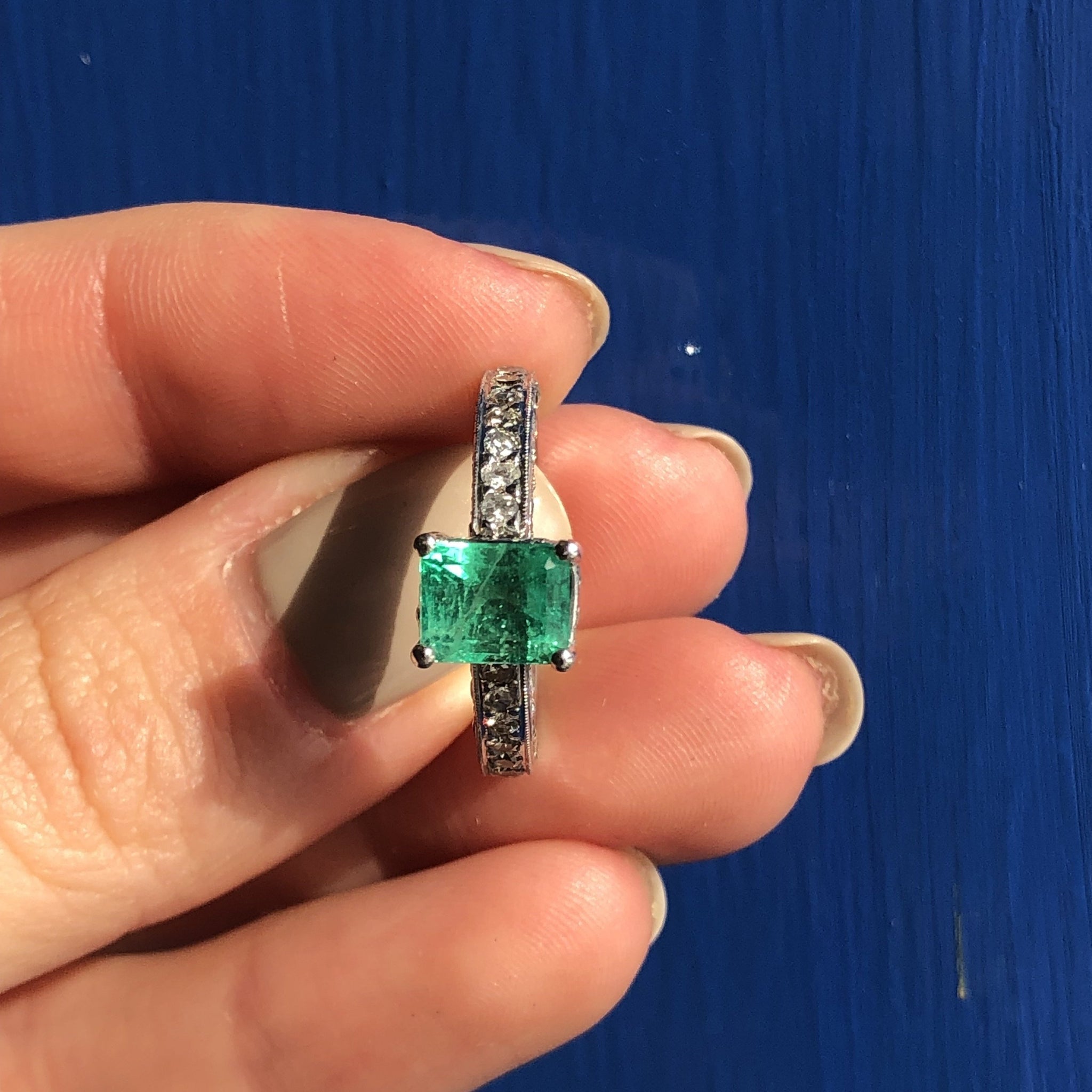 14KT white gold emerald cut emerald + pave diamond design estate ring. Ring is estate, emerald is new. Prong set in 14 KT white gold. Clarity SI + color G-H diamonds. Finger size 7 but could be sized up or down by your local jeweler or ours. Additional charges apply for sizing.