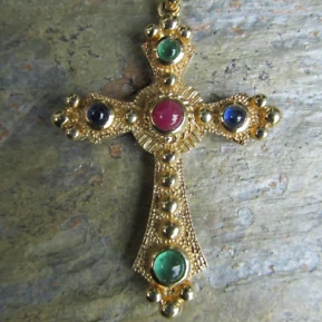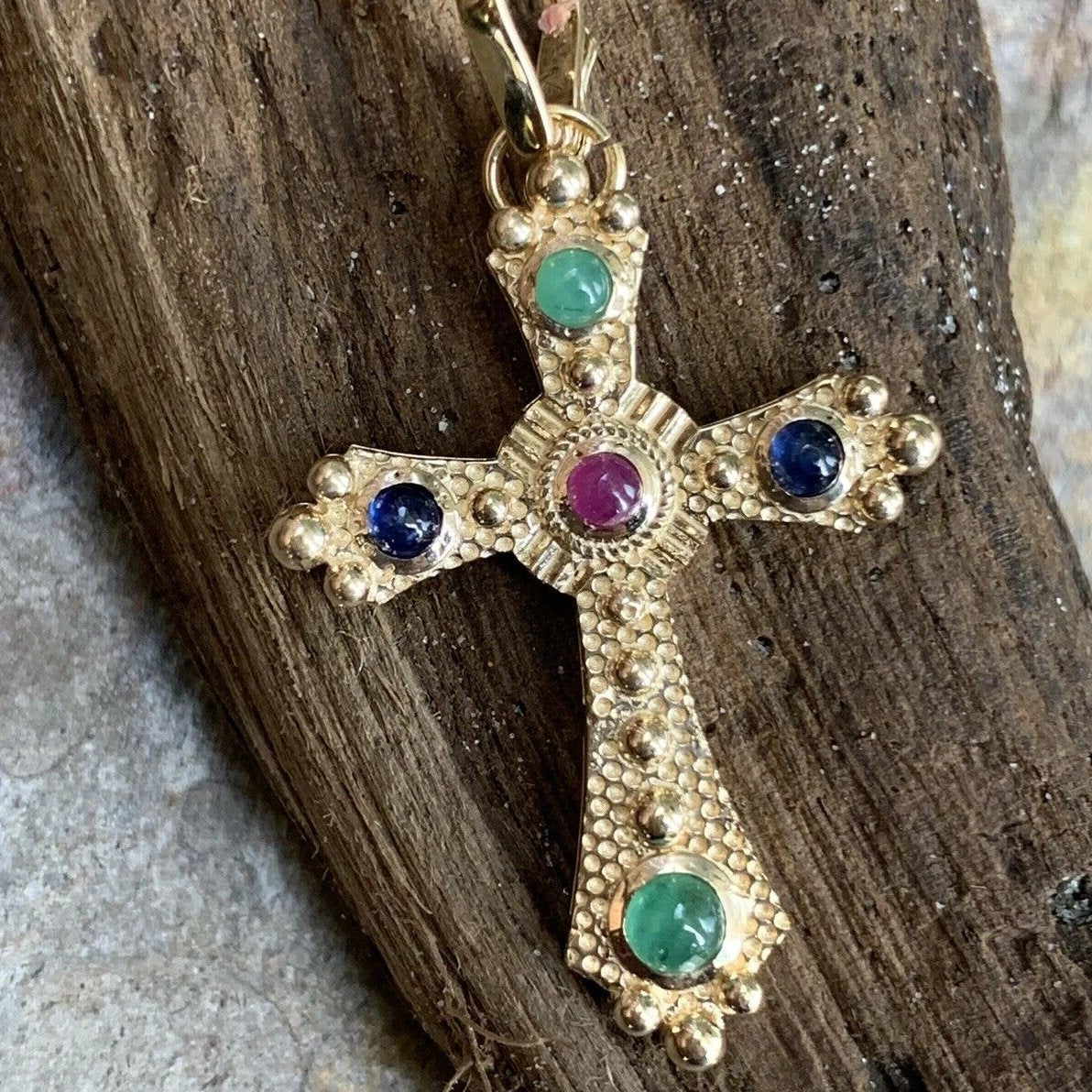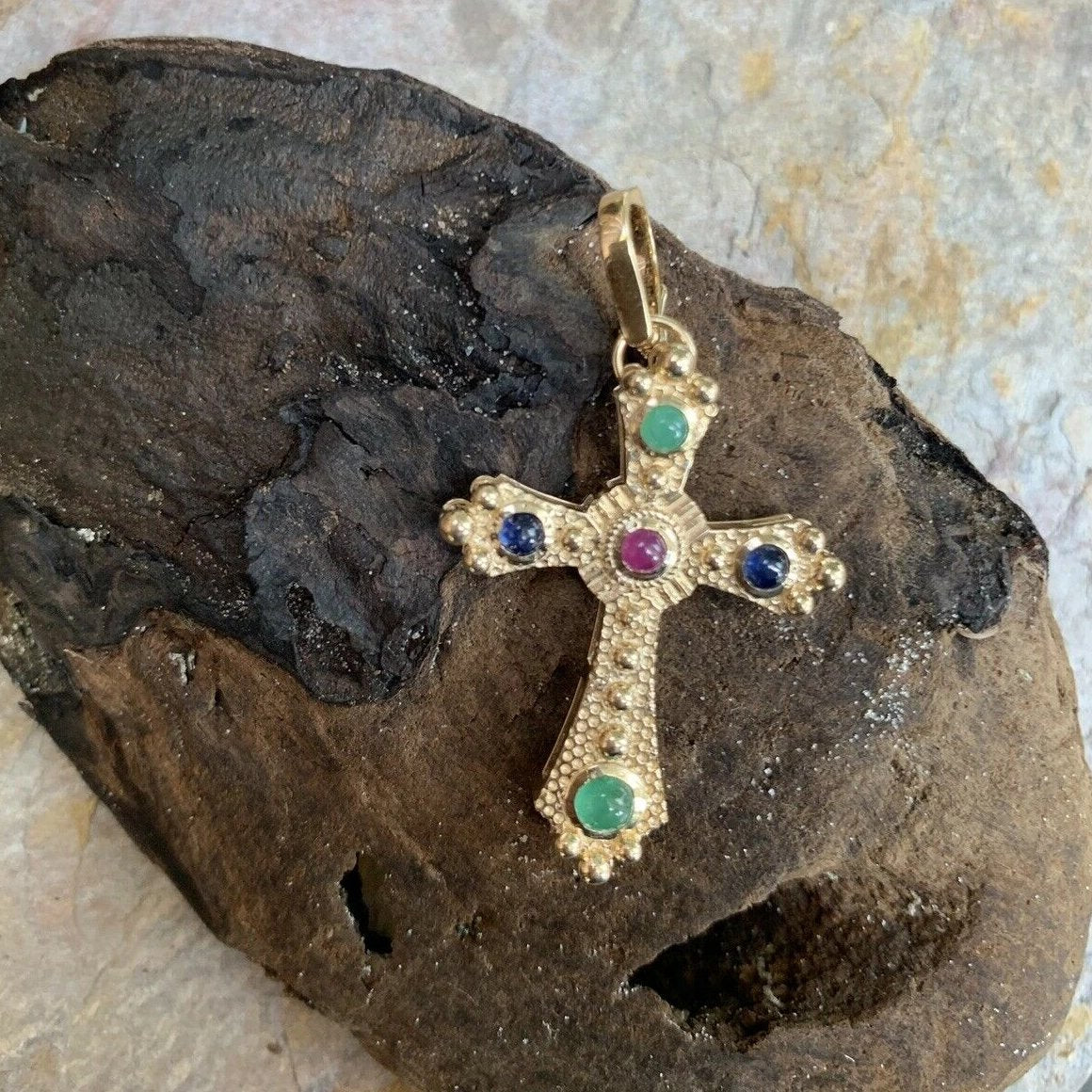 14KT yellow gold Etruscan style cross pendant with ruby, emerald, + blue sapphire. Features both matte + shiny finishes. Set with (3) 4mm round, cabochon, bezel-set gemstones. Chains sold separately.