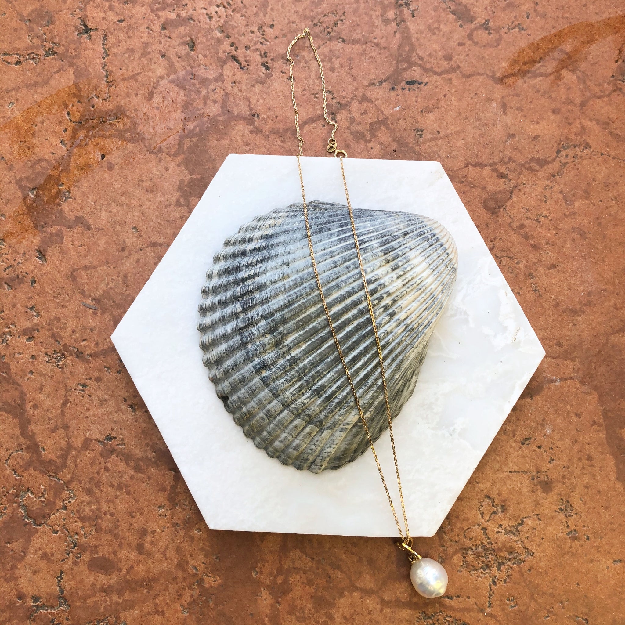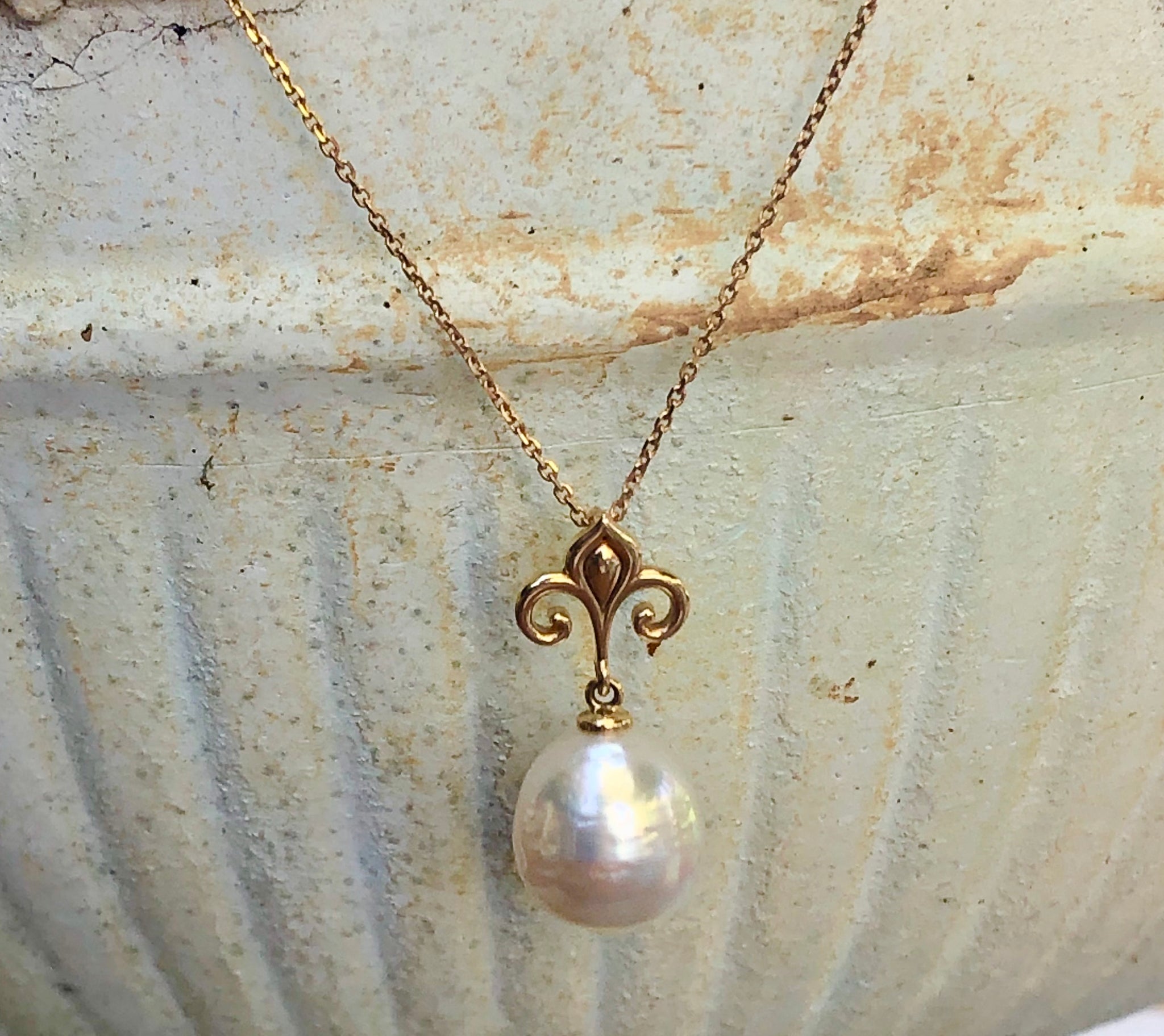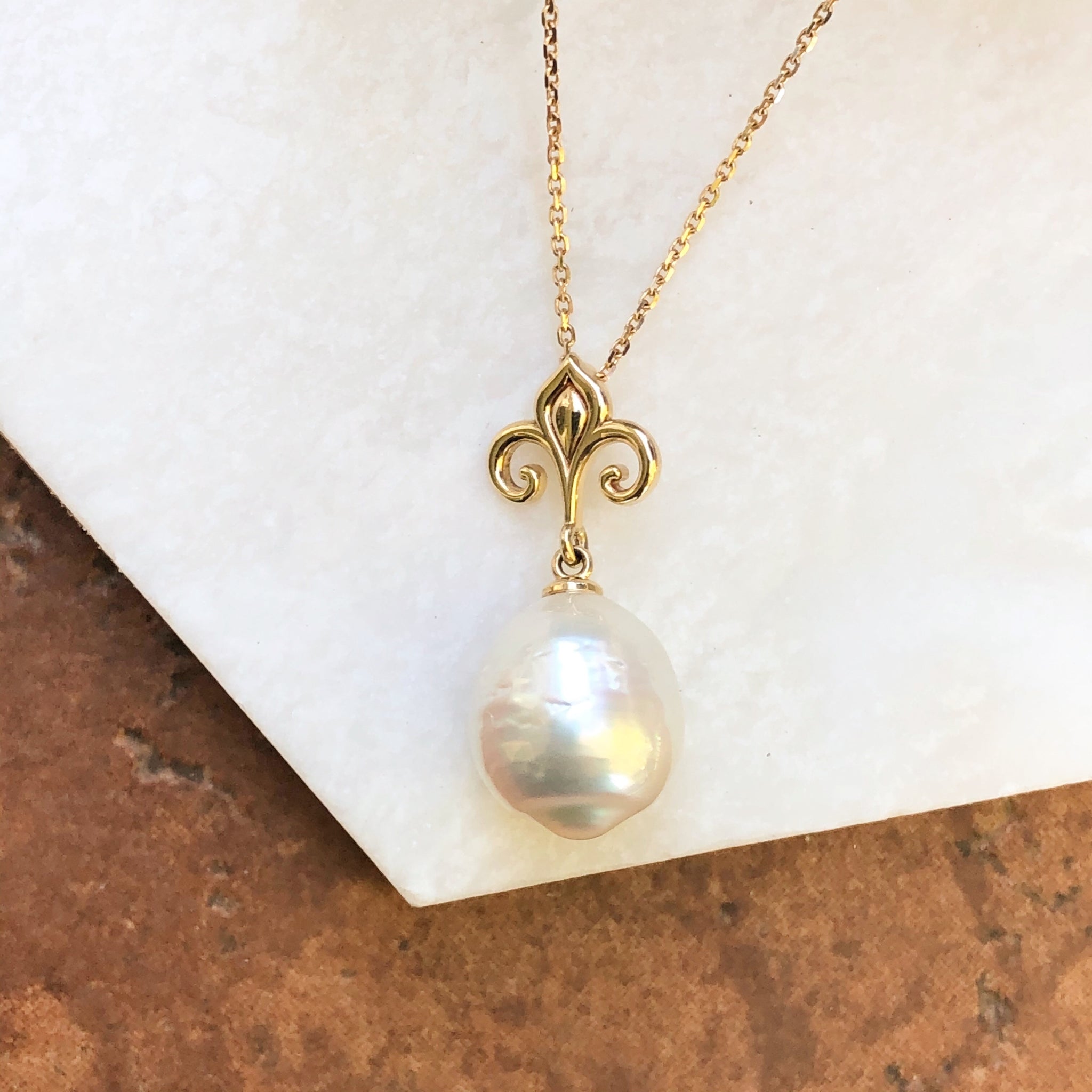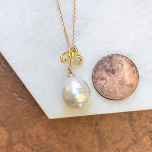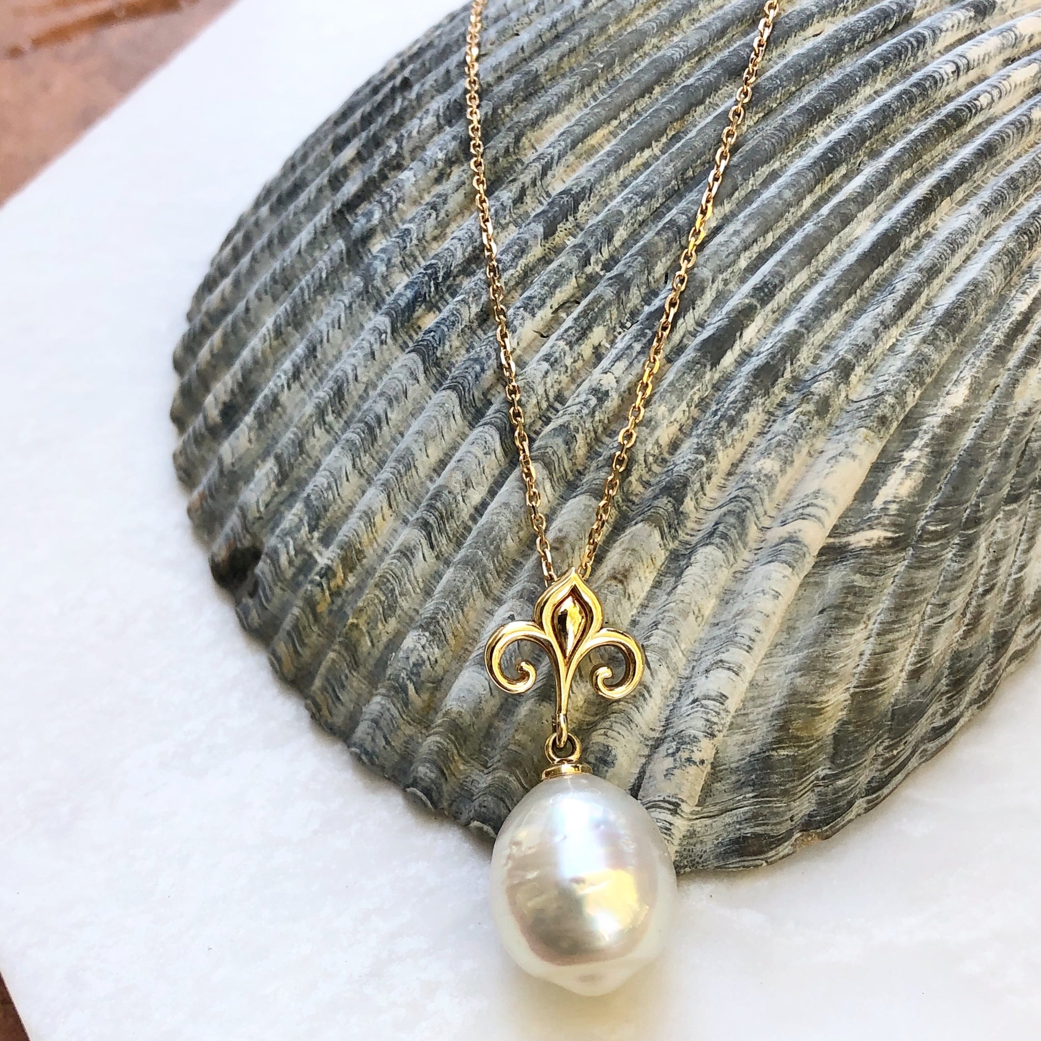 14KT Yellow Gold Paspaley Pearl Fleur de Lis Pendant Chain Necklace 18"