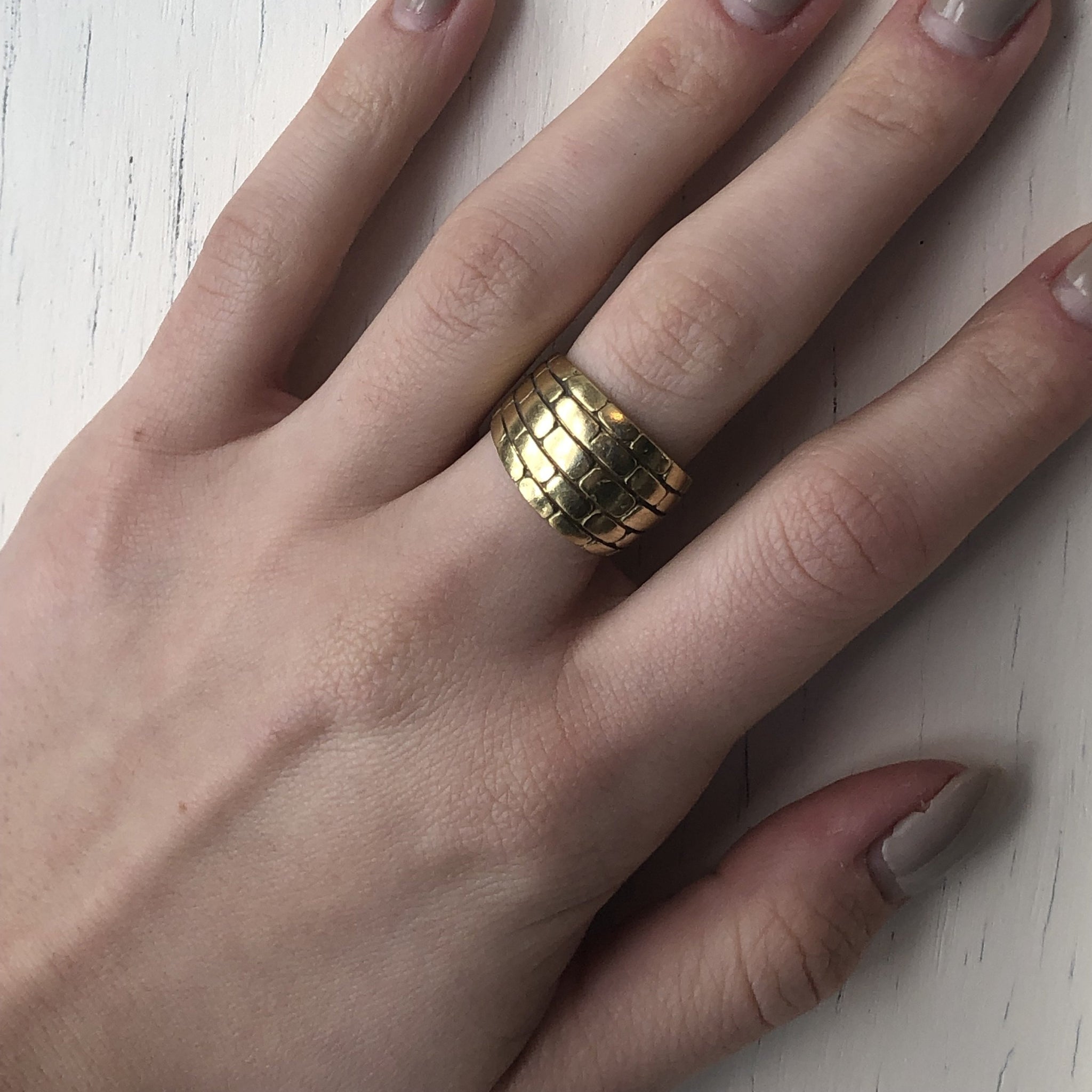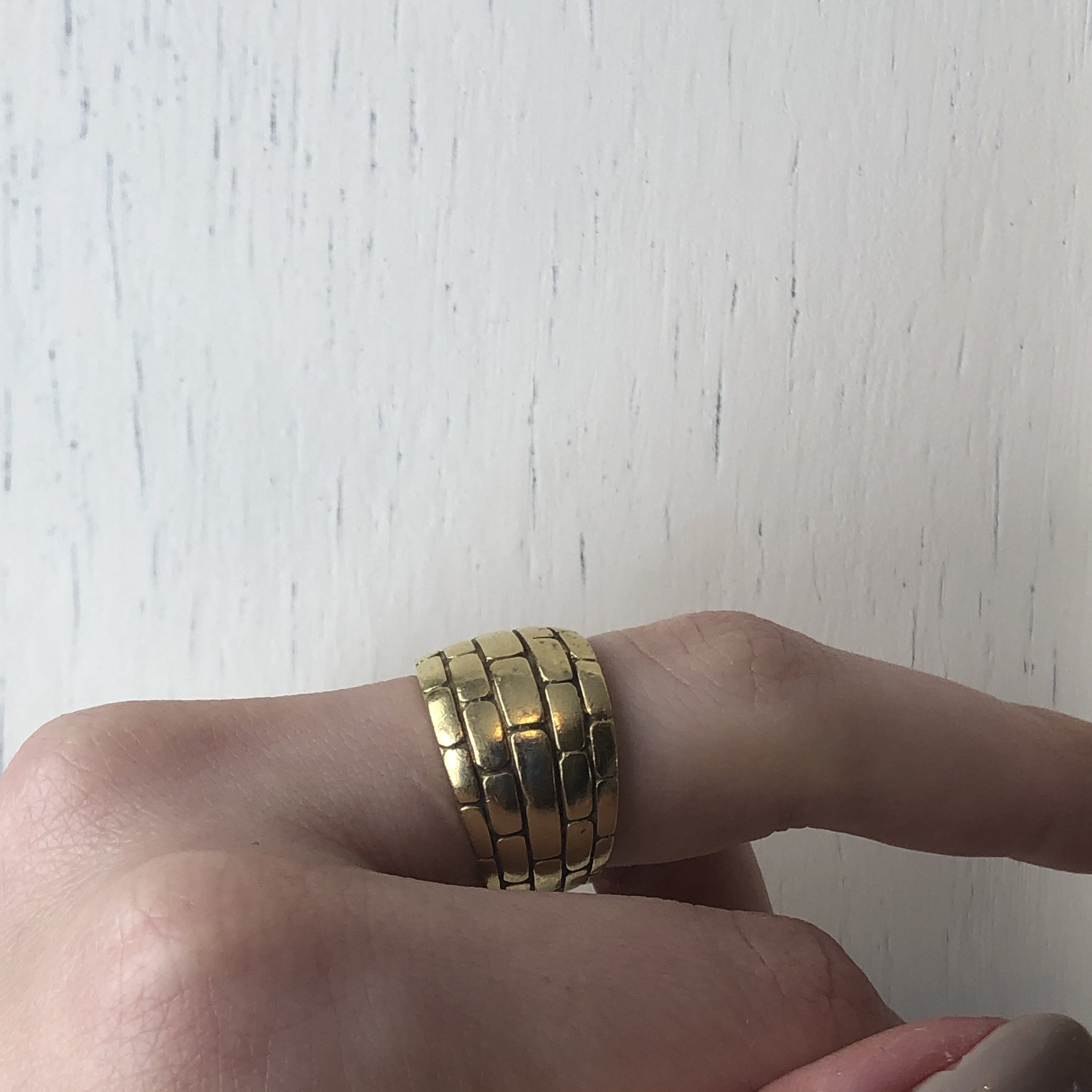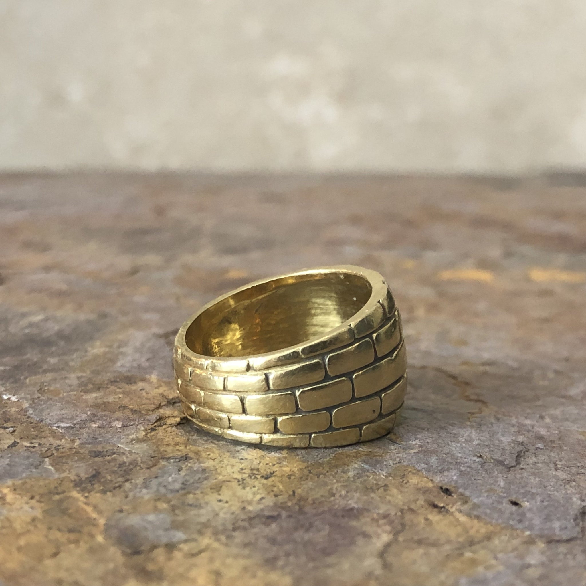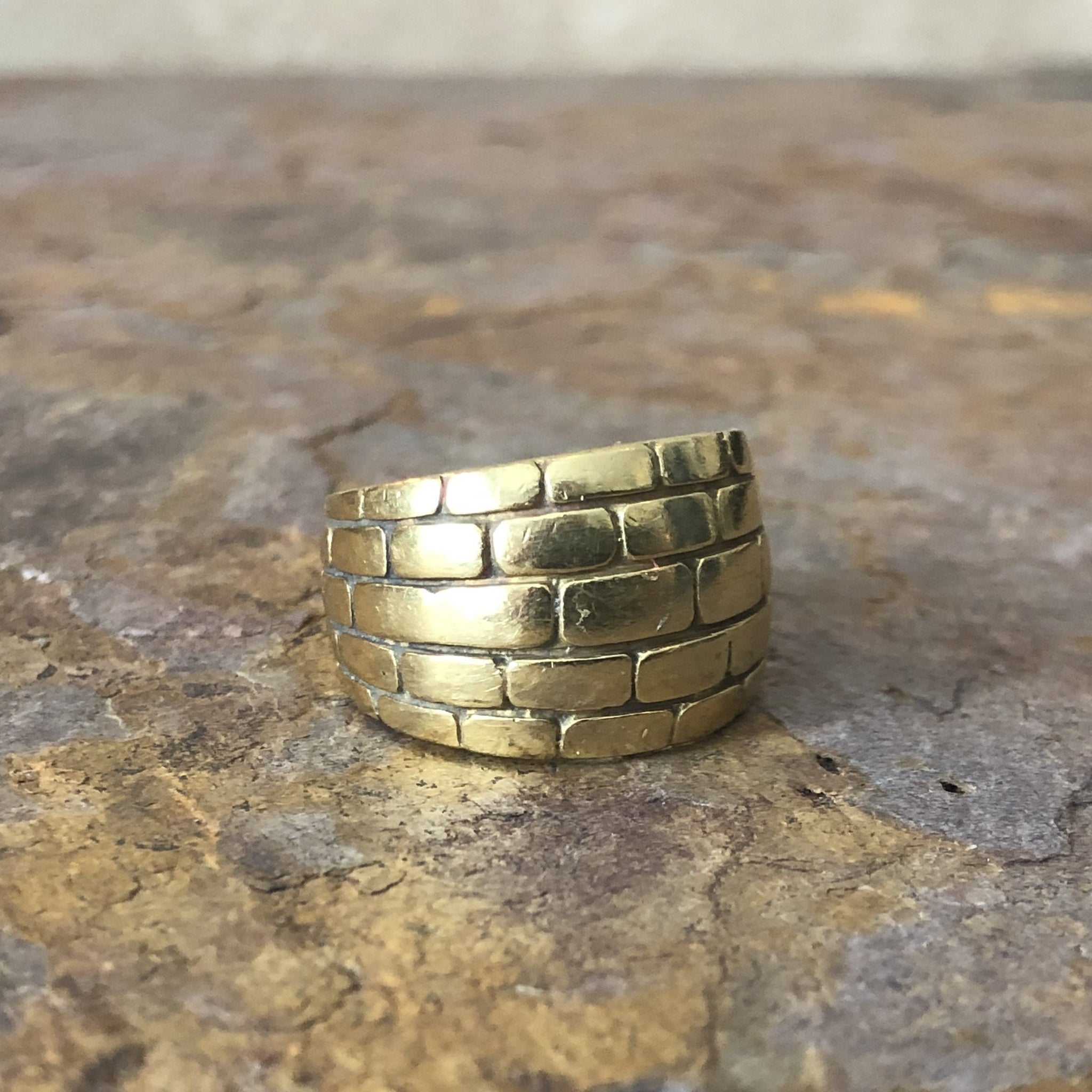 18KT yellow gold wide brick design cigar band custom designed. Cigar band style made solid, high polished, 18KT yellow gold in a unique, brick-work design pattern. Pattern goes completely around the ring, unless requested otherwise. Listing is for the order of this ring. Takes about 10 business days or less to create.