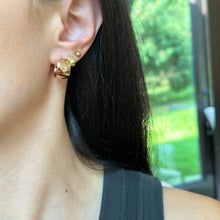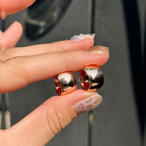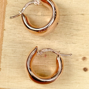 14KT rose gold wide + chunky huggie hoop earrings. Yummy chunkiness to these hoops with slight tapering. These are 14K solid gold- not plated nor filled. They are hollow in nature (meaning lightweight), which is great for all day wearing!