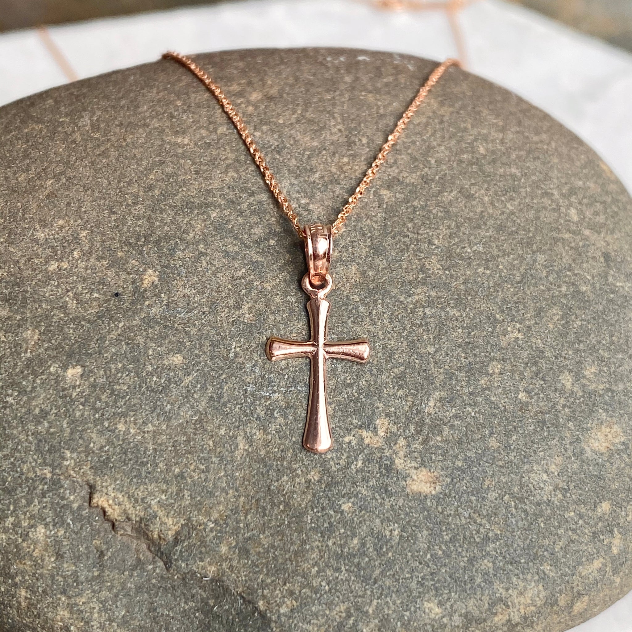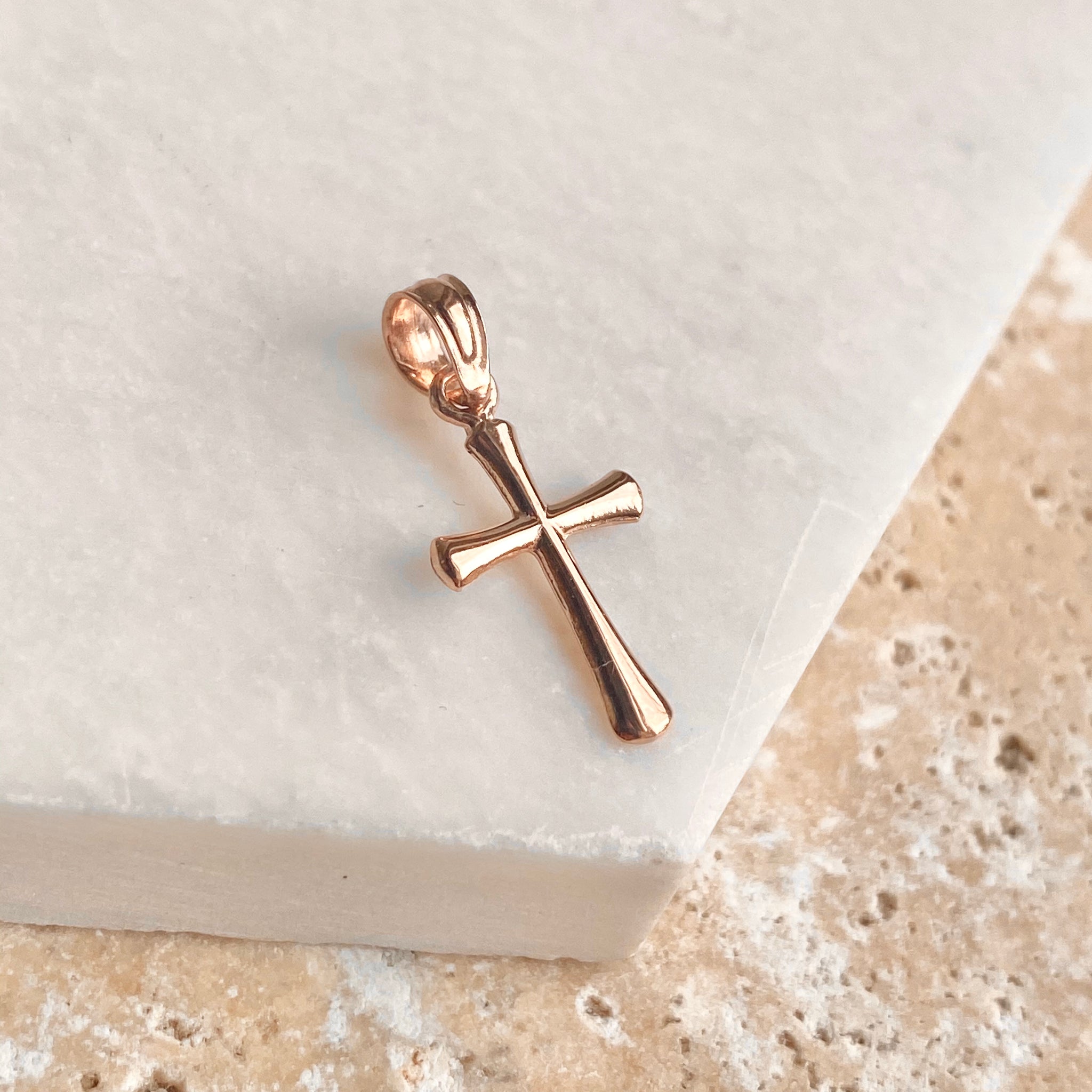 14KT rose gold beveled cross pendant charm. Simply slide this pretty charm on a thin chain necklace or add it onto a charm bracelet! Chains sold separately.