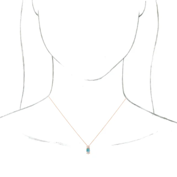 14KT rose gold necklace with round blue zircon + white diamonds. The beautiful blue zircon really picks up its color when set in contrasting rose gold.