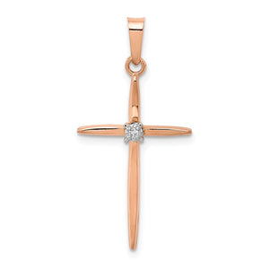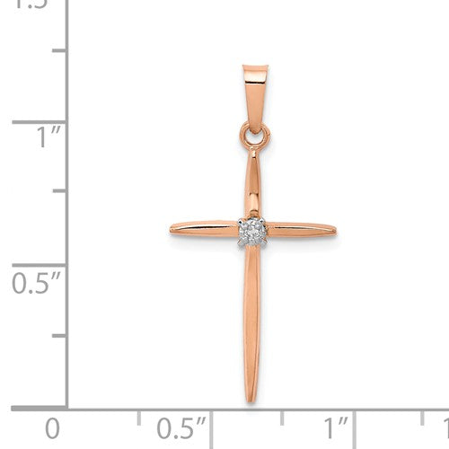 14KT rose gold cross pendant charm with a sparkling diamond. Beautiful, little charm to slide onto a thin, rose gold chain! Necklace chain sold separately.