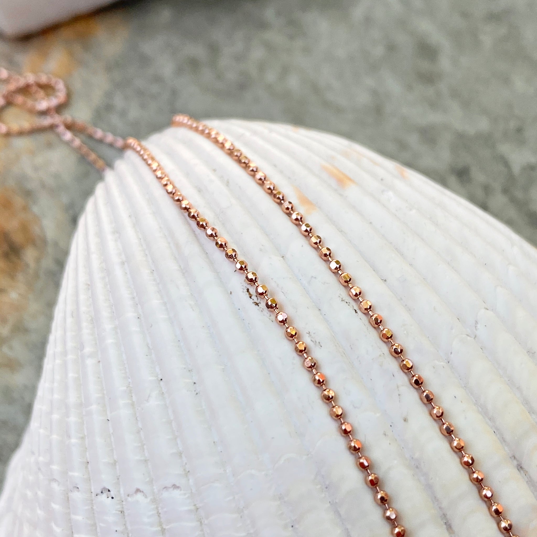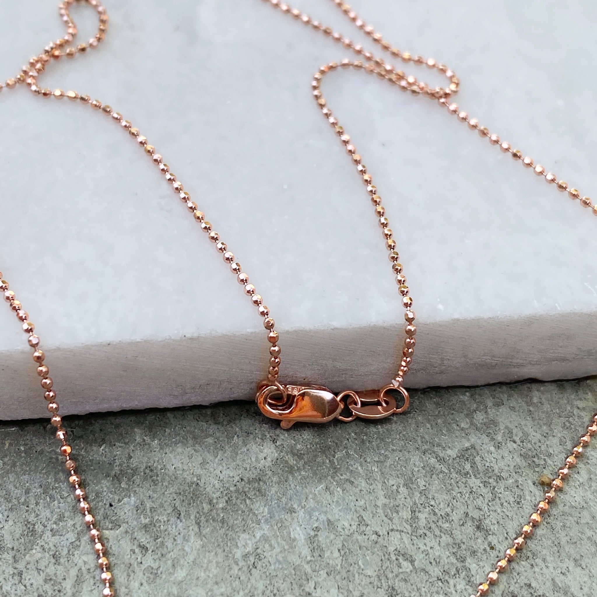 14KT rose gold diamond-cut beaded ball link chain necklace. Beautiful, sparkling chain that is perfect for pendants! Pendant shown is sold separately.