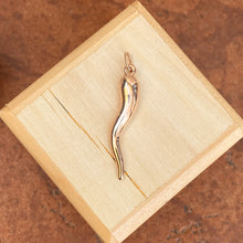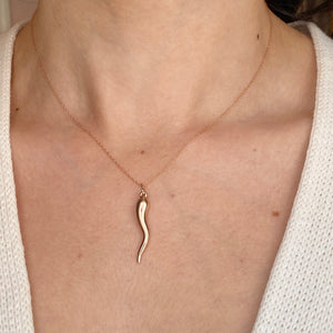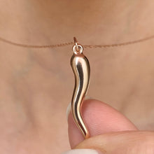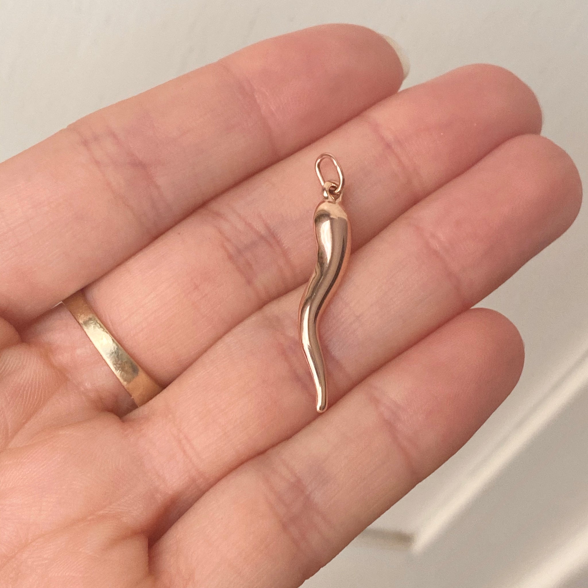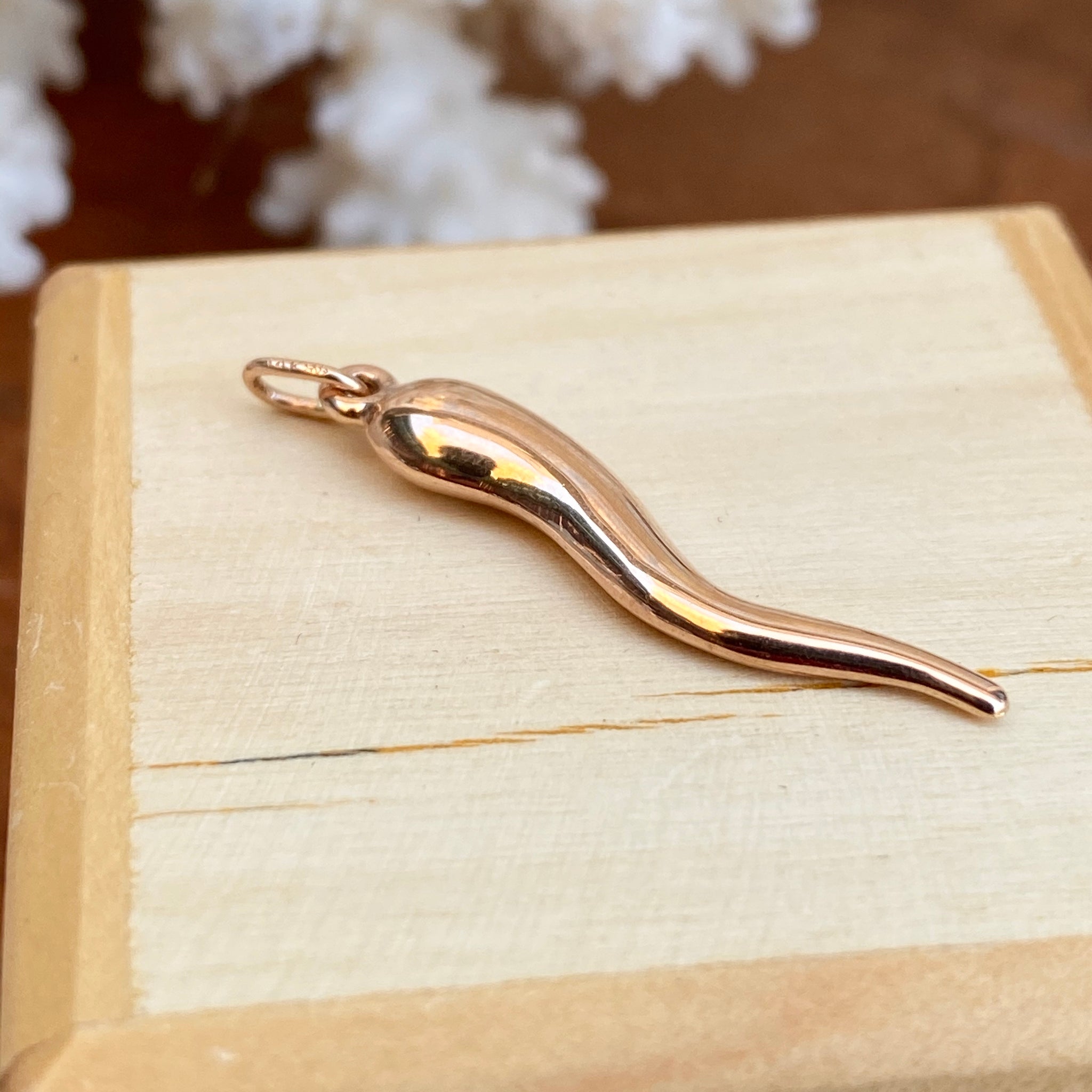 14KT rose gold medium-sized Italian horn "Cornicello" pendant charm. Symbol of Italy worn to protect against evil. Cornicello: meaning little horn in Italian. Great charm to slide onto a thin, rose gold necklace chain. Chains sold separately.