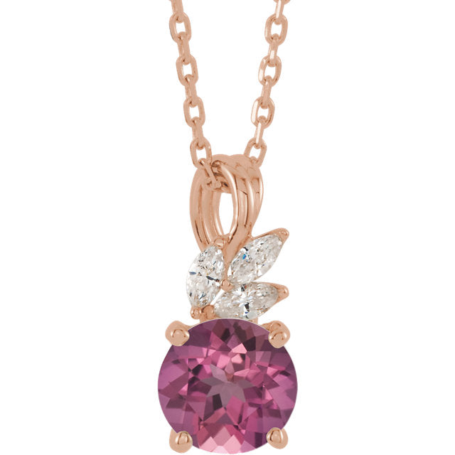 14KT rose gold necklace with round pink tourmaline + white, marquise diamonds.