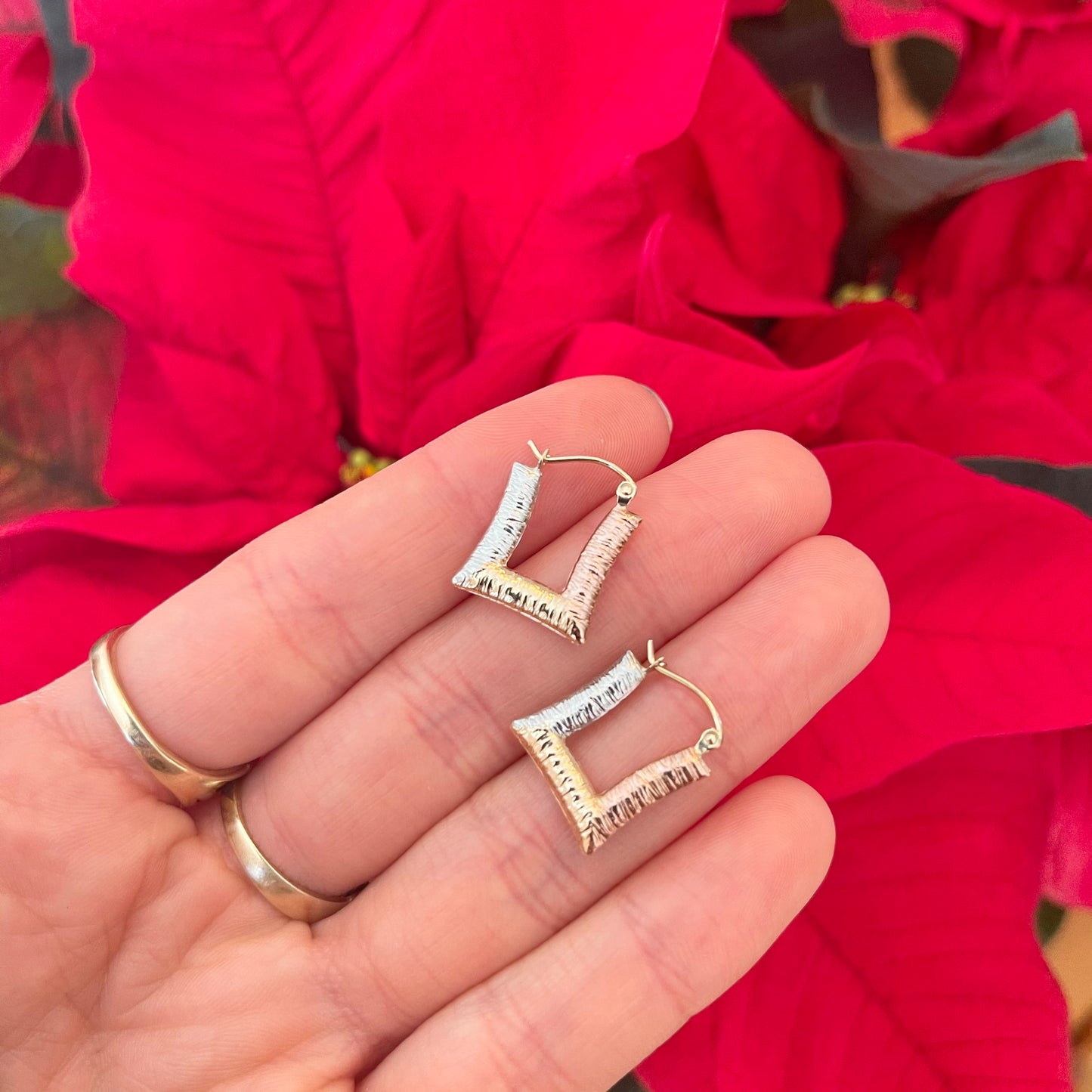 Tri-Color 14KT rose gold, white gold, + yellow gold textured square design hoop earrings. Rare, tri-gold hoops your can mix + match with other gold jewelry!