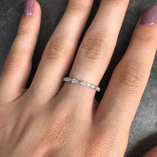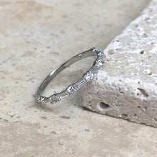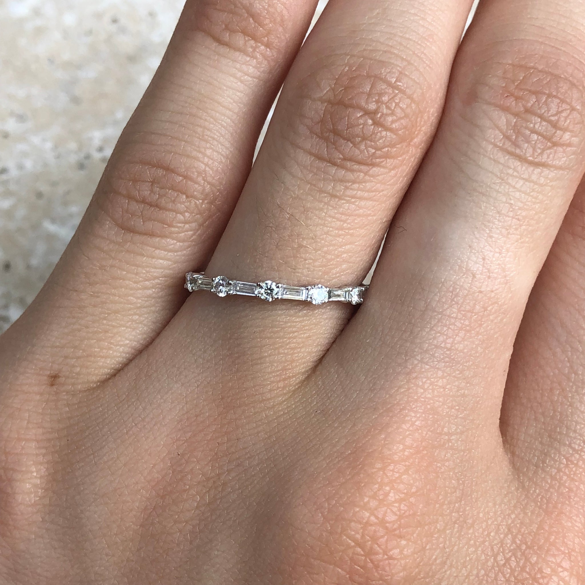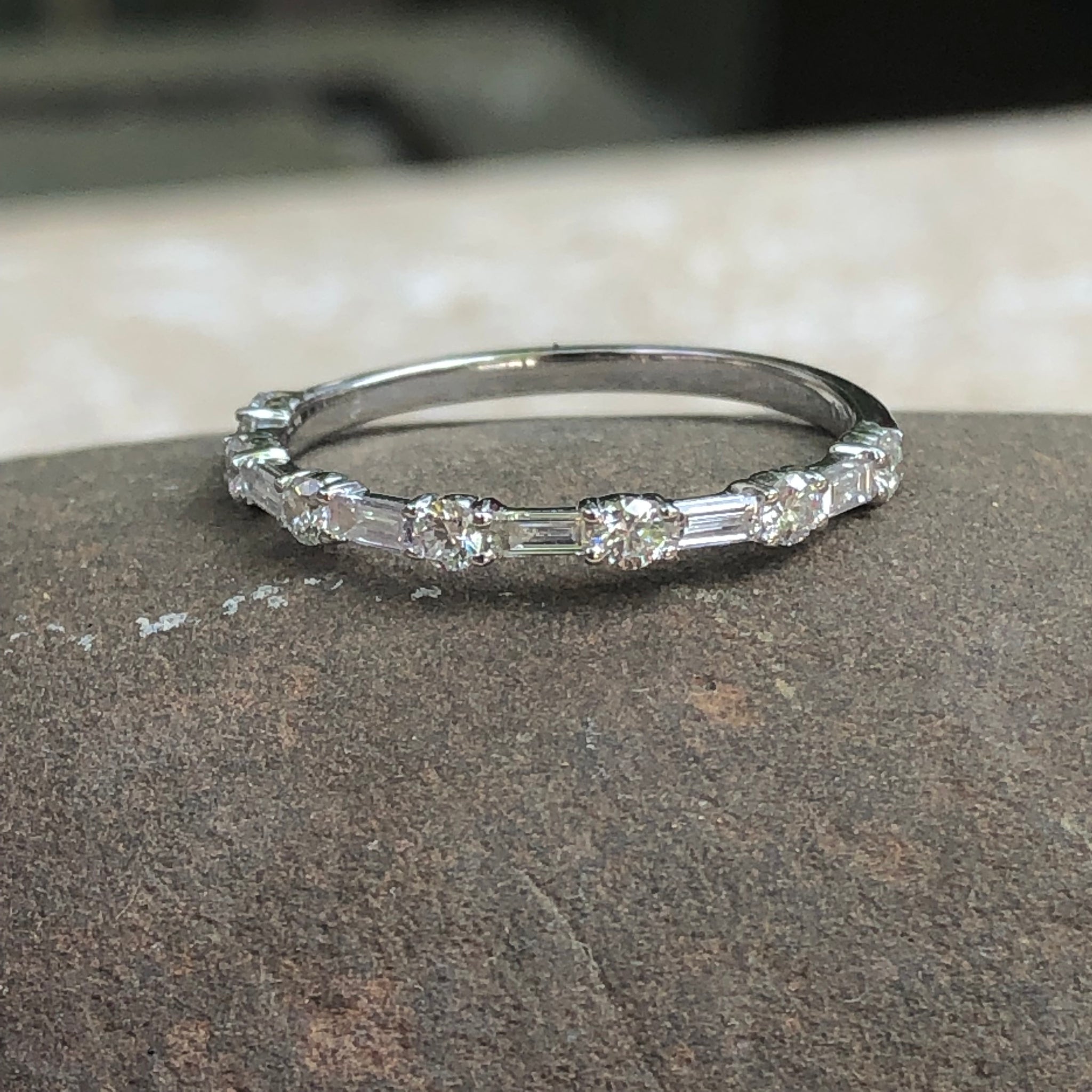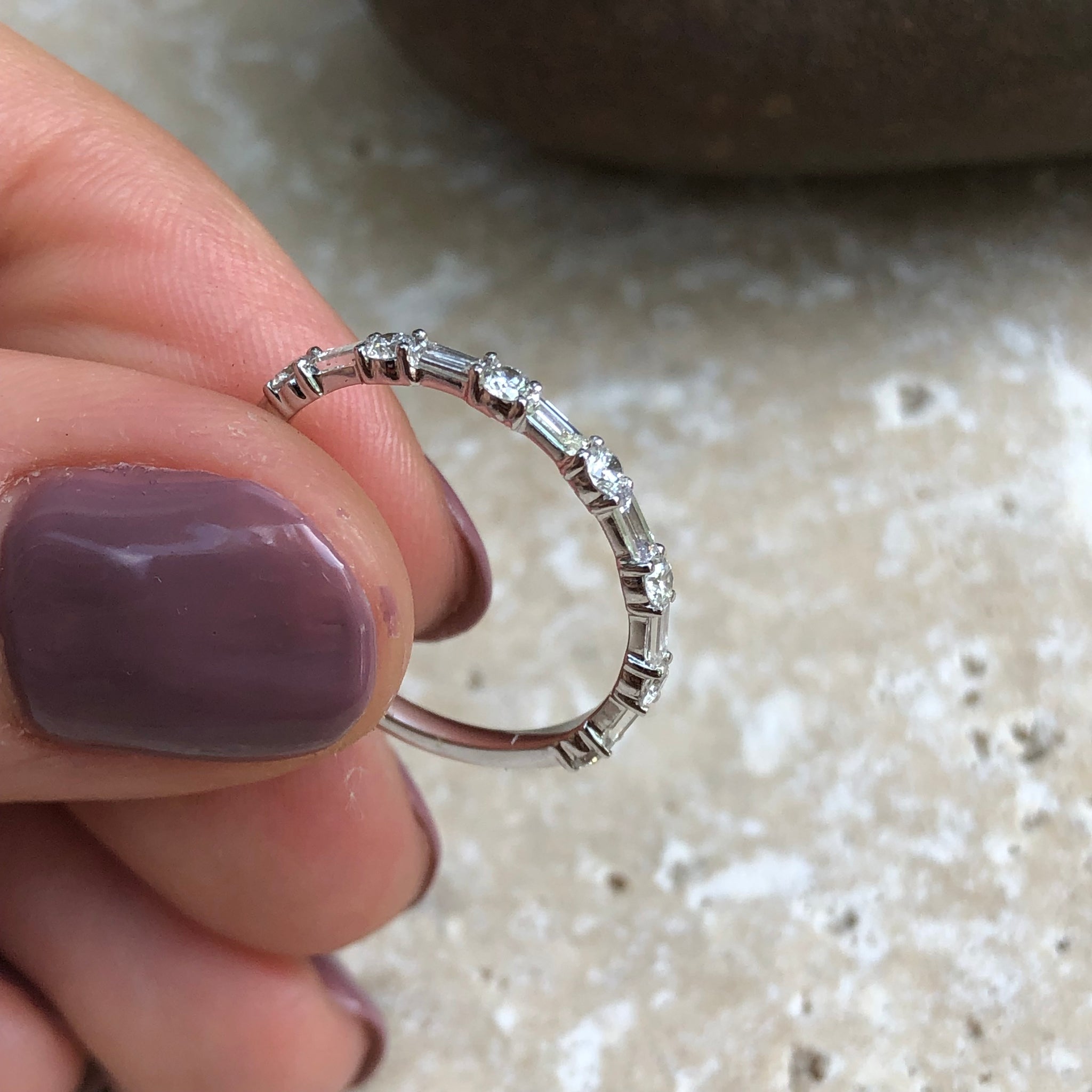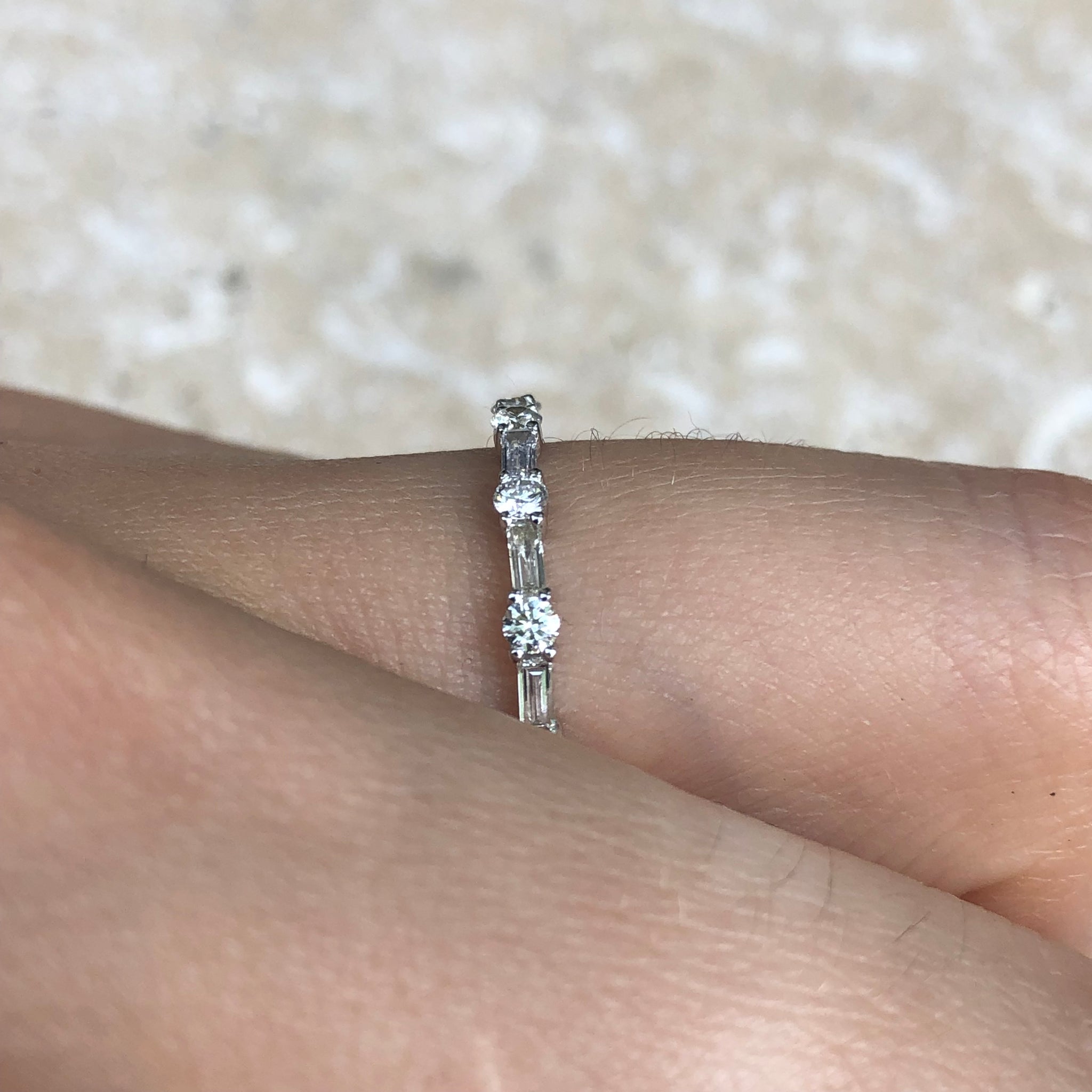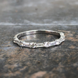 14KT polished white gold + straight baguette diamond anniversary wedding band ring.