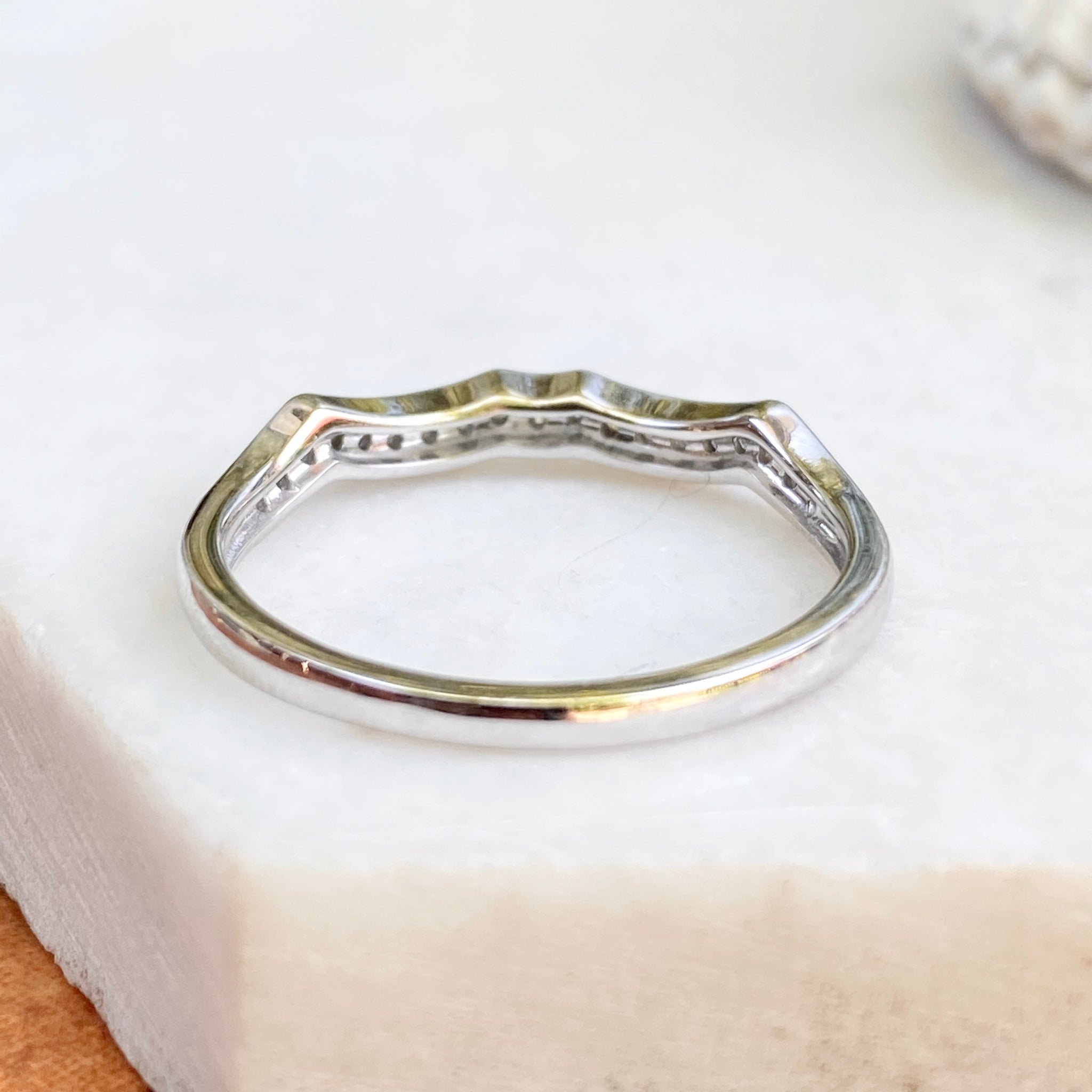 Polished 14KT white gold wave style band diamond ring. Perfect as a modern style wedding band or accompaniment to another ring!