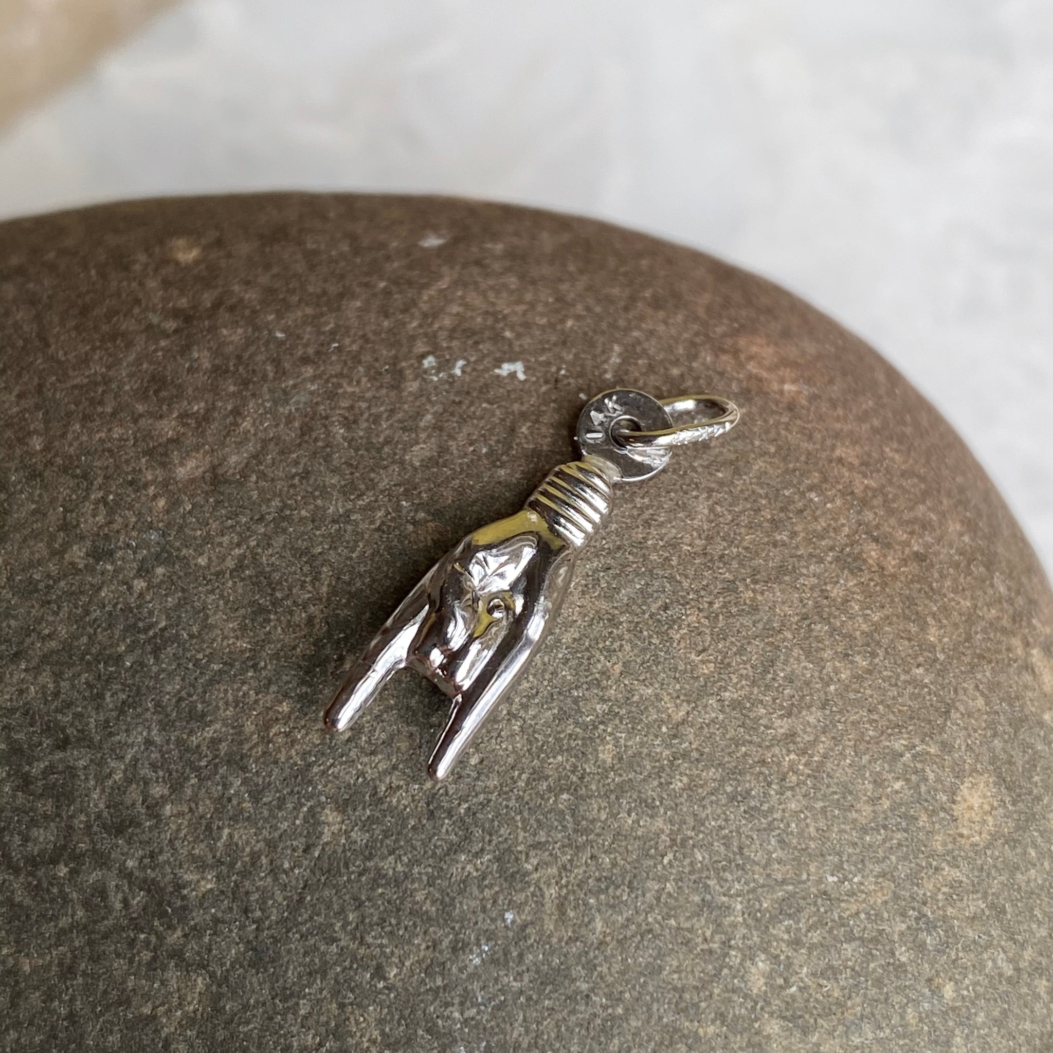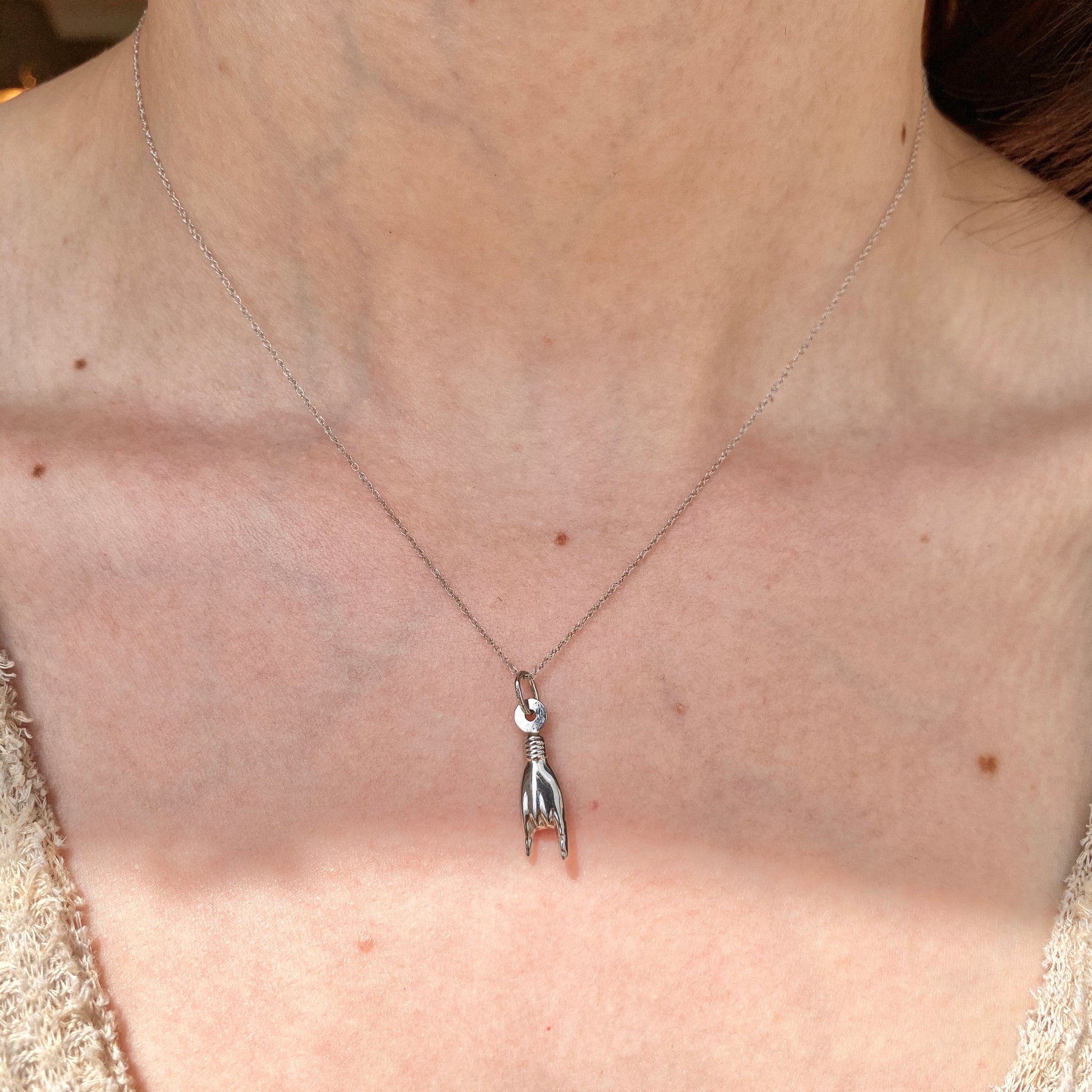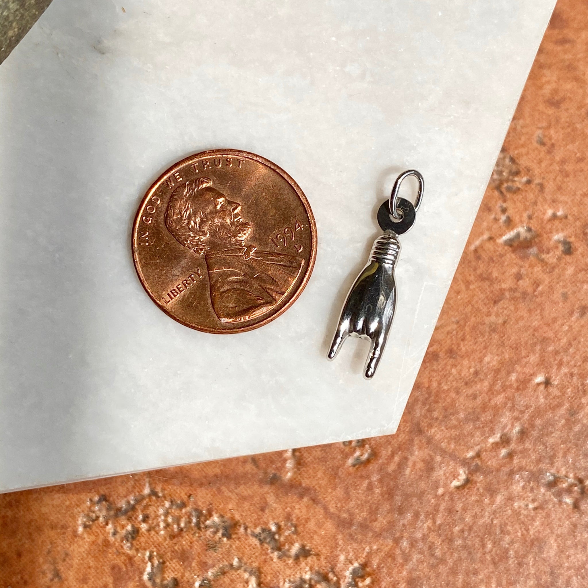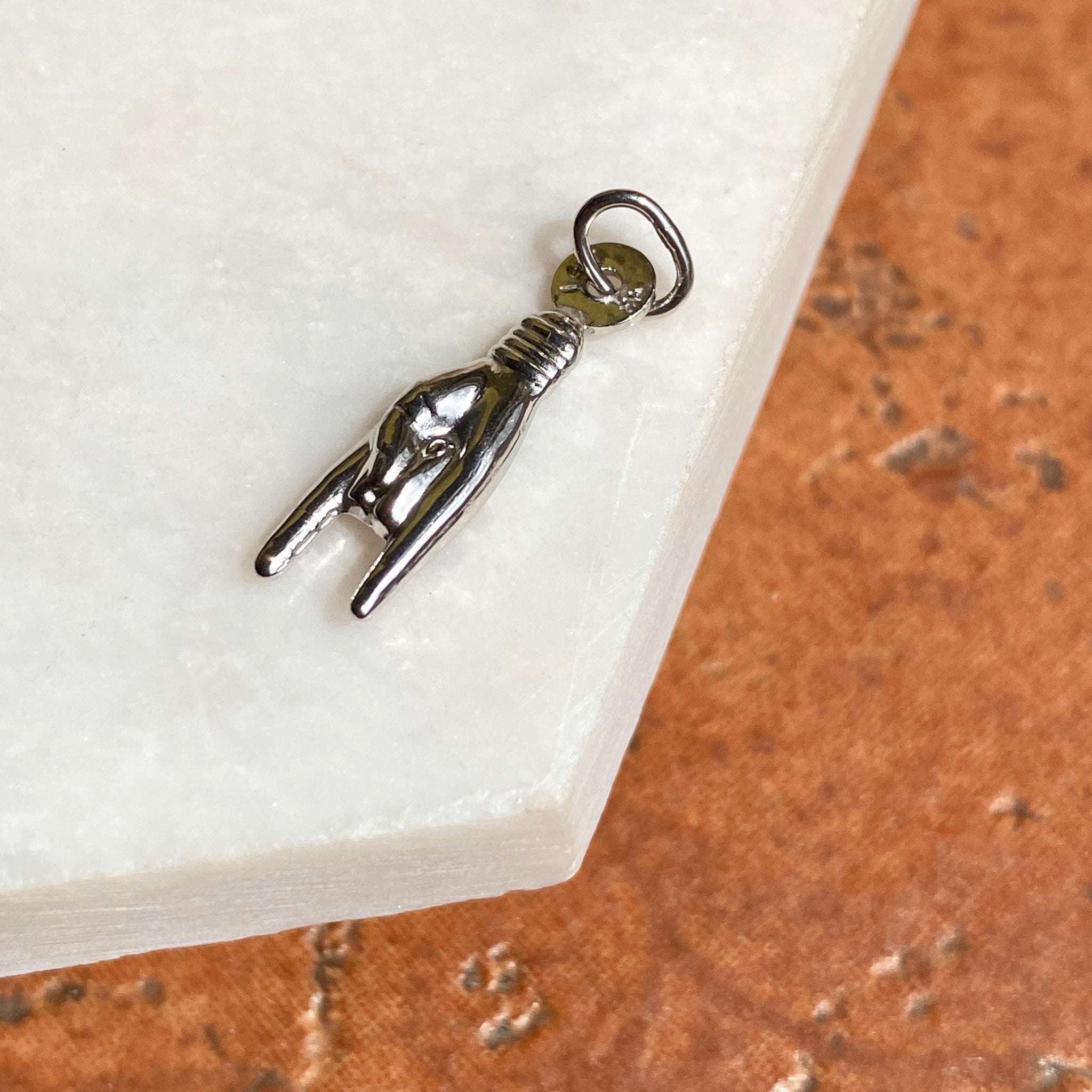 14KT white gold 3D Italian "Mano Cornuto" pendant charm. "Mano Cornuto" is Italian for "horned hand". The charm represents a hand gesture in which the index and little fingers are extended while the middle and ring fingers are curled into the palm. The reference is to the horned head of an animal. The Mano Cornuto is often worn to provide protection from the evil eye or bad energies. Simply slide this small pendant on a thin chain or add it to a charm bracelet! Also available in 14K yellow gold and sterling silver.