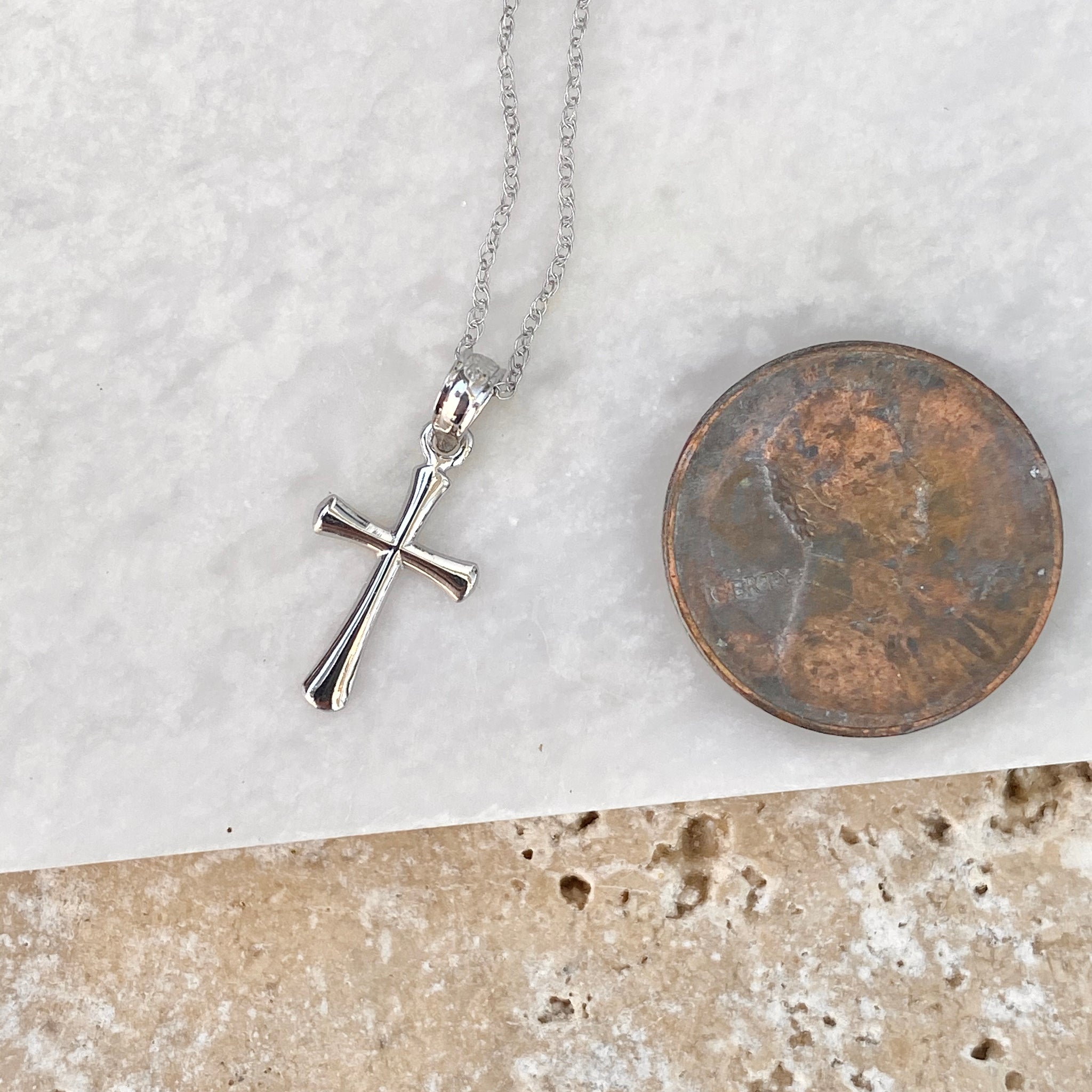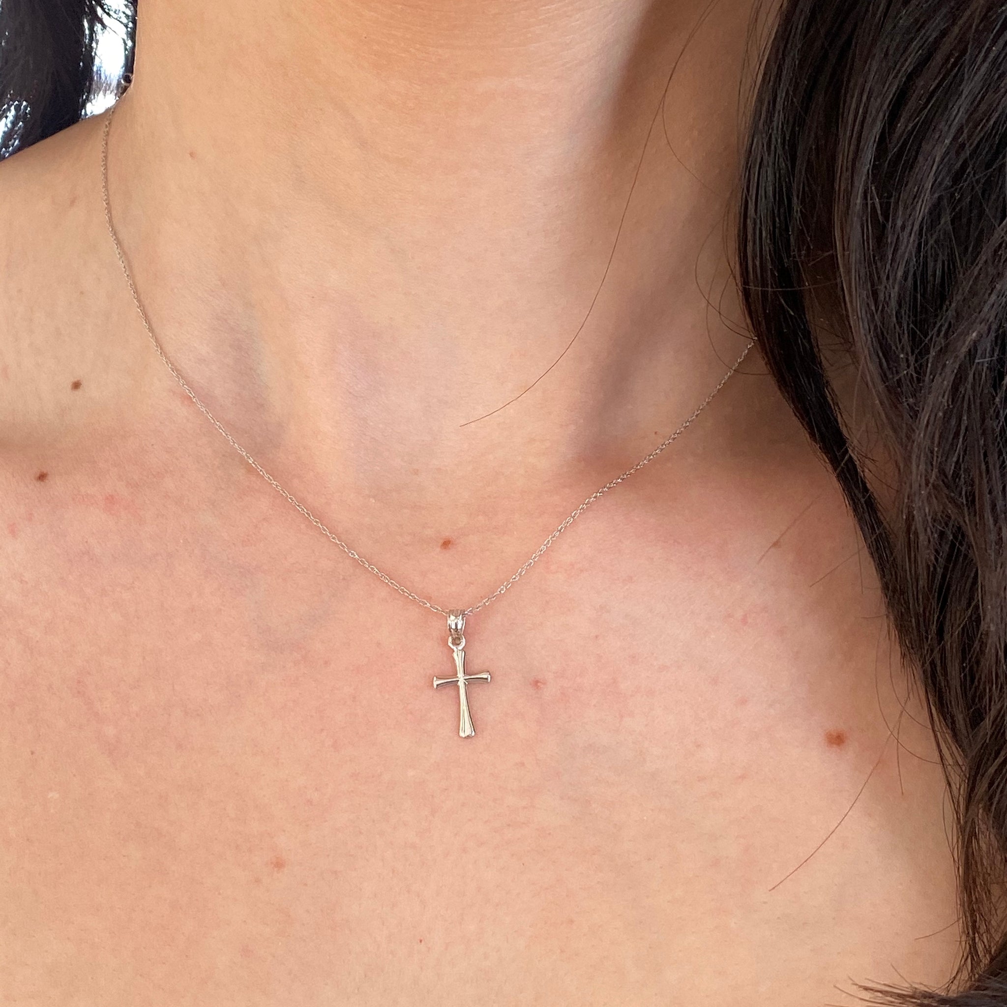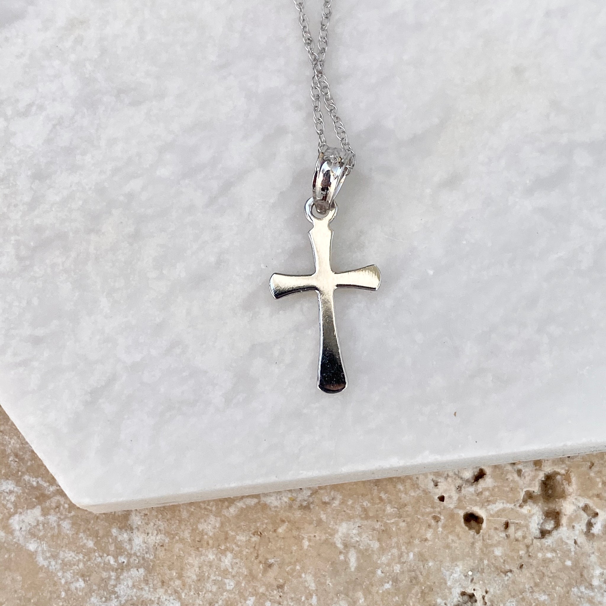 14KT white gold small beveled cross pendant on a thin, 14KT white gold cable chain necklace. Pretty + lightweight cross necklaces makes a beautiful everyday necklace!