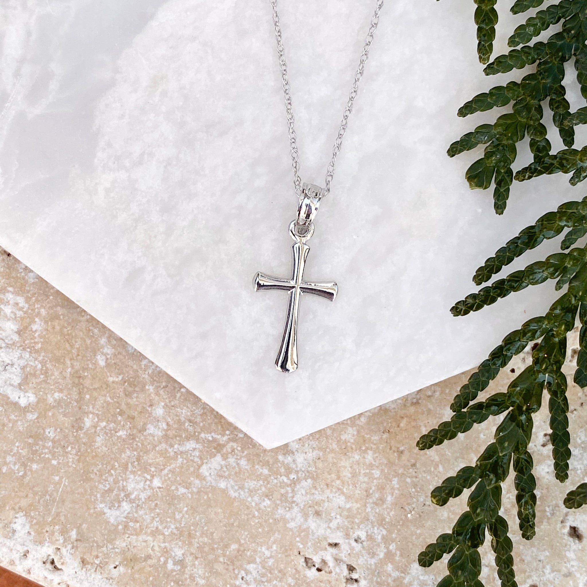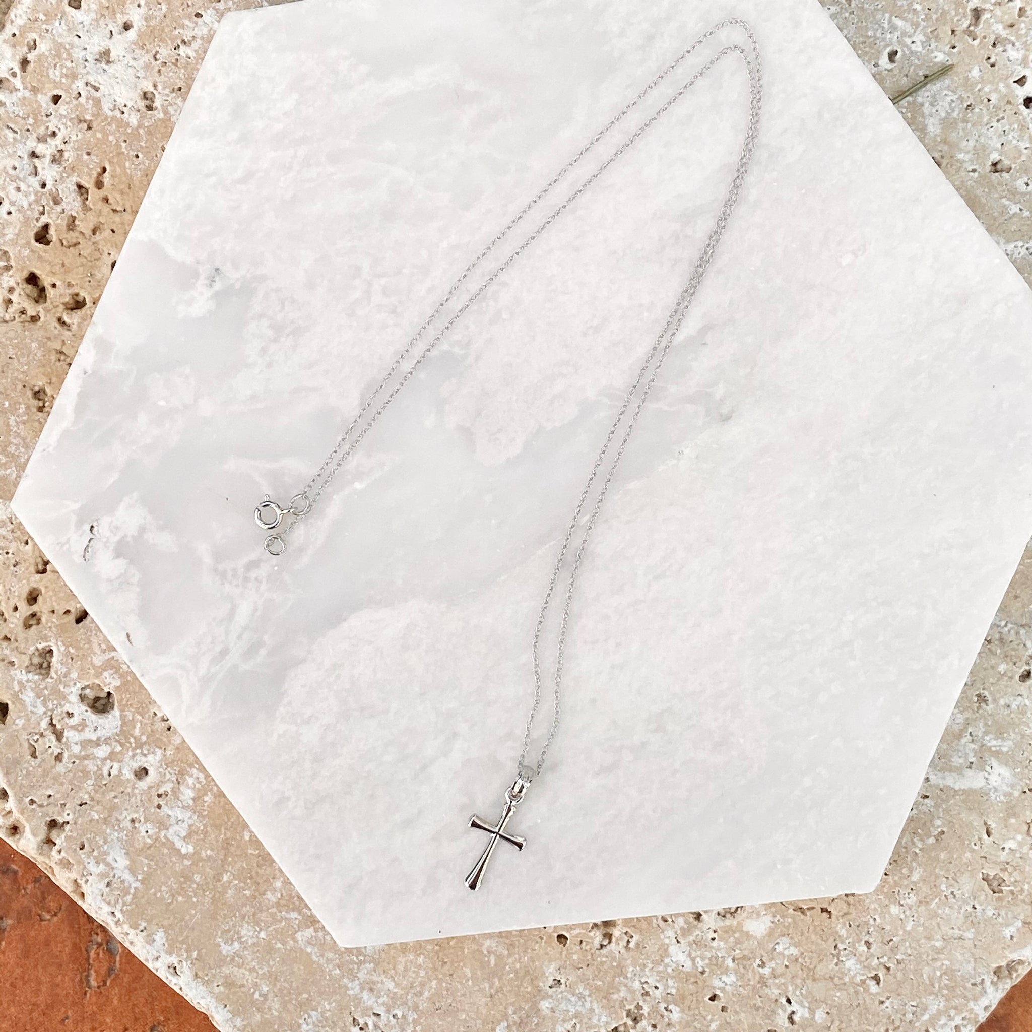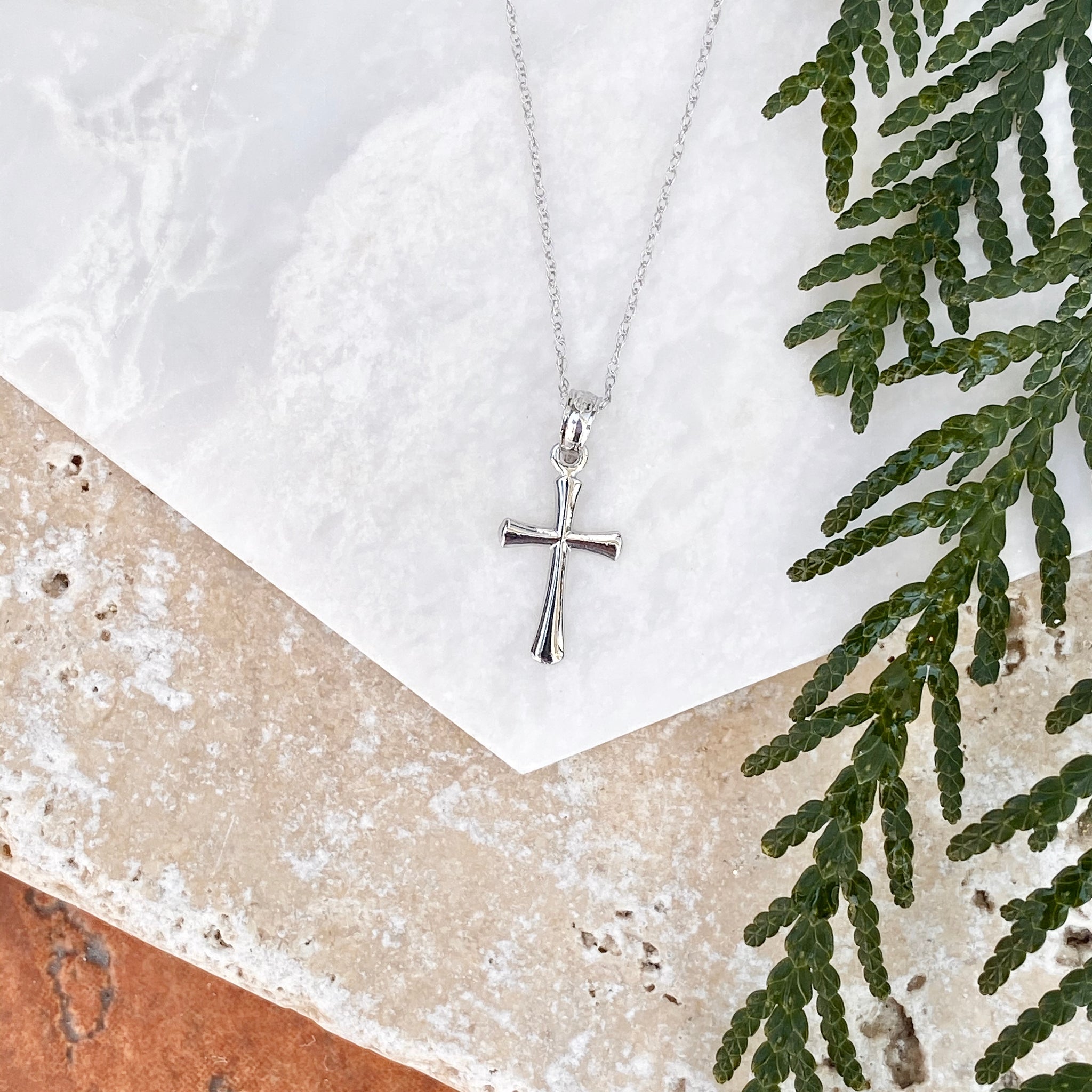 14KT white gold small beveled cross pendant on a thin, 14KT white gold cable chain necklace. Pretty + lightweight cross necklaces makes a beautiful everyday necklace!