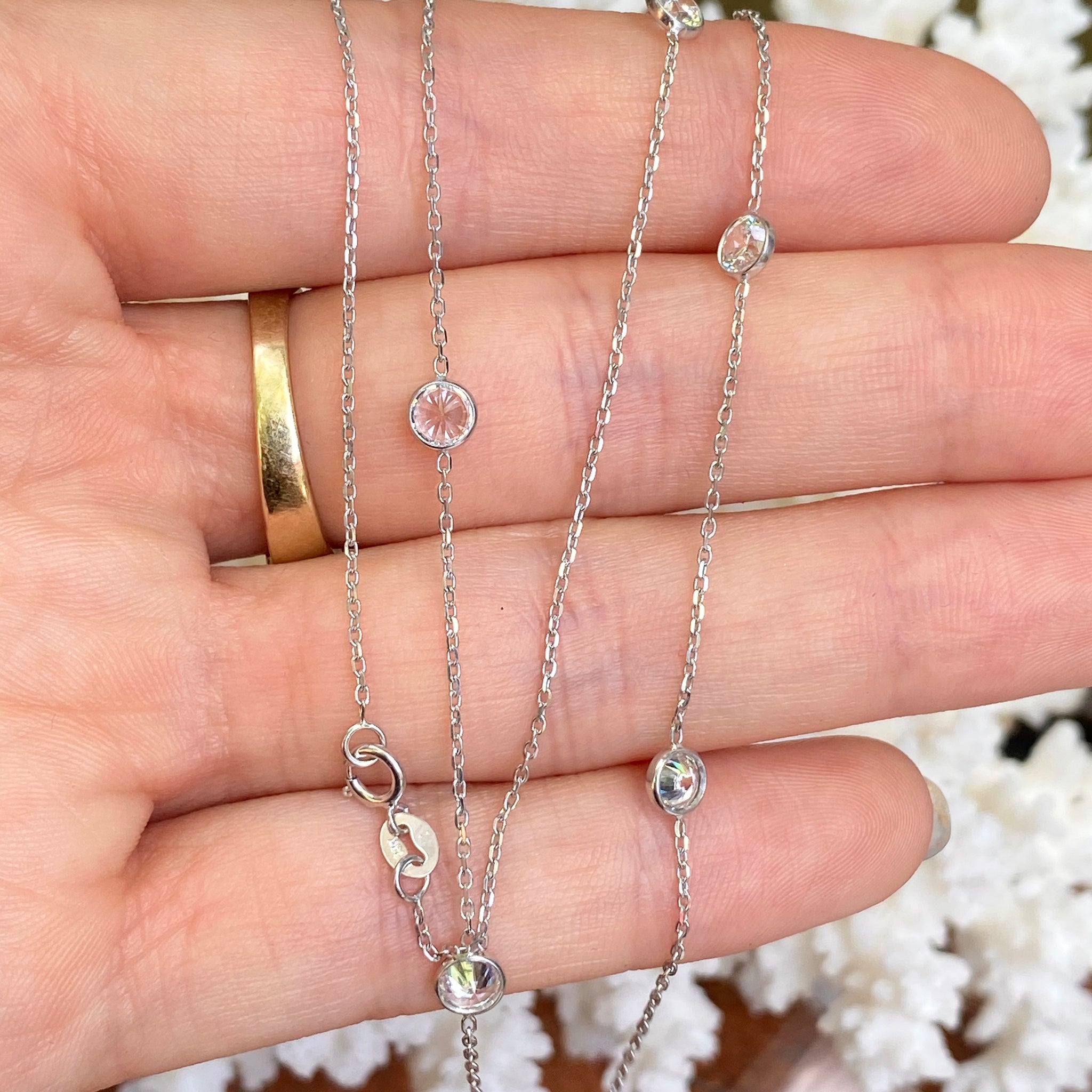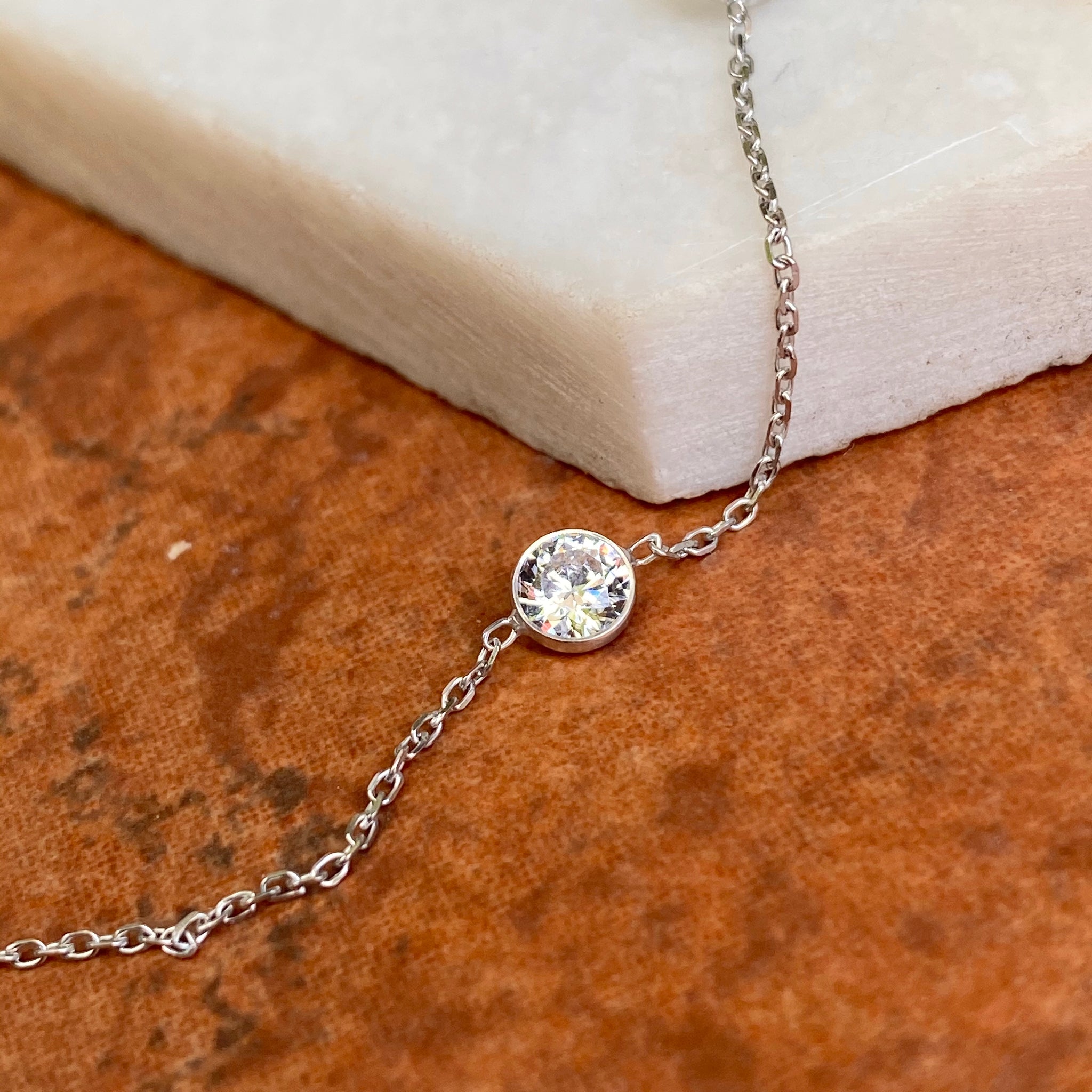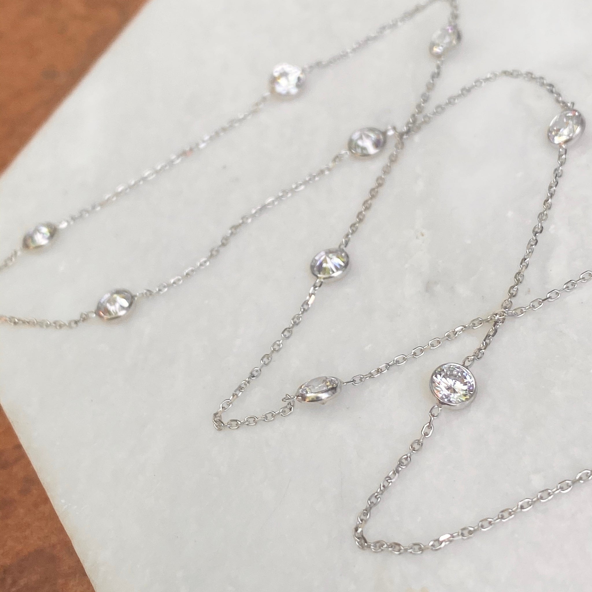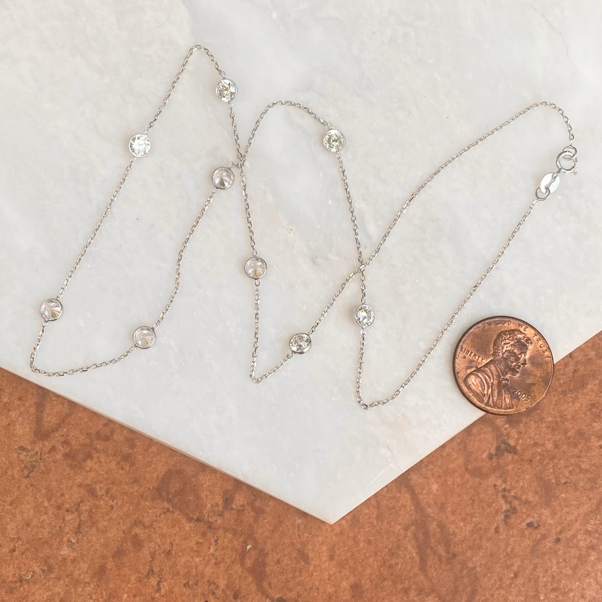 Polished 14KT white gold cable chain necklace with stationed, bezel-set cubic zirconia stones. Beautiful, sparkling chain is perfect for special events including weddings, prom, etc.