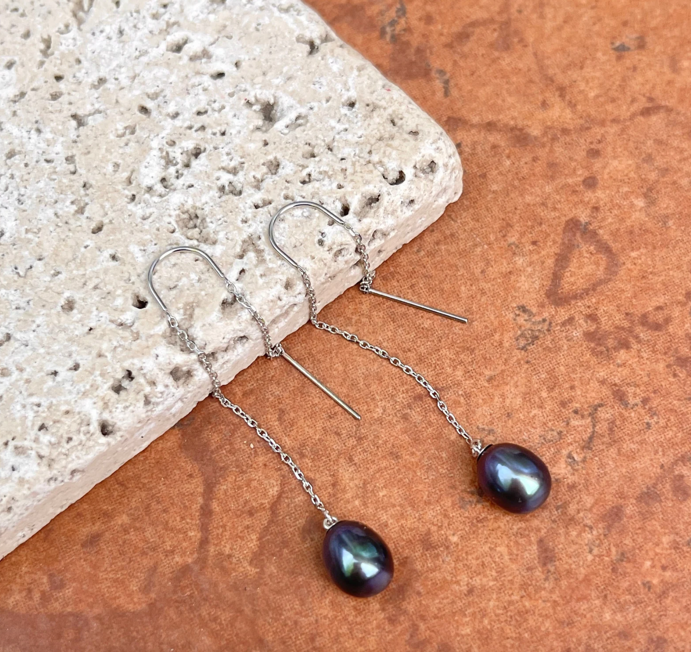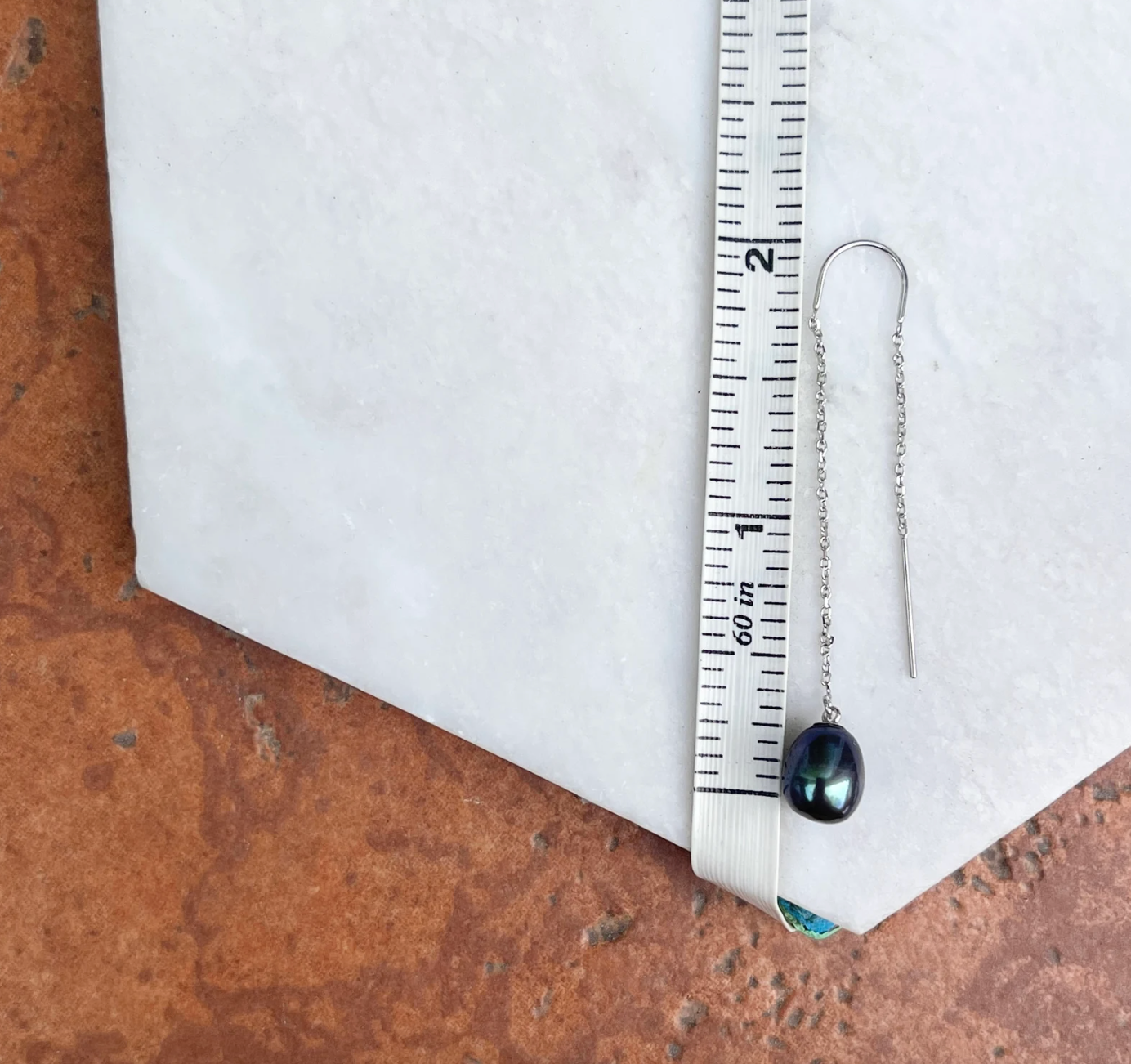 14KT White Gold Black Freshwater Pearl Chain Threader Earrings