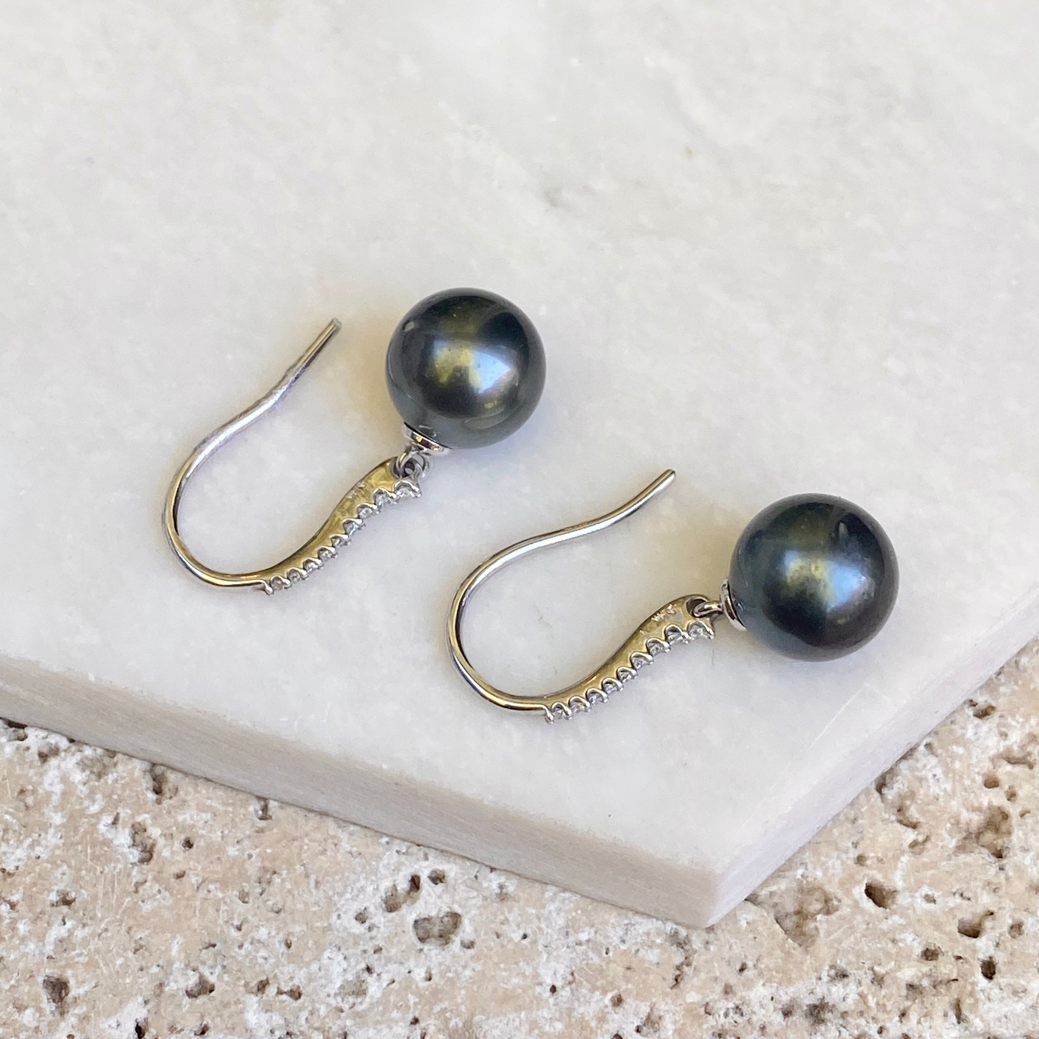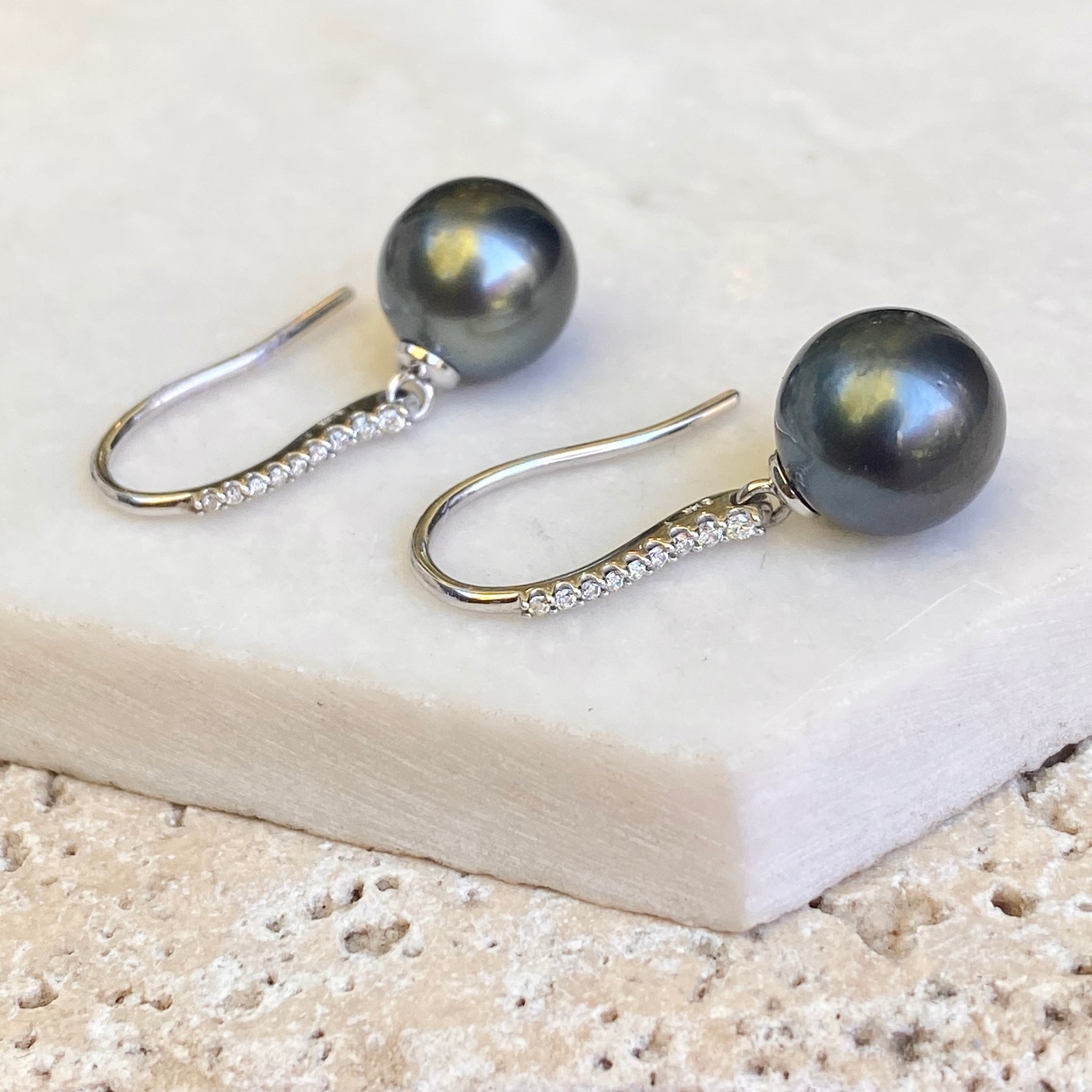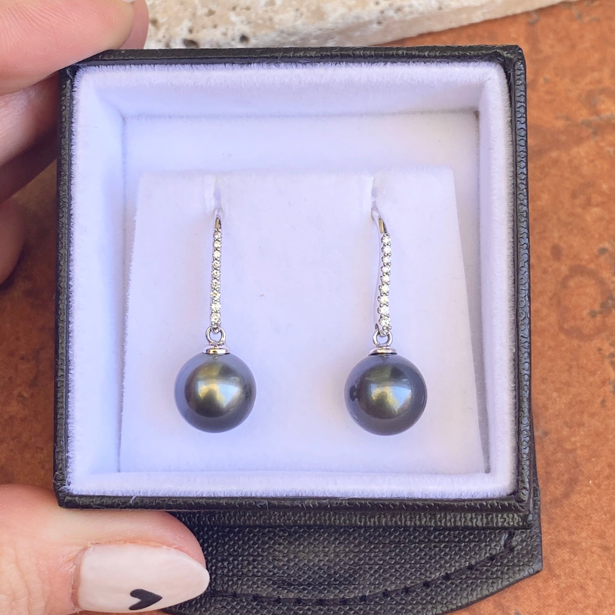 14KT white gold + black Tahitian cultured pearl pave diamond dangle earrings. Classic and elegant gold ball post with pearl dangle.