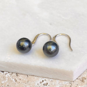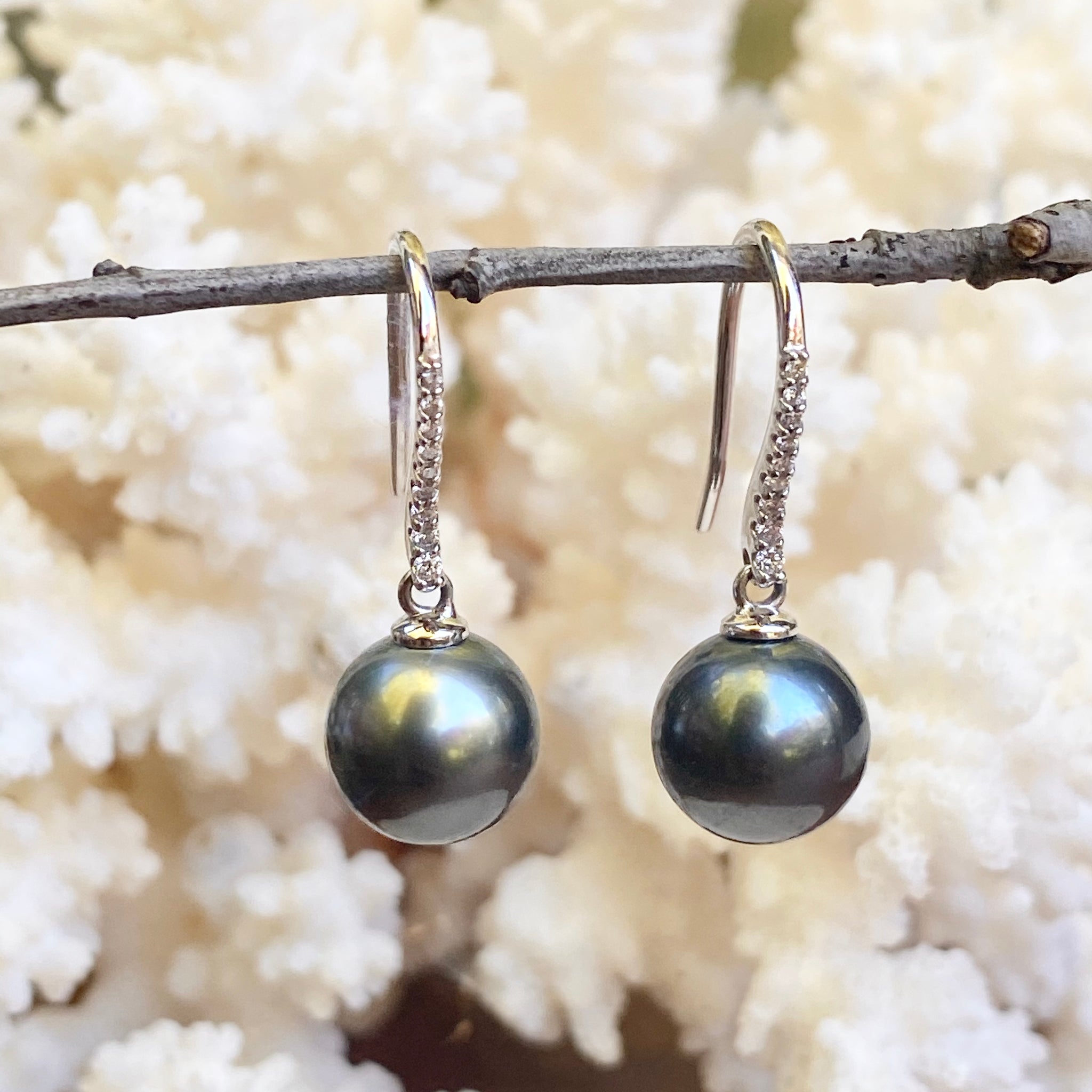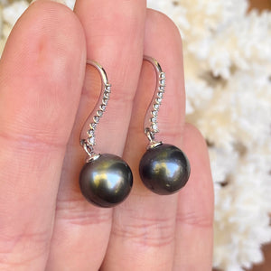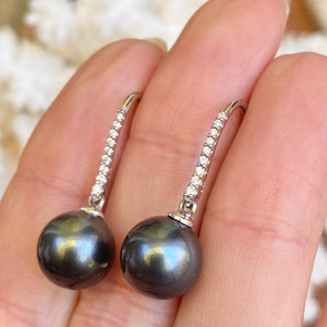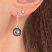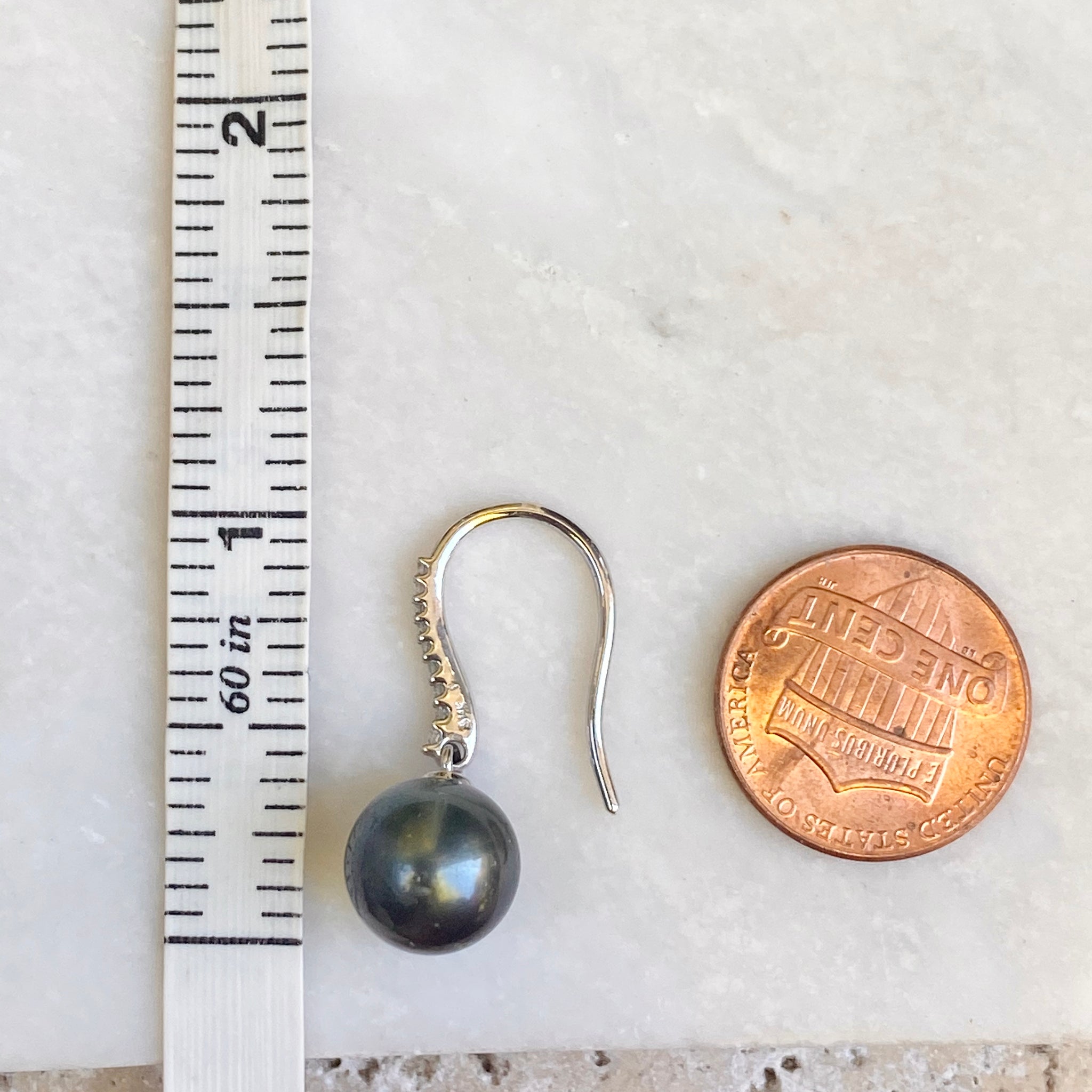 14KT white gold + black Tahitian cultured pearl pave diamond dangle earrings. Classic and elegant gold ball post with pearl dangle.