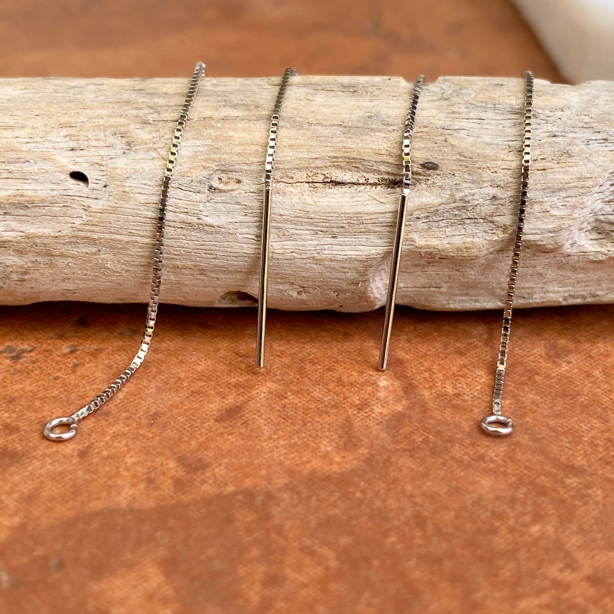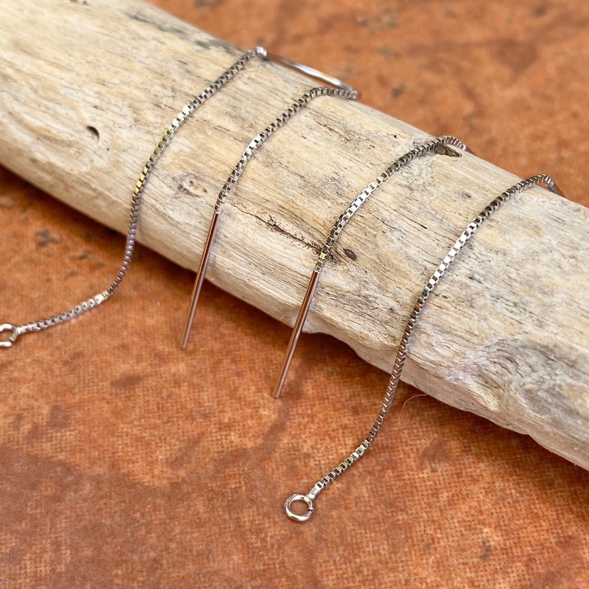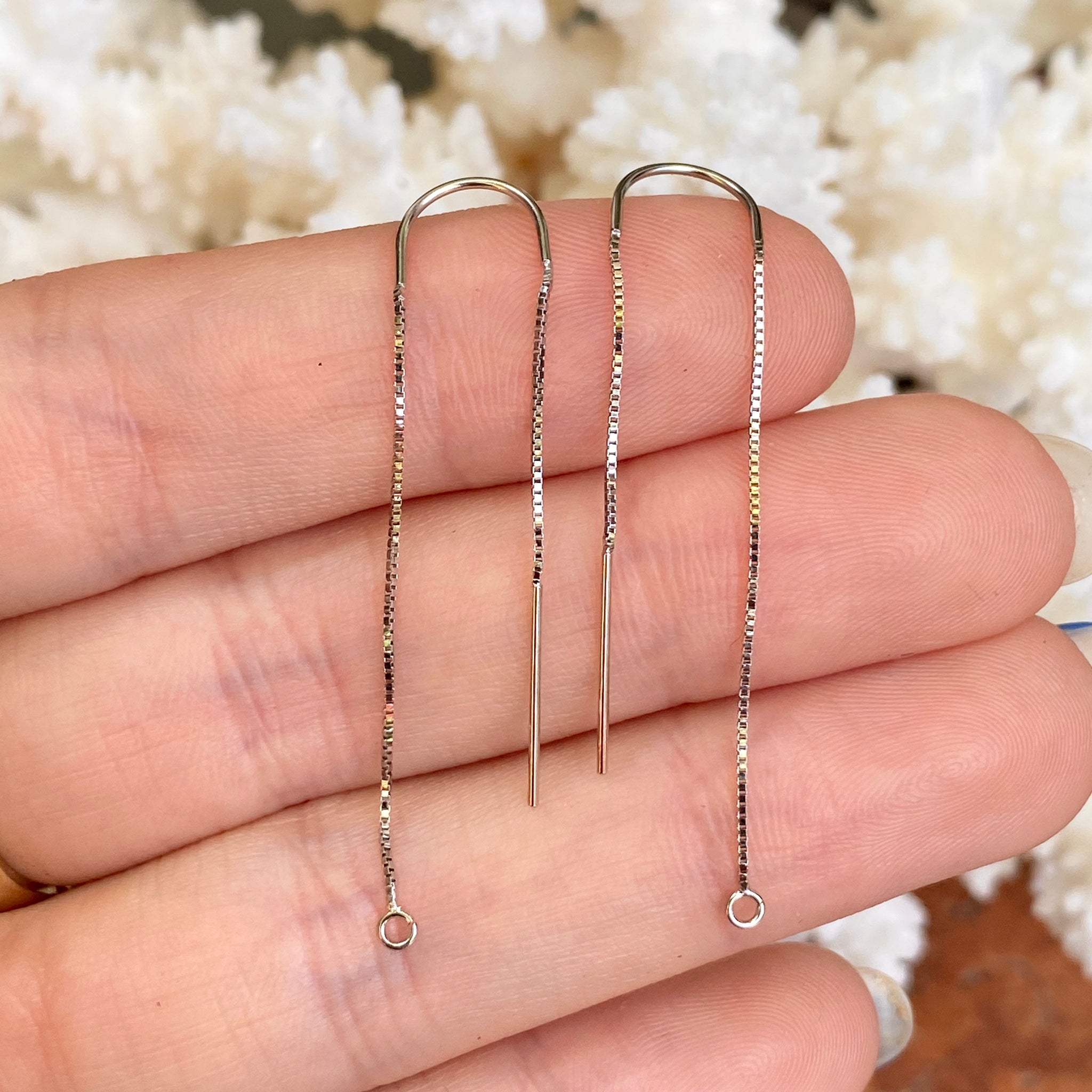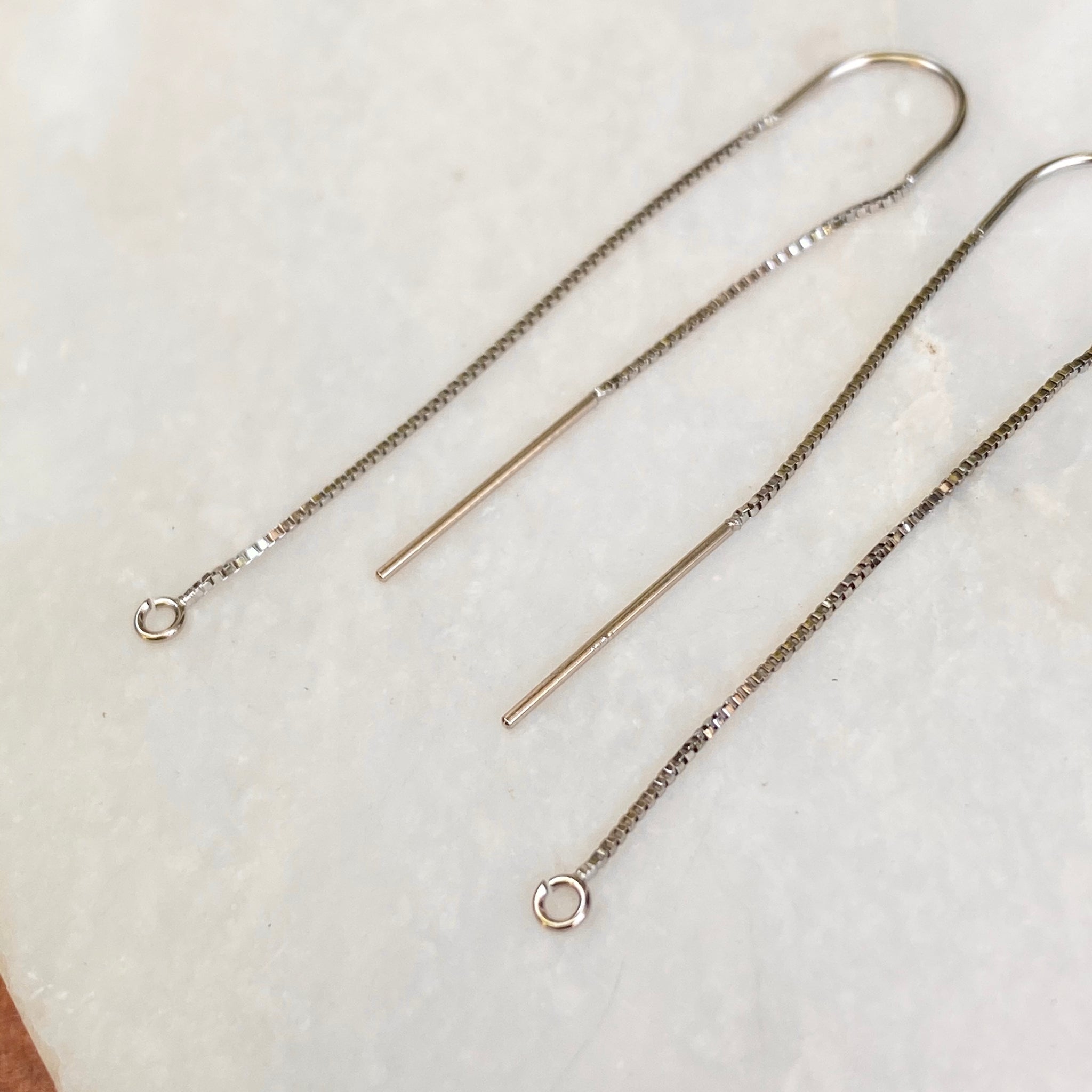 14KT white gold box chain threader ear wires with open ring on one end. Open ring is perfect for adding on your own earring charms!
