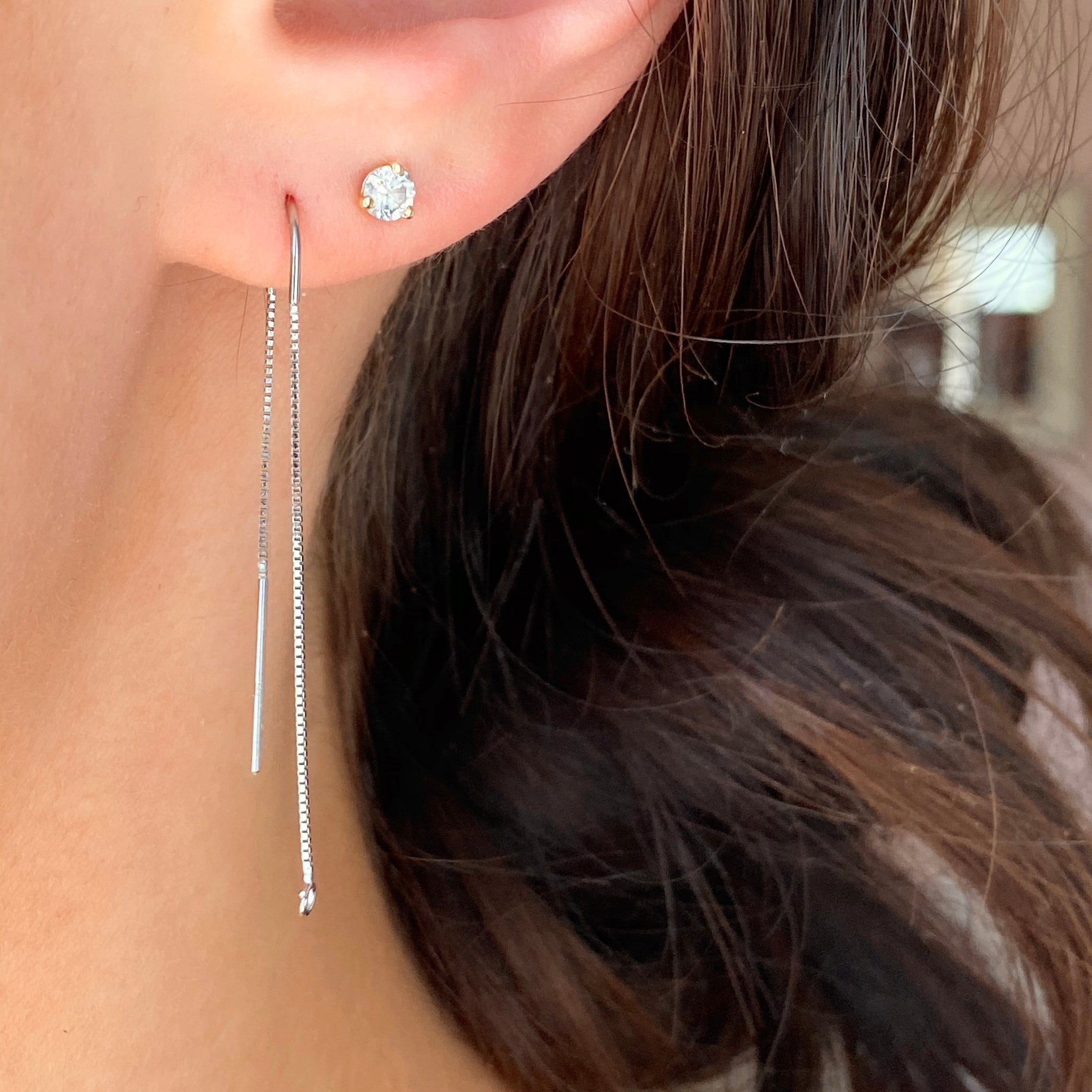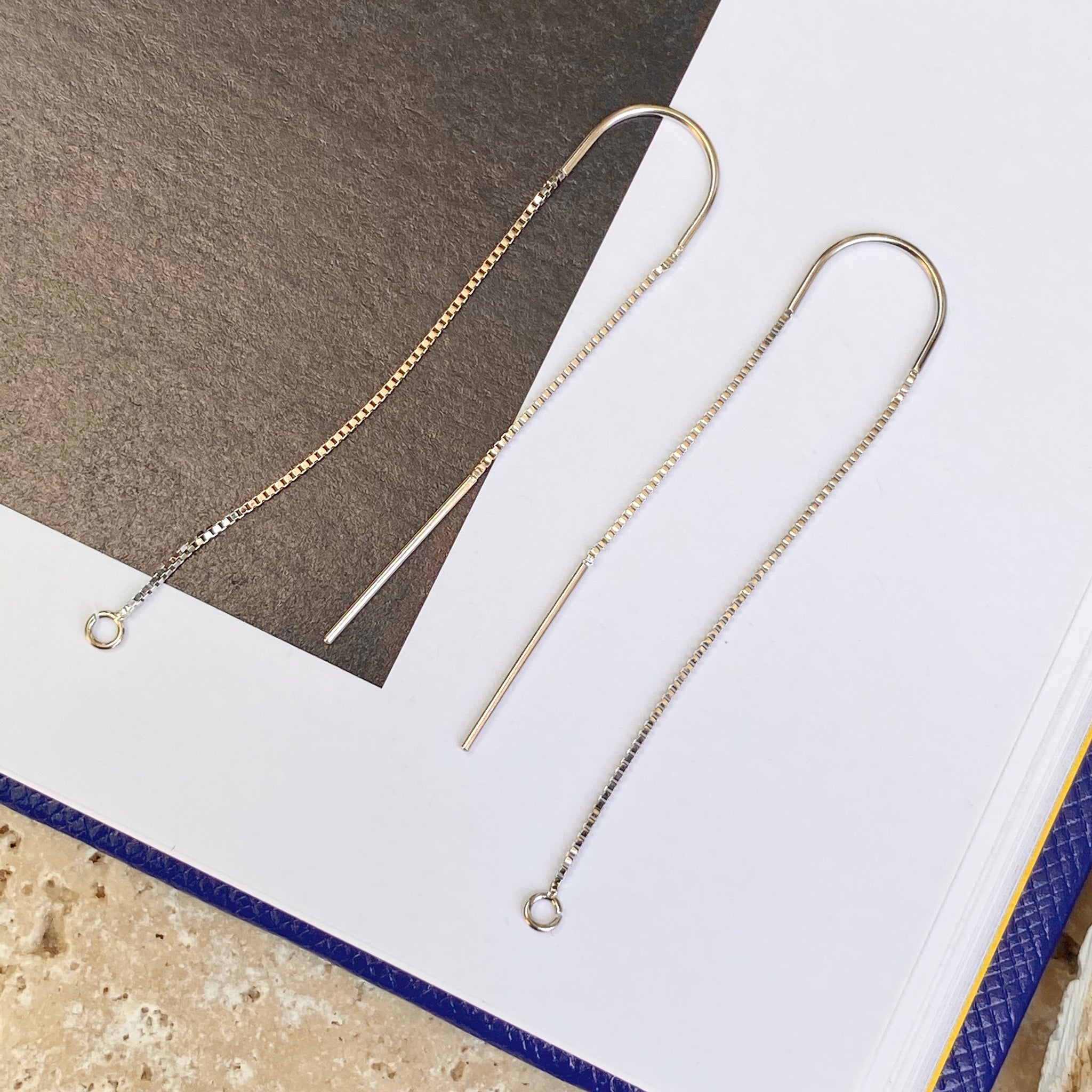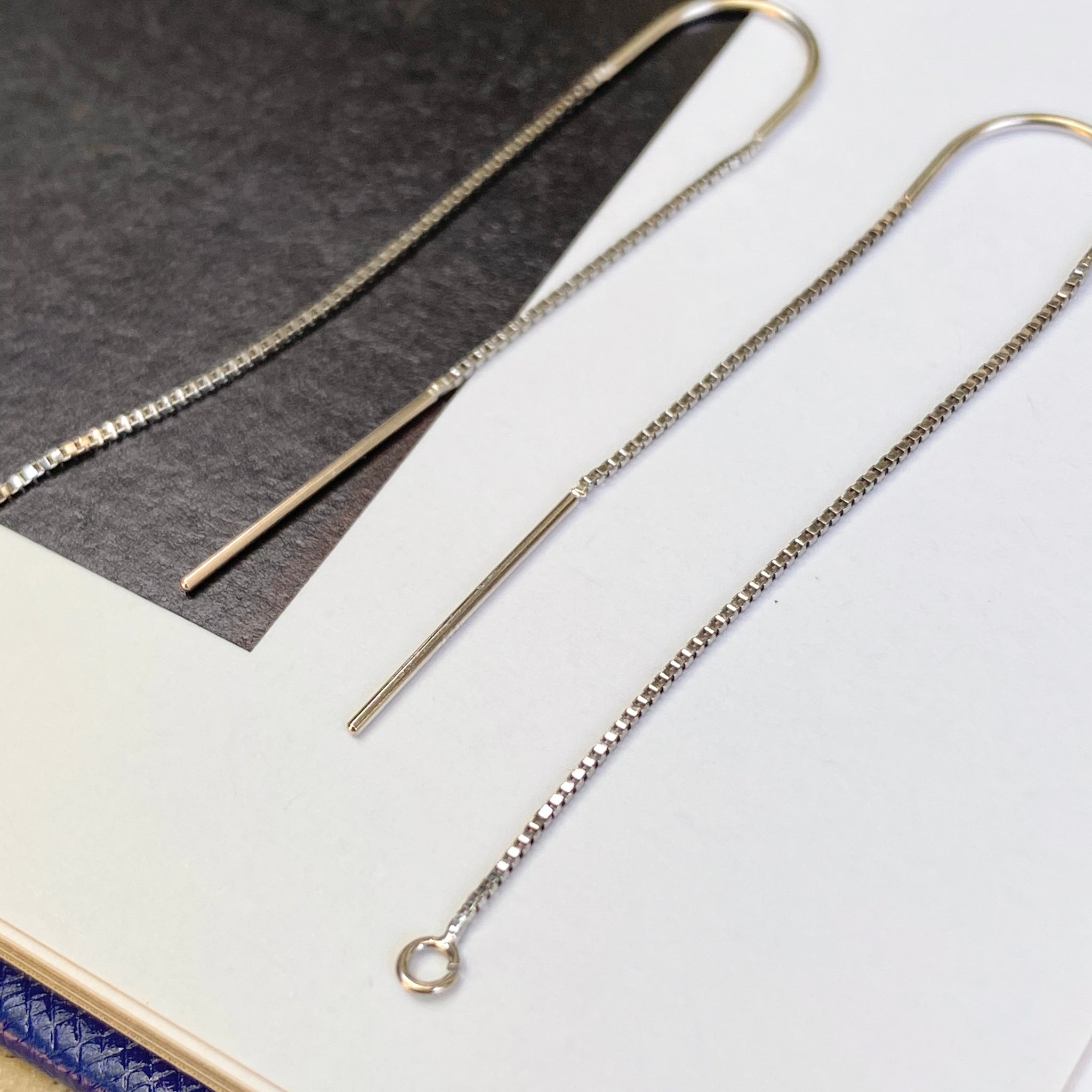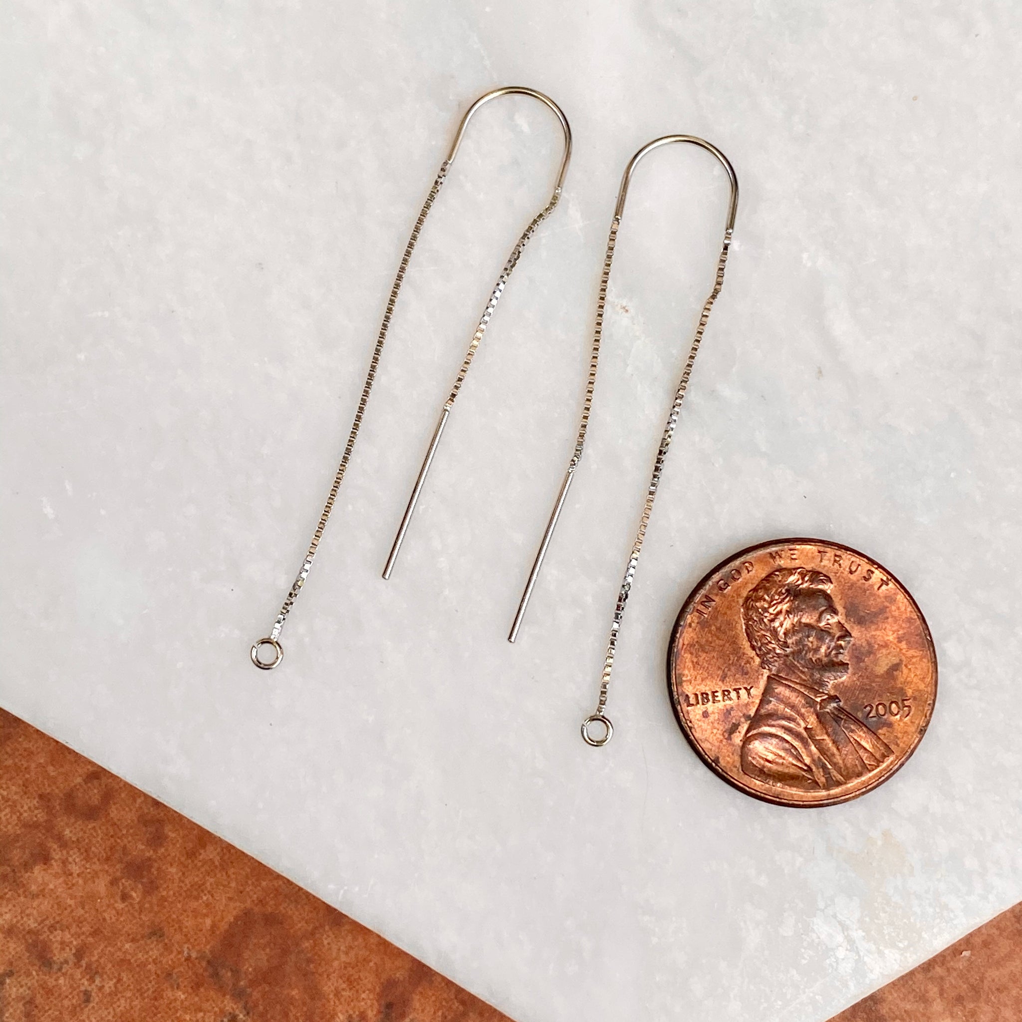 14KT white gold box chain threader ear wires with open ring on one end. Open ring is perfect for adding on your own earring charms!